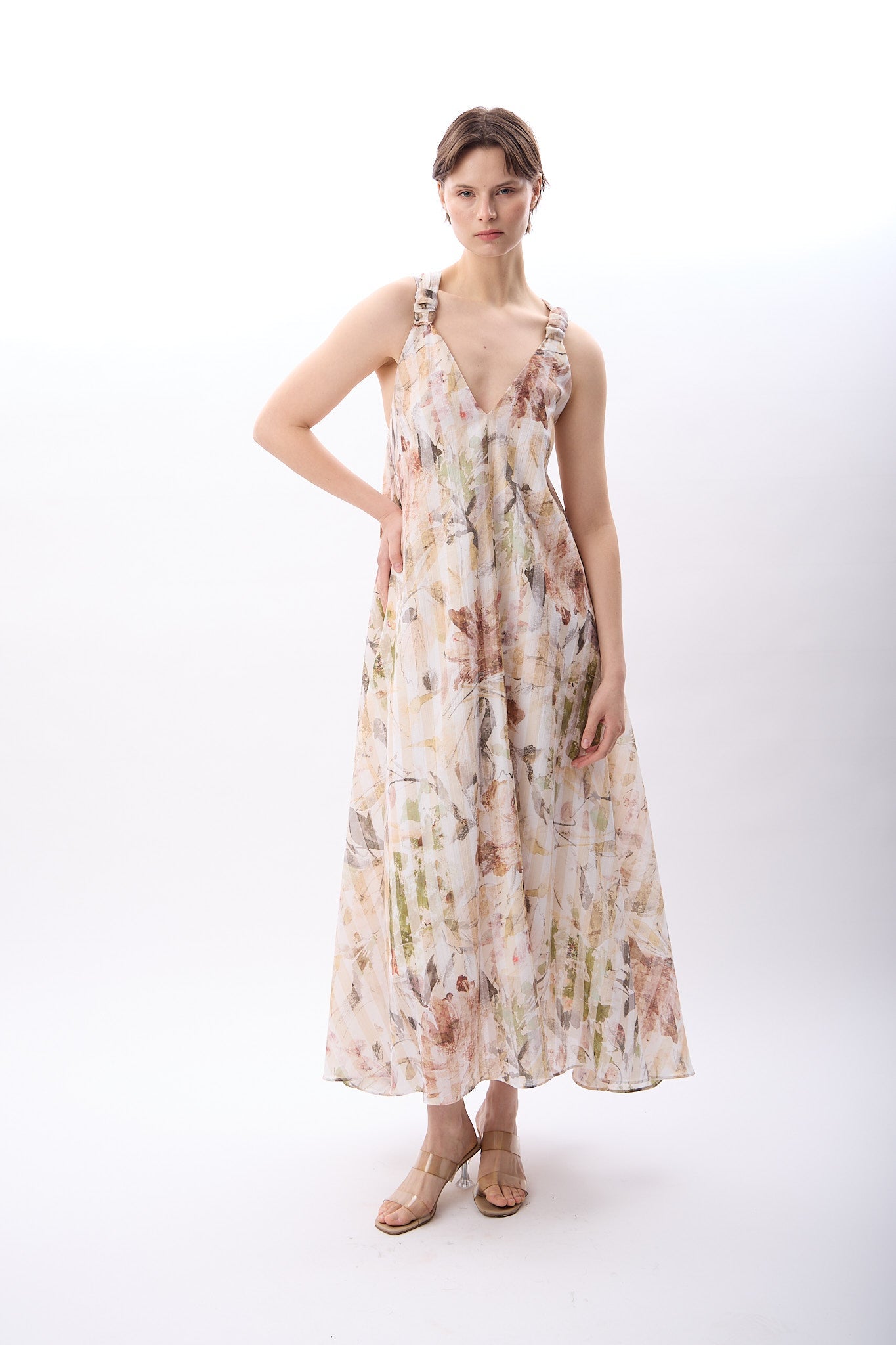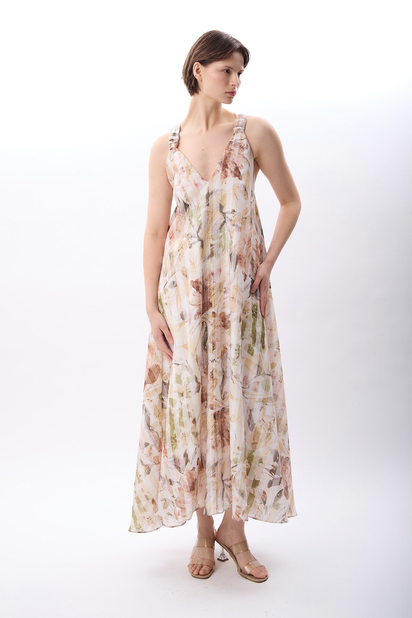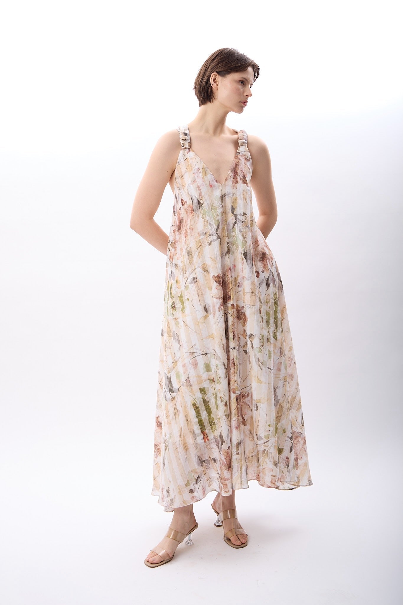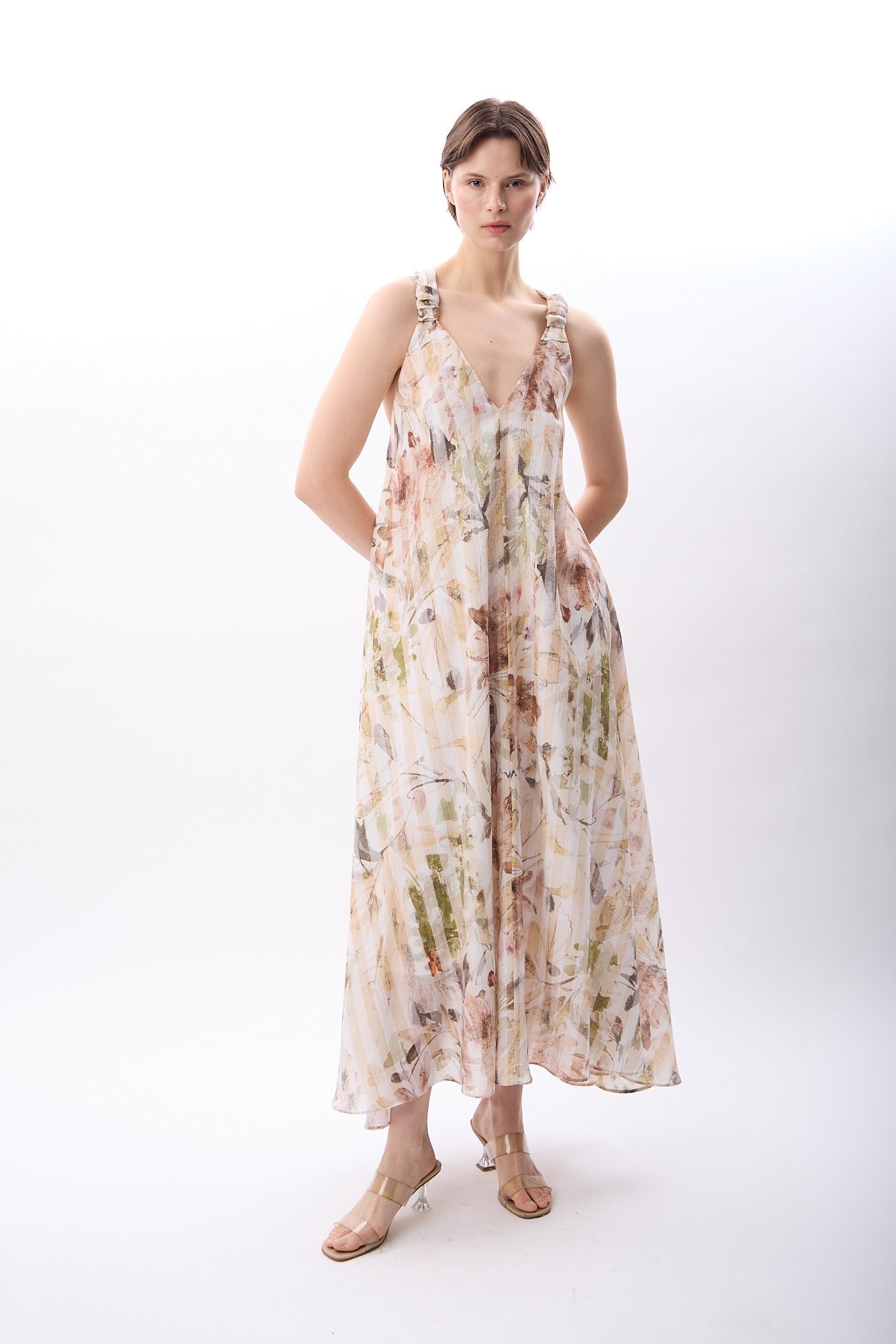 Desenli ve Dökümlü Maxi Elbise (Bej)