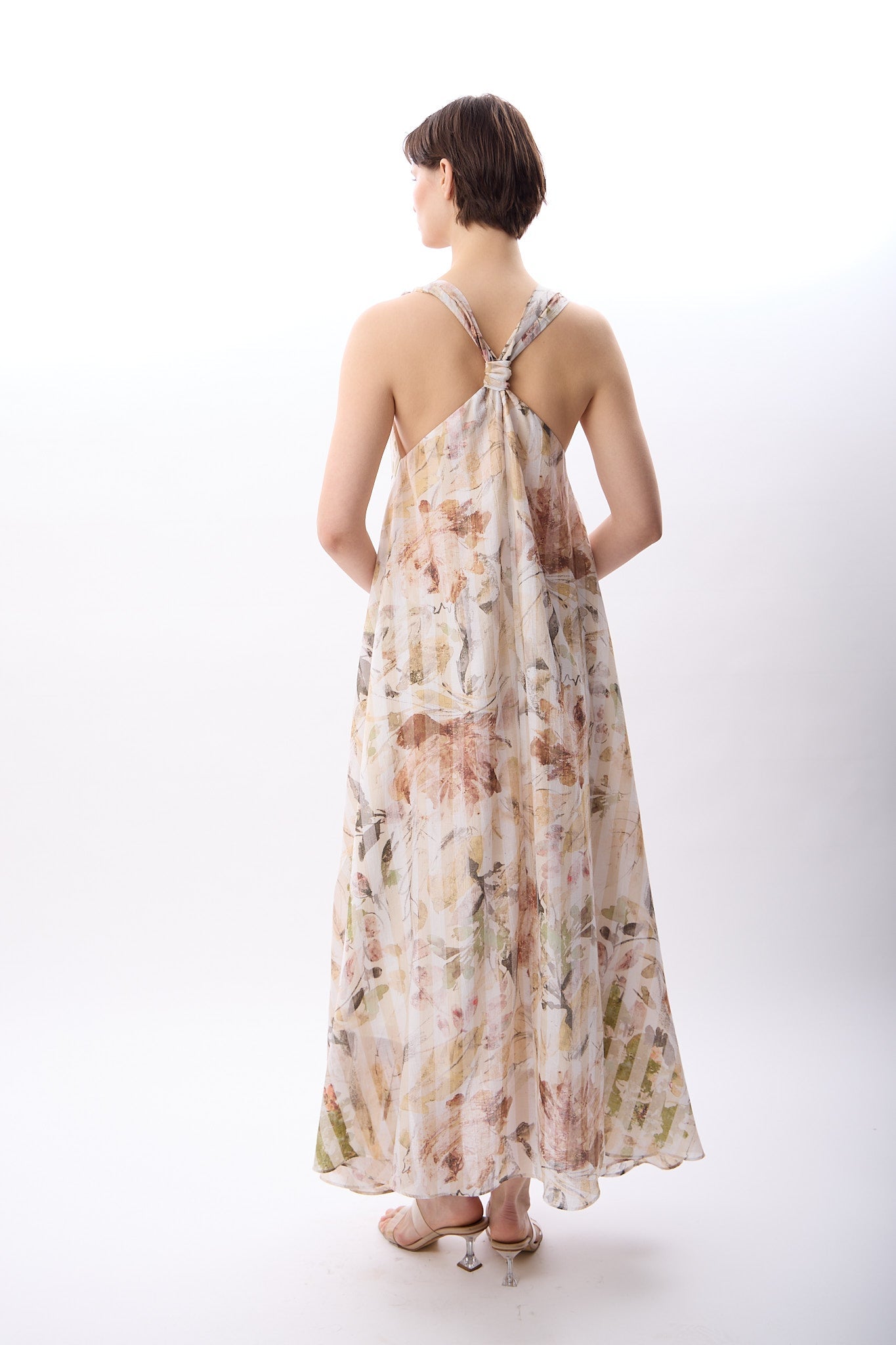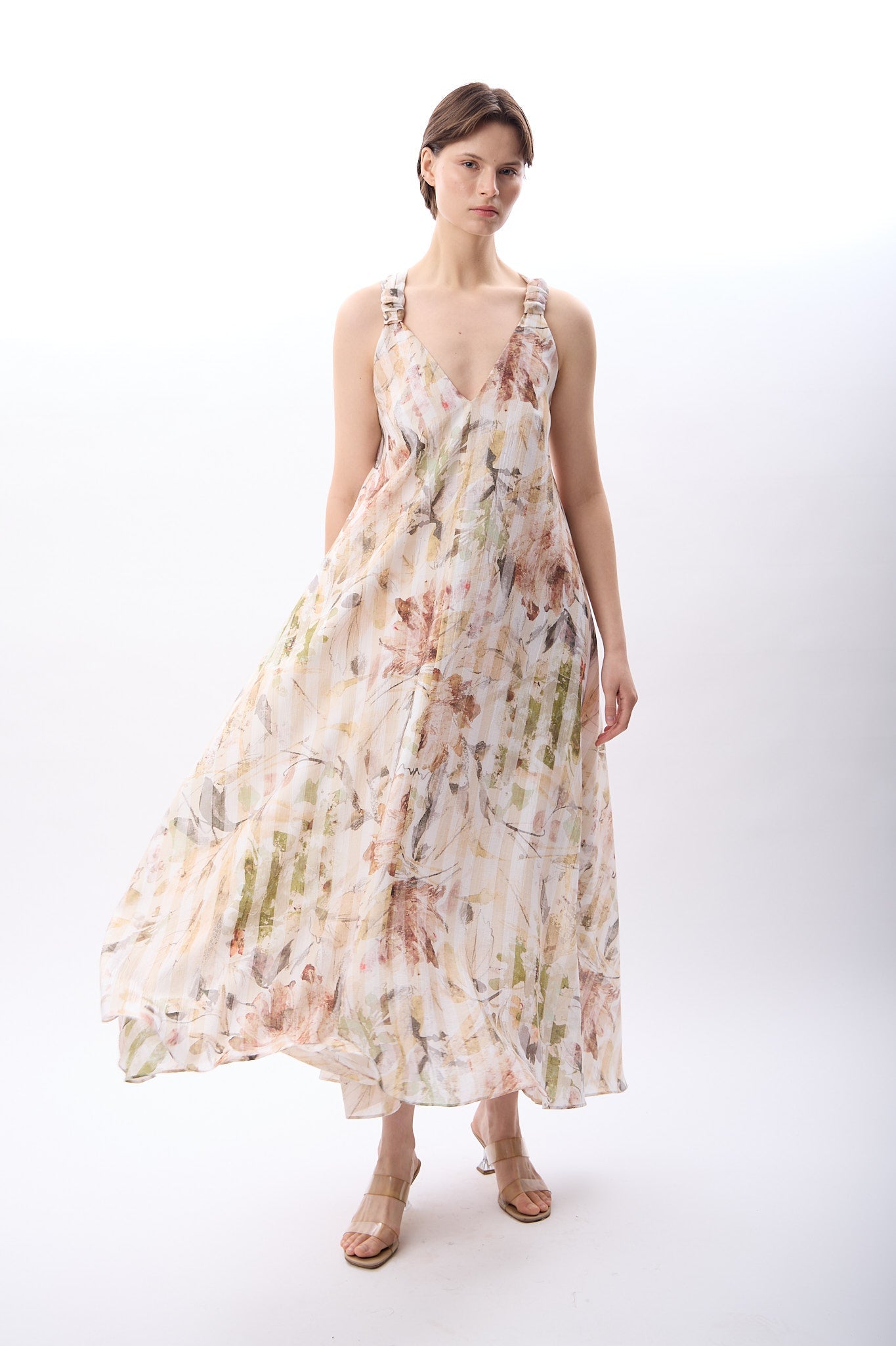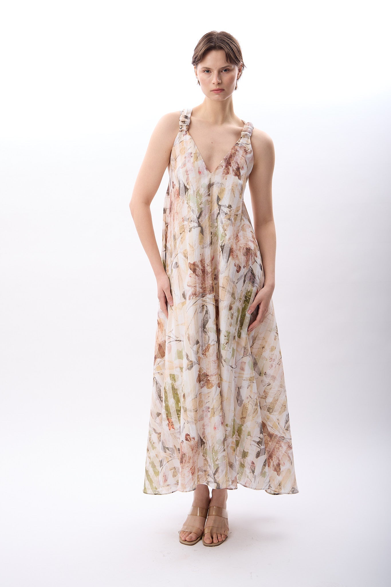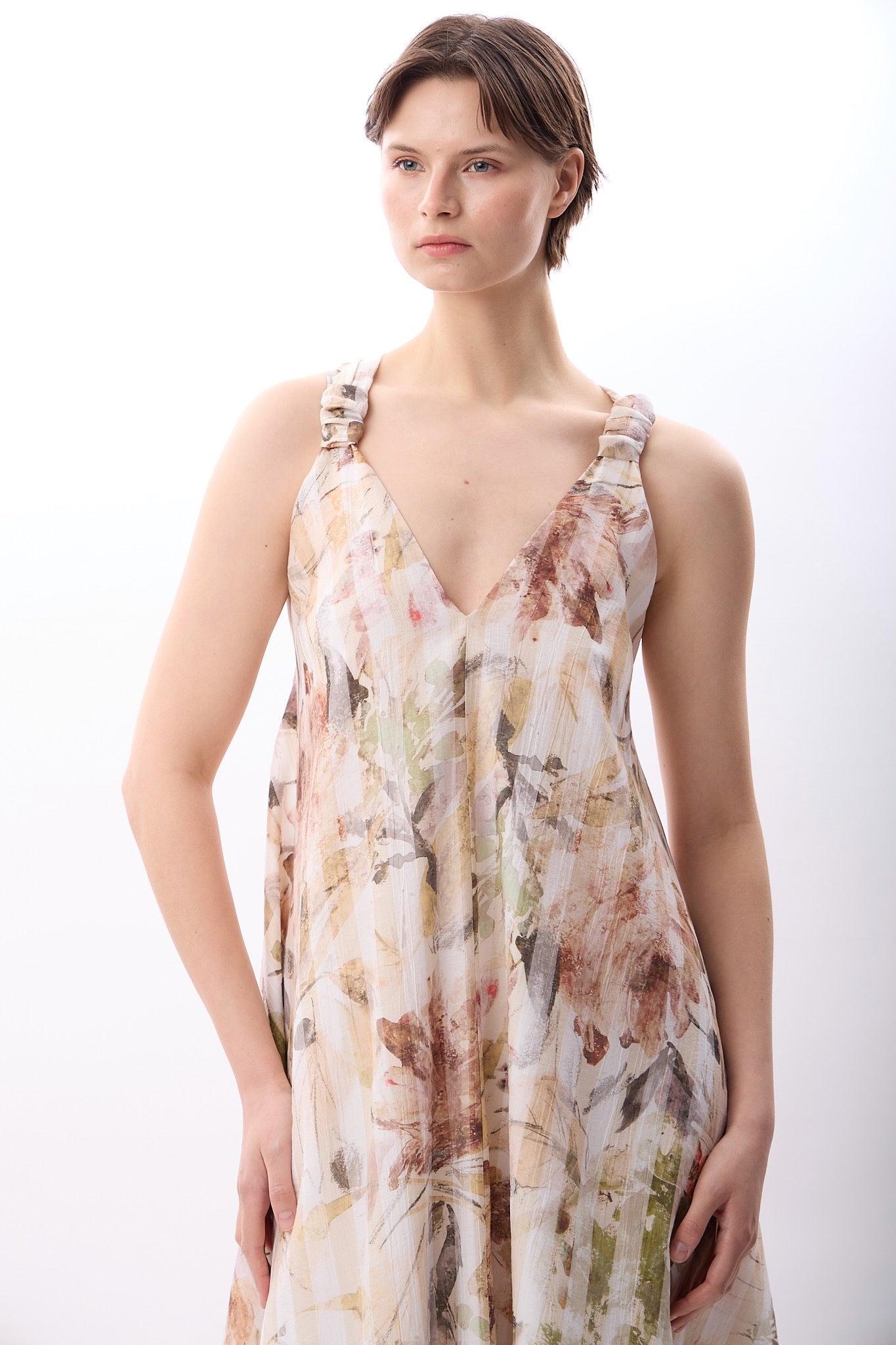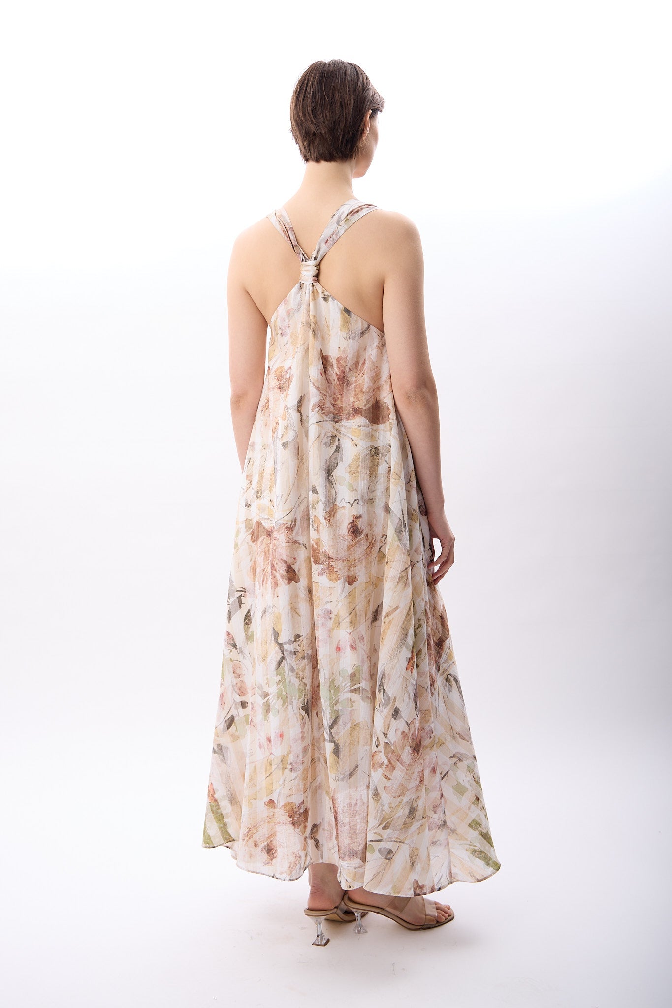 Desenli ve Dökümlü Maxi Elbise (Bej)