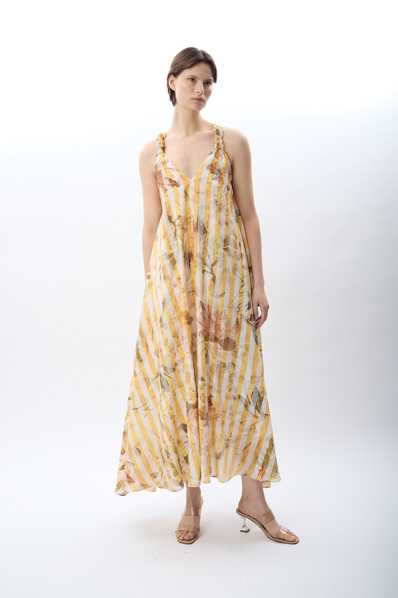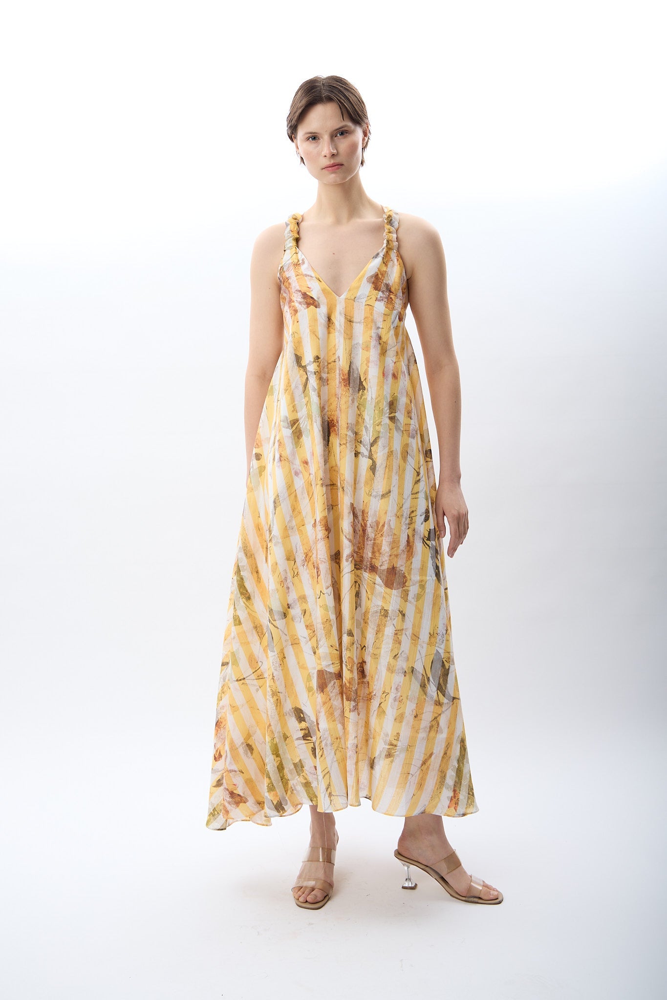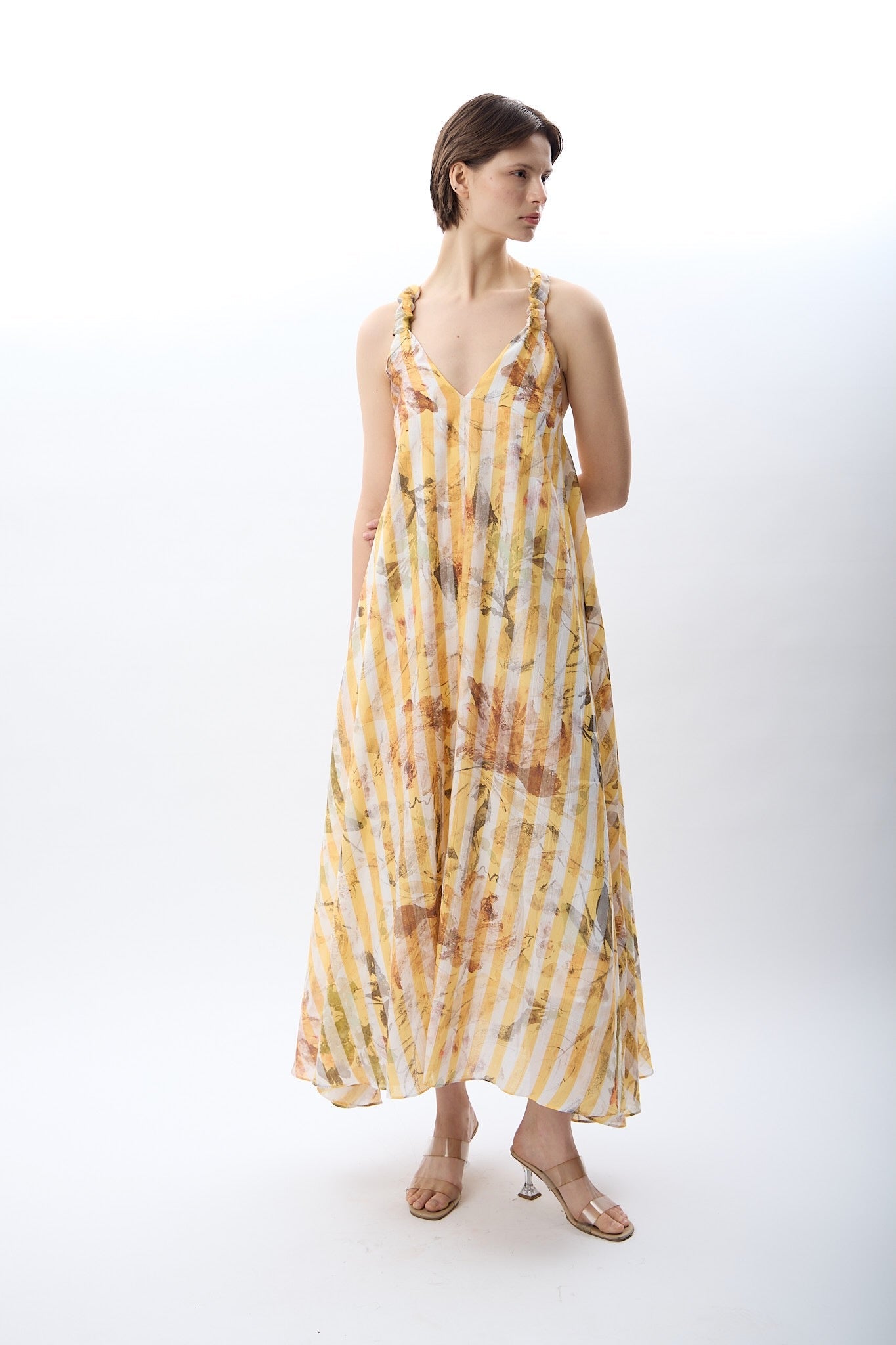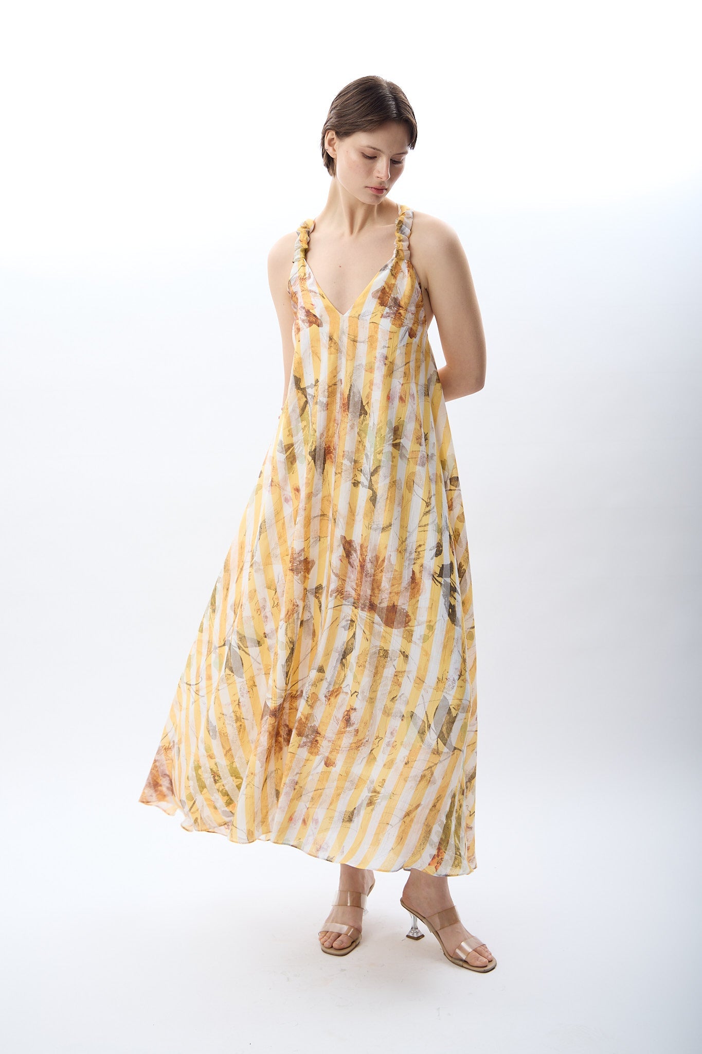 Desenli ve Dökümlü Maxi Elbise (Sarı)
