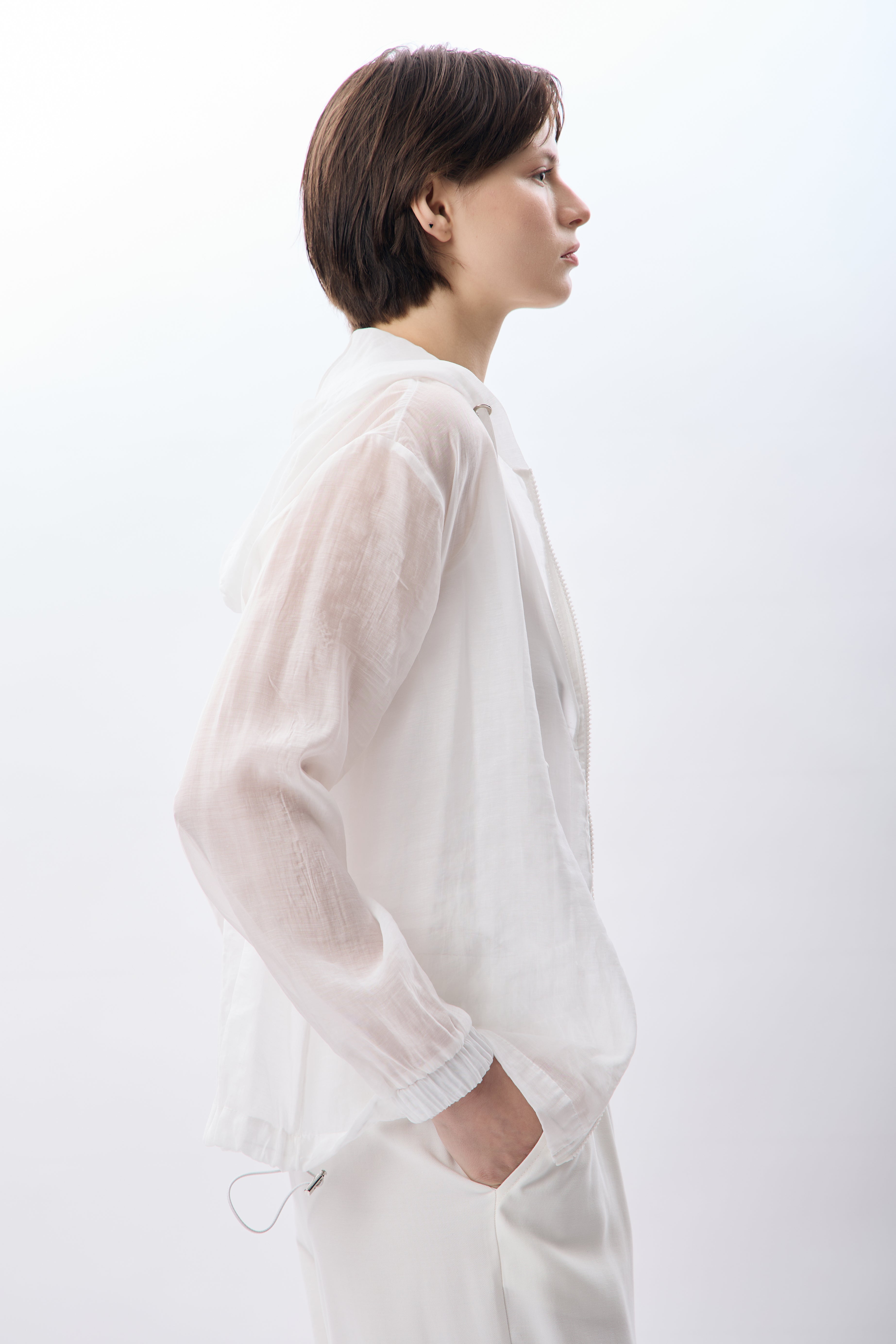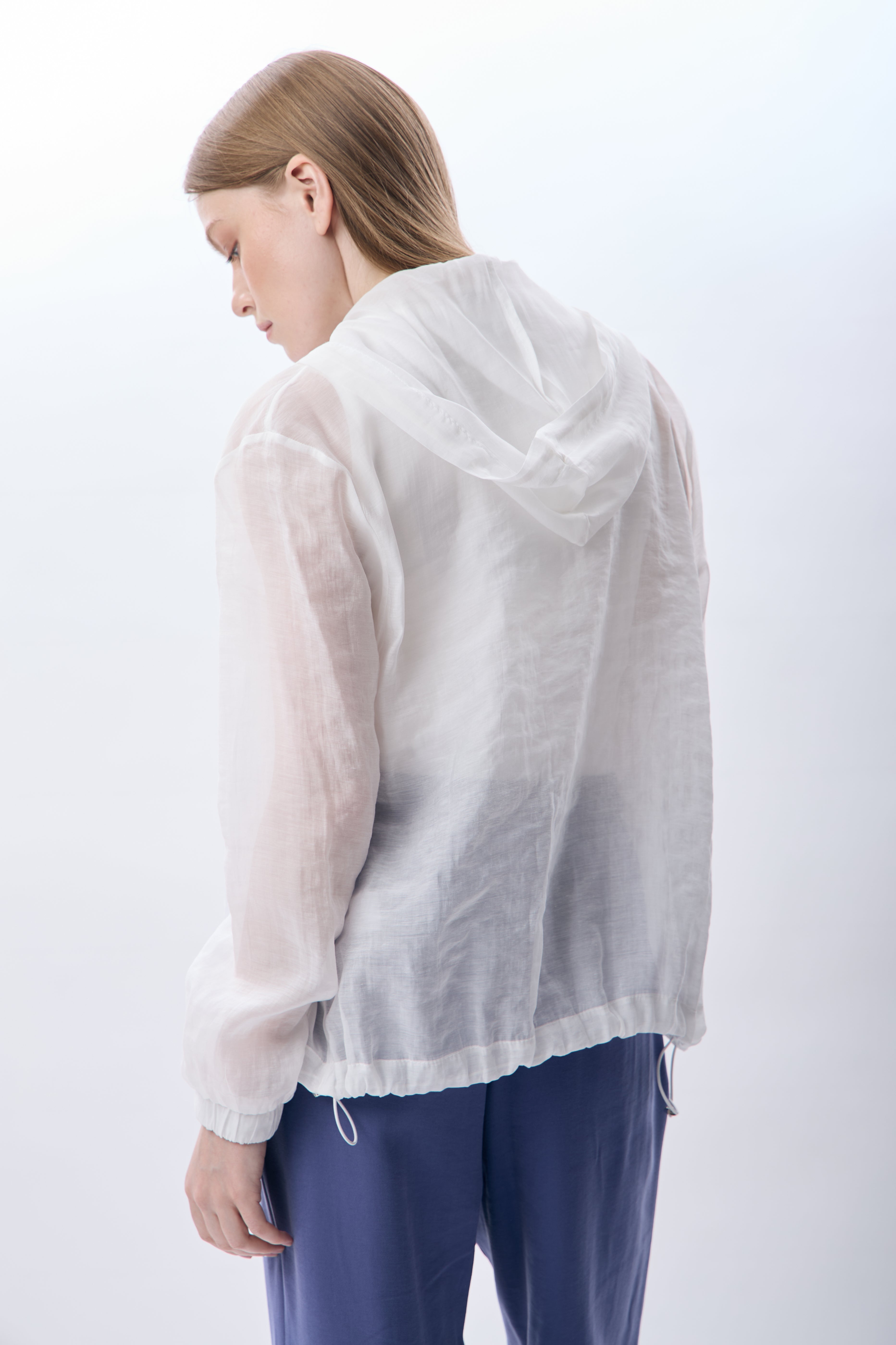 Model: Kapüşon yaka, uzun kol, önden fermuarlı, fermuarlı yan cepler, etek ucu büzgü tünelli