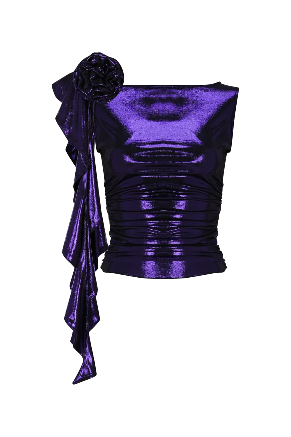 Jarse kumaş üzerine uygulanan ışıltılı varak baskısıyla öne çıkan bu şık üst, modern ve feminen bir görünüm sunar. Sağ omzundaki çiçek detayı ve volanlı şerit tasarımı, parçada romantik ve zarif bir dokunuş yaratır.