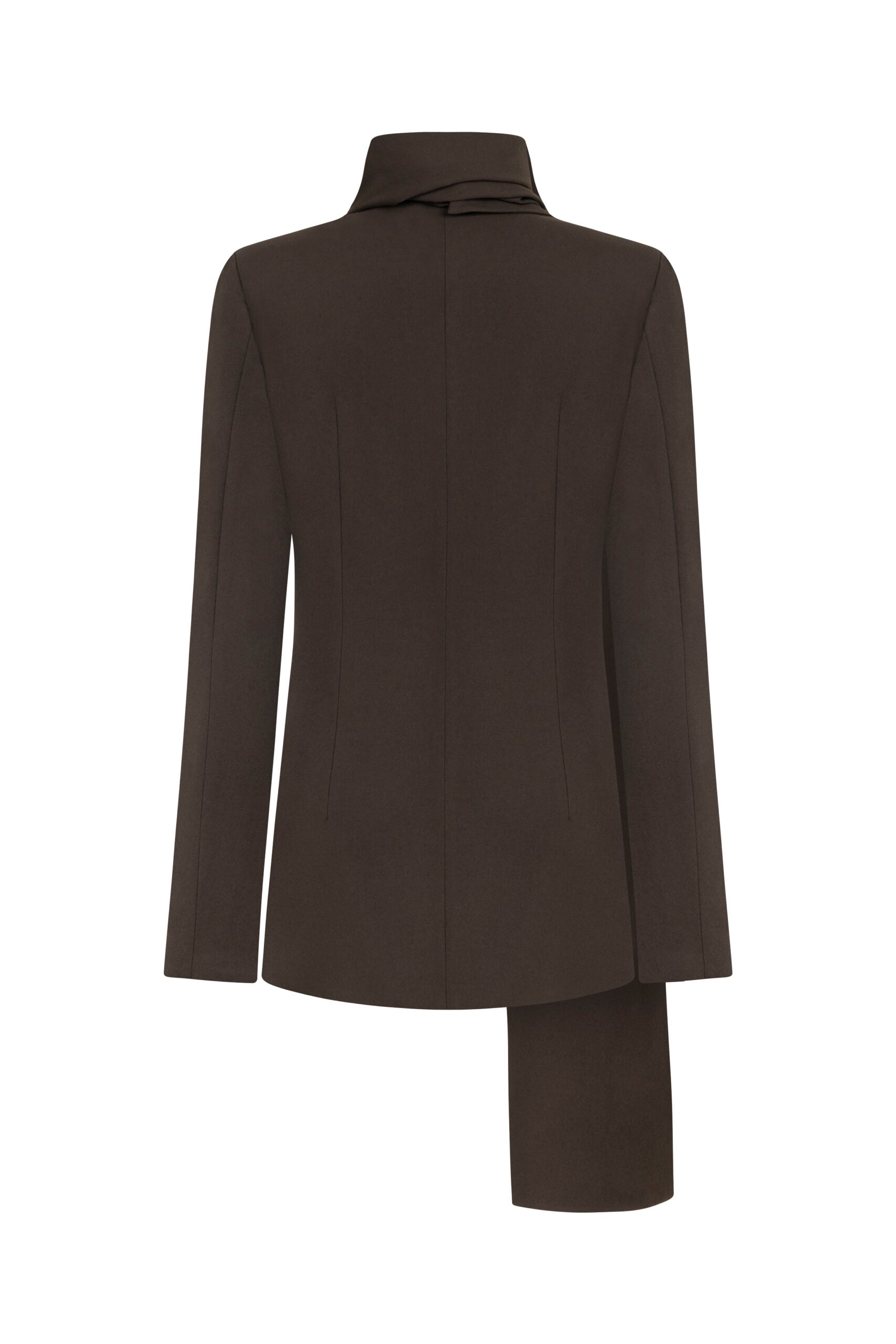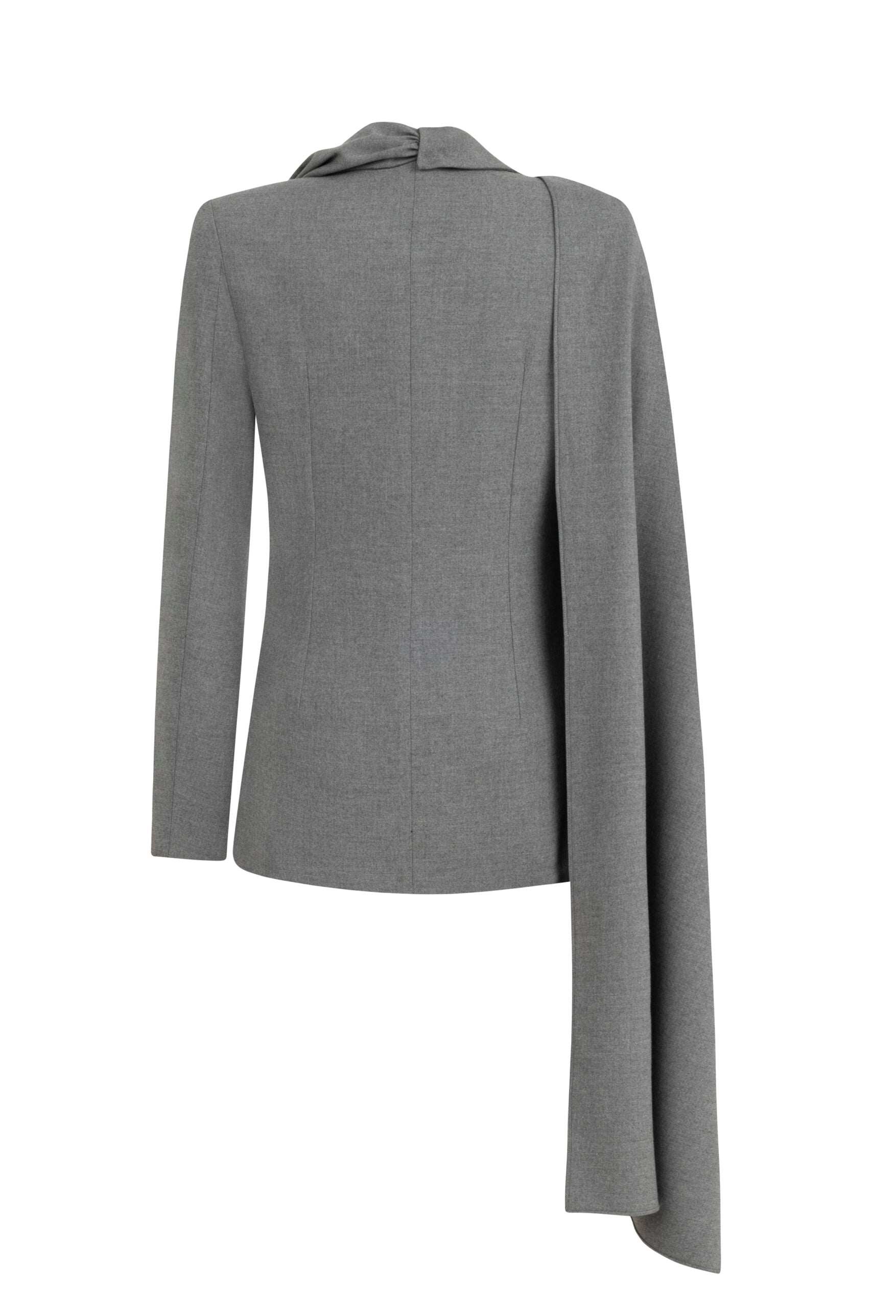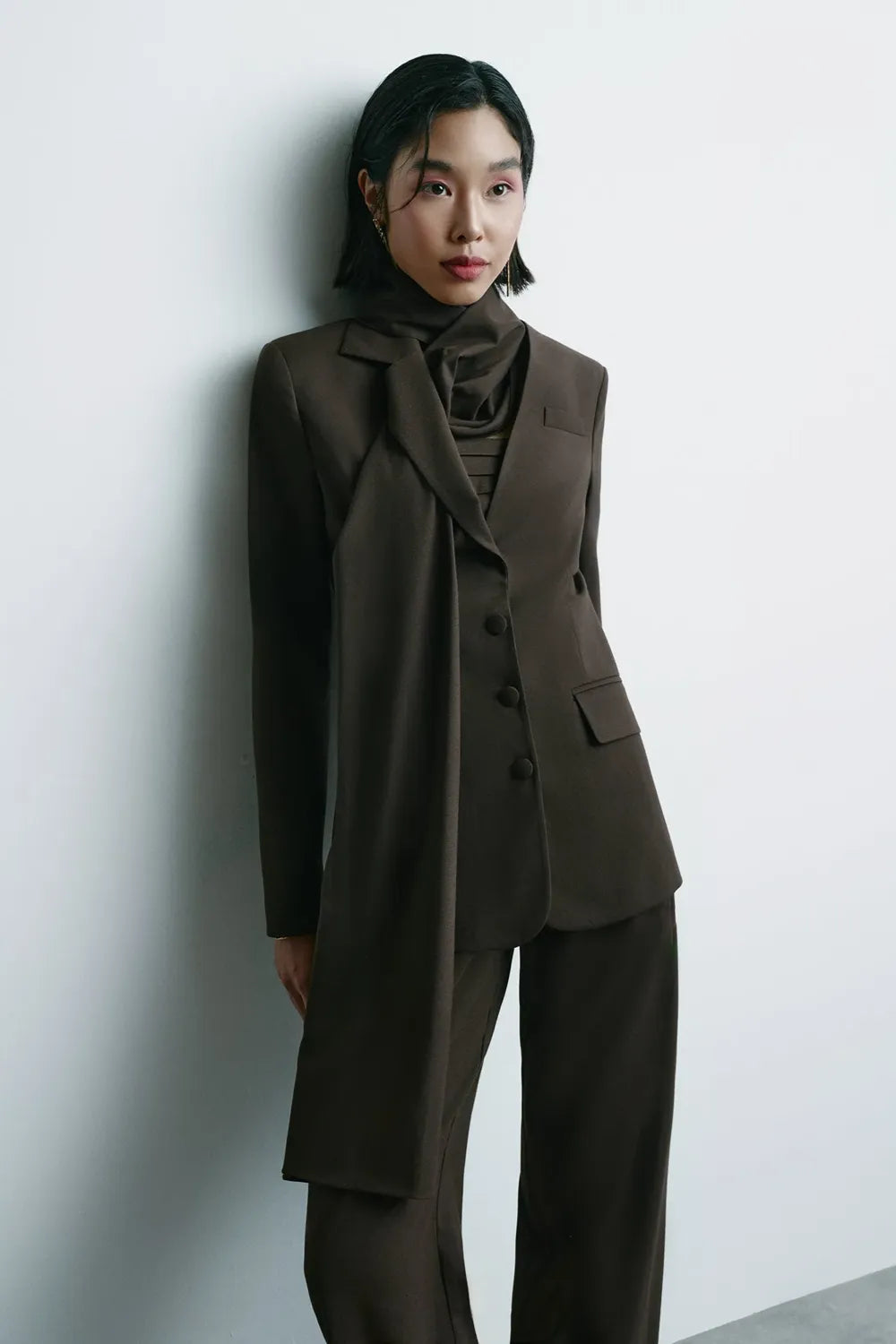 Şallı blazer ceket Kumaş düğme kapama Çıkarılabilir boyun şalı Kapak cep detaylı Modern ve zarif tasarım