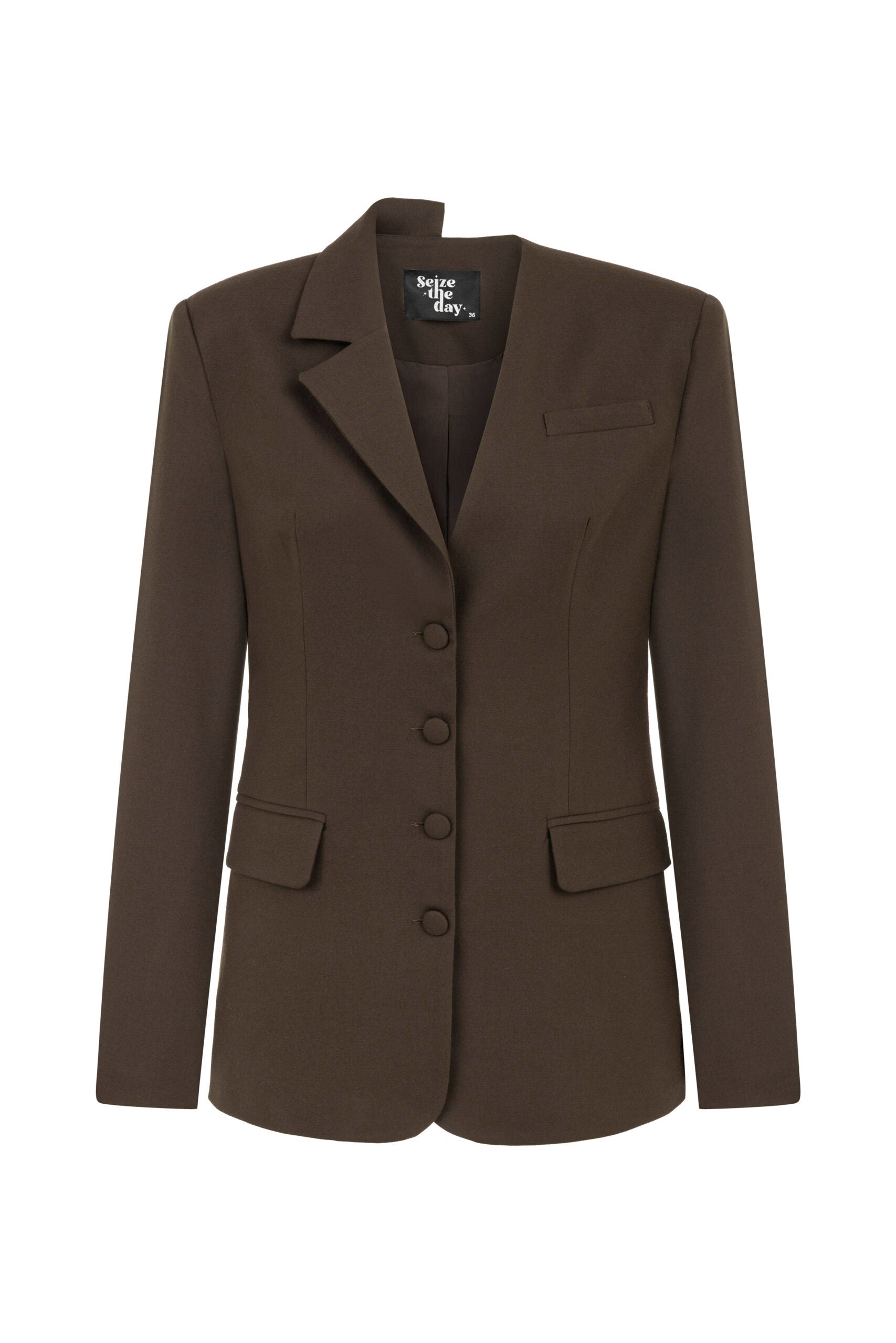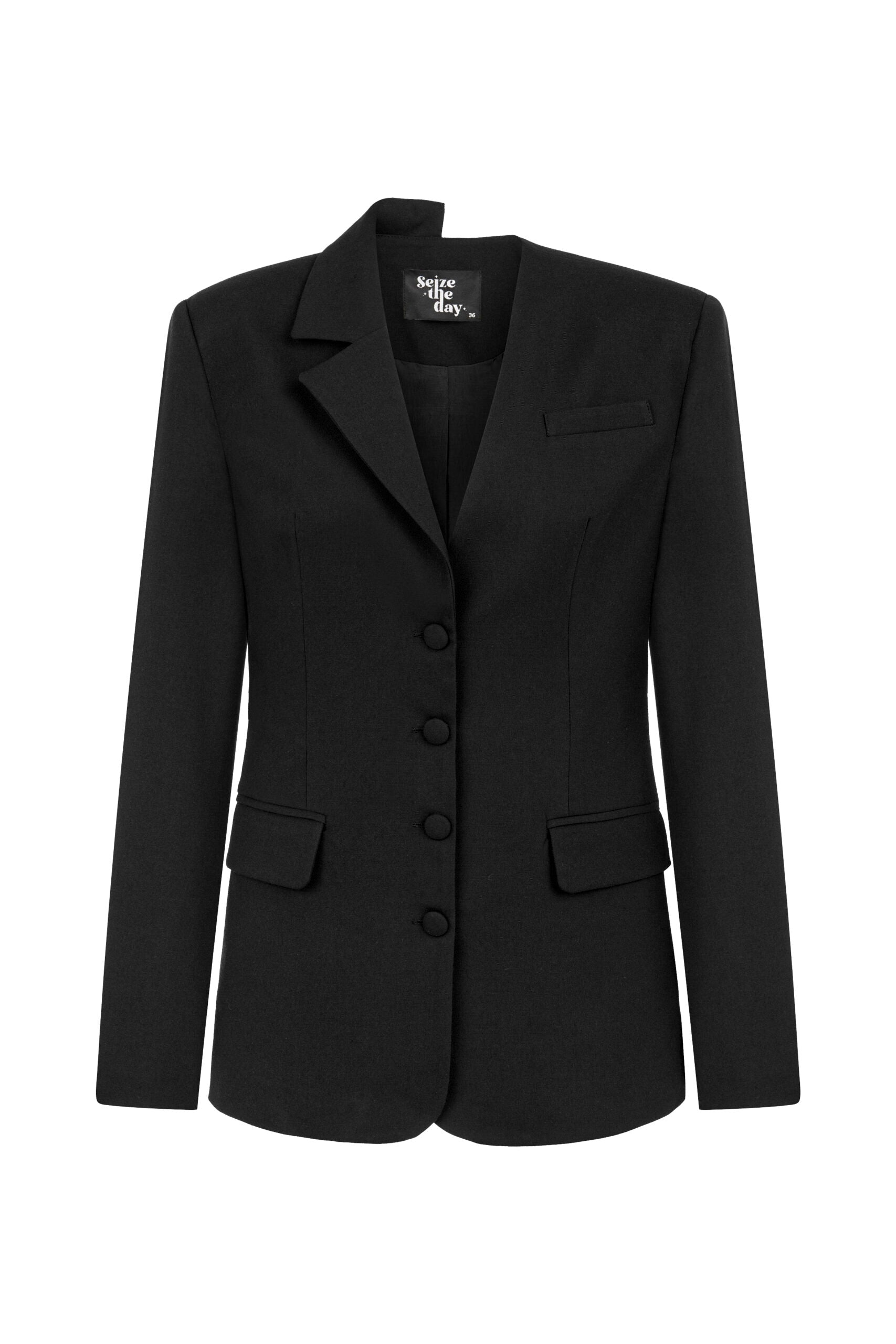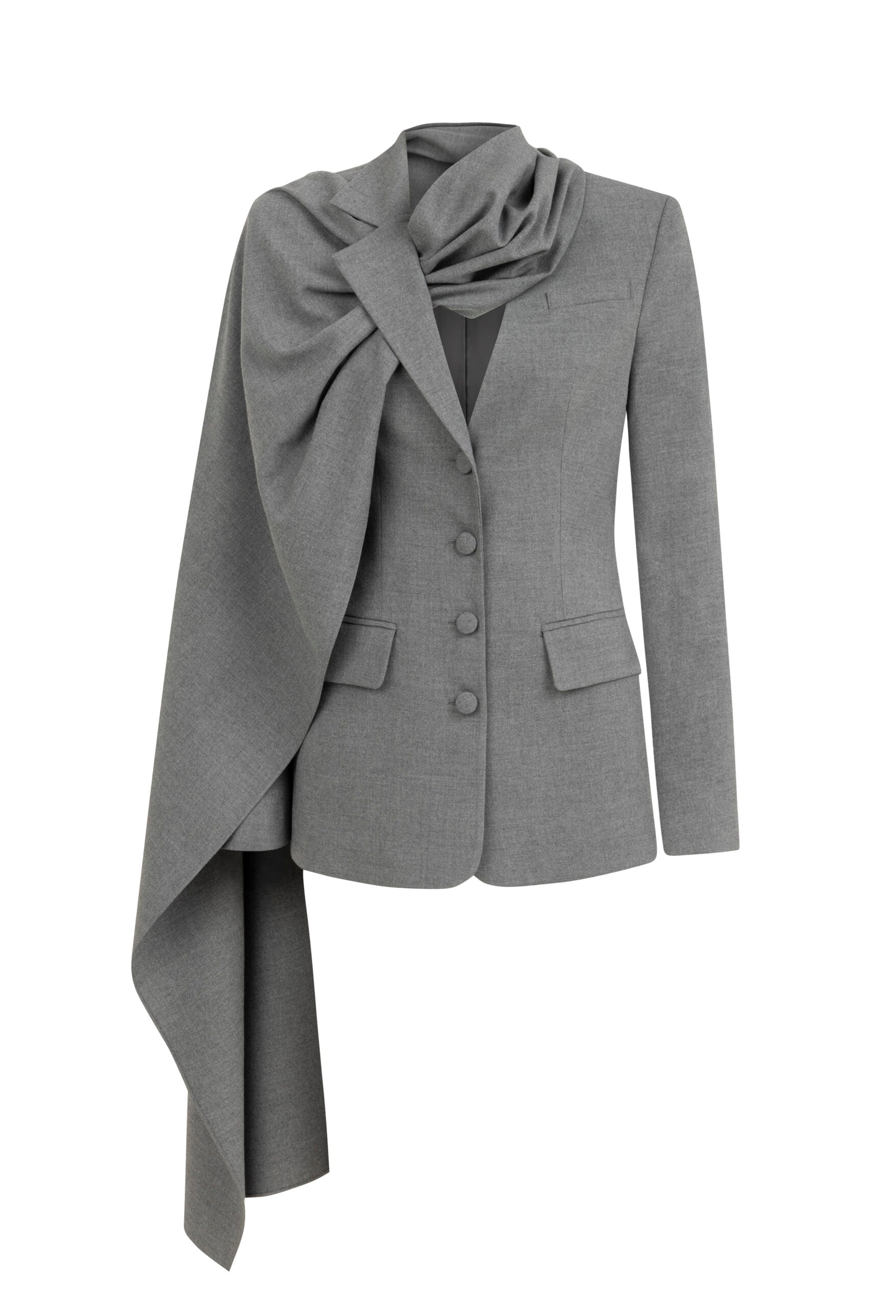 Şallı blazer ceket Kumaş düğme kapama Çıkarılabilir boyun şalı Kapak cep detaylı Modern ve zarif tasarım