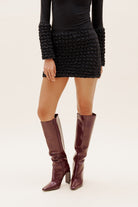 Özellikler: Bu etek, hacim ve dokusal zenginlik katan kalın örme tasarımıyla kendine özgü bir dokuya sahiptir. Koyu gri rengi, şıklığını artırırken, vücuda oturan mini boy, kalın örme deseniyle dengeli bir kontrast yaratır. Yüksek belde oturan etek, vücut hatlarını vurgular ve farklı üstlerle kombinlenerek modern ve şık bir görünüm elde edilebilecek cesur ve tarz sahibi bir parça sunar.