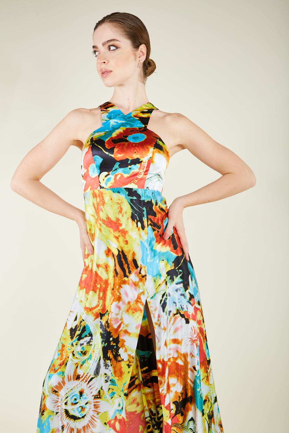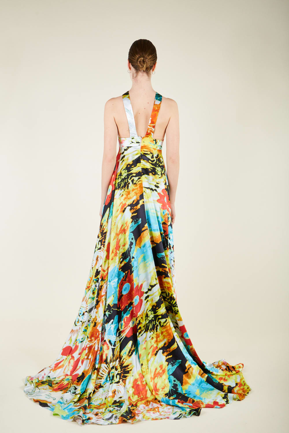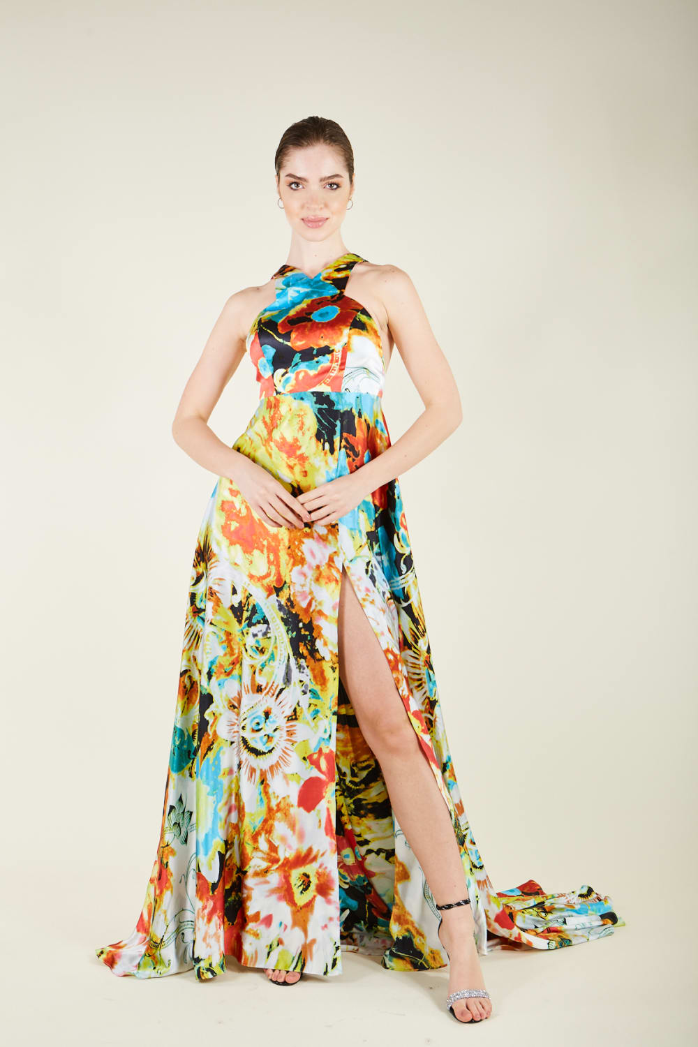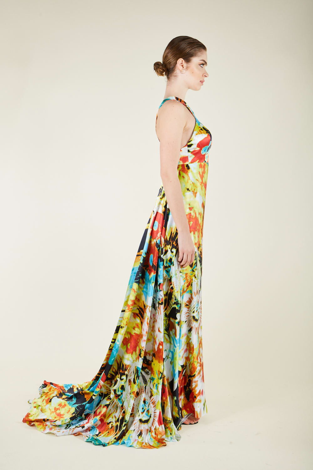 Saf İpek Saten Sarı Desenli Gece Elbisesi