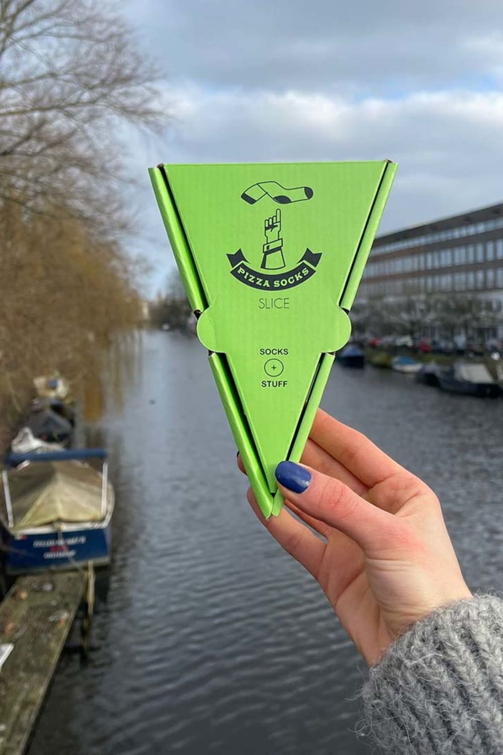 Dilim Pizza kutusu içerisinde gerçek görünümlü pizza desenli çorap.