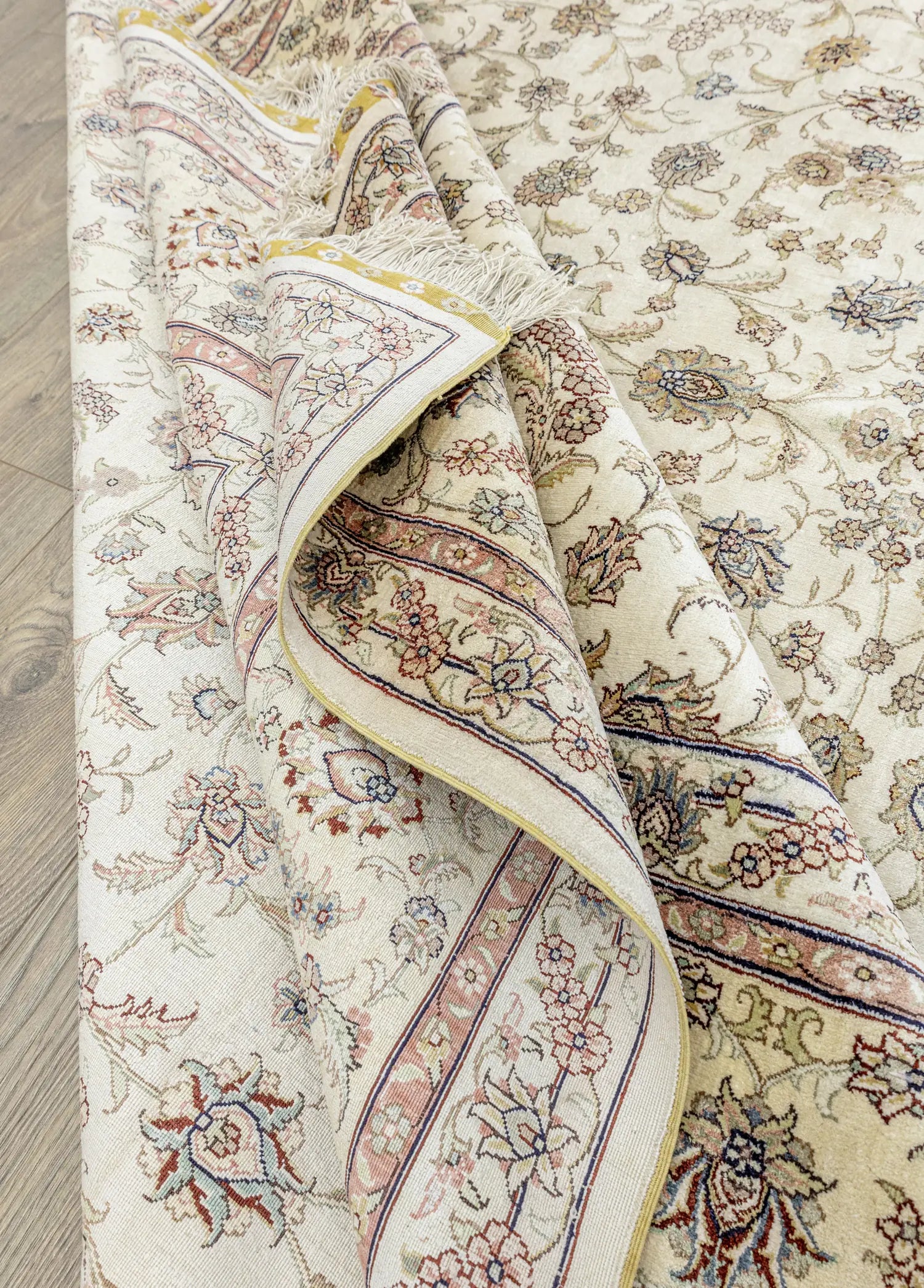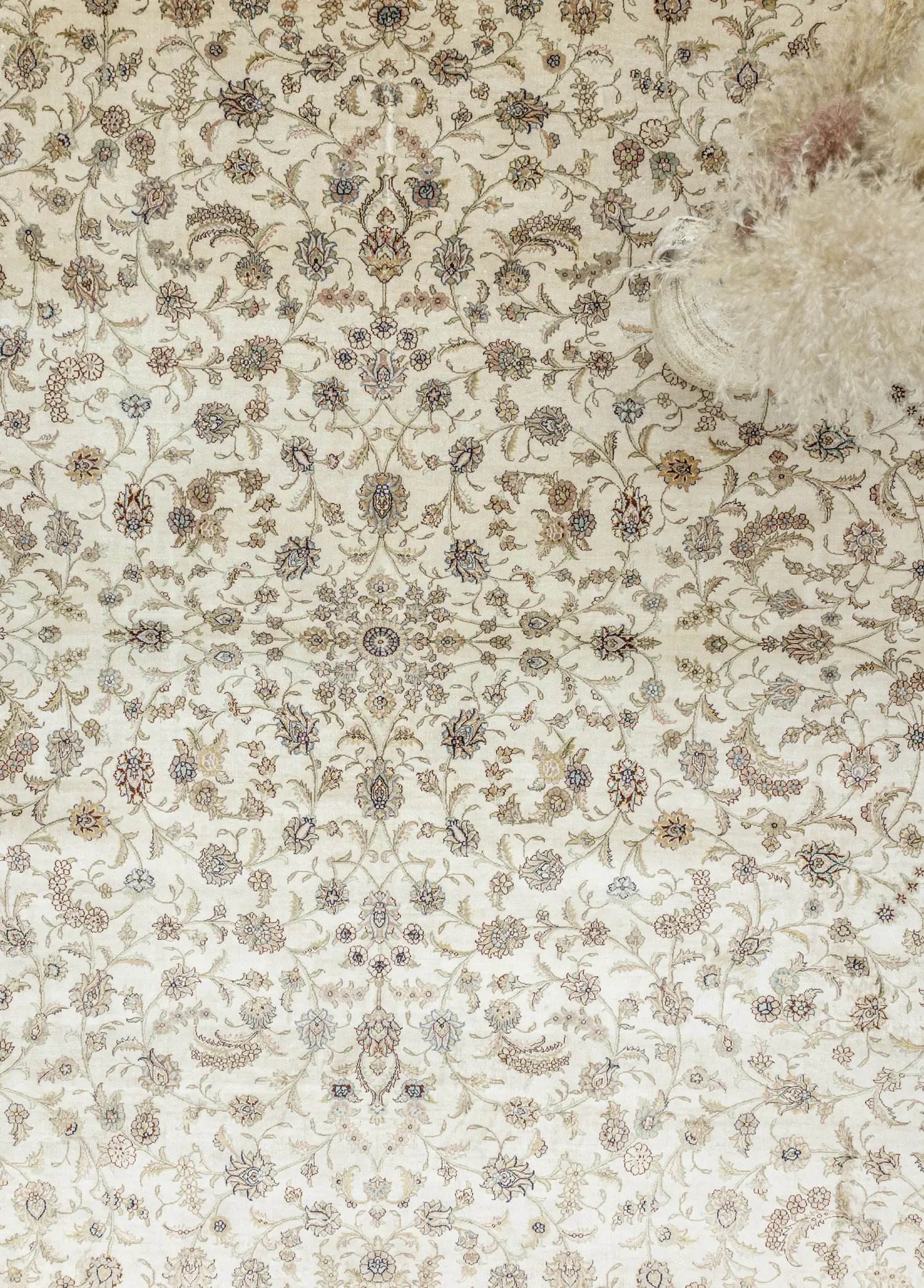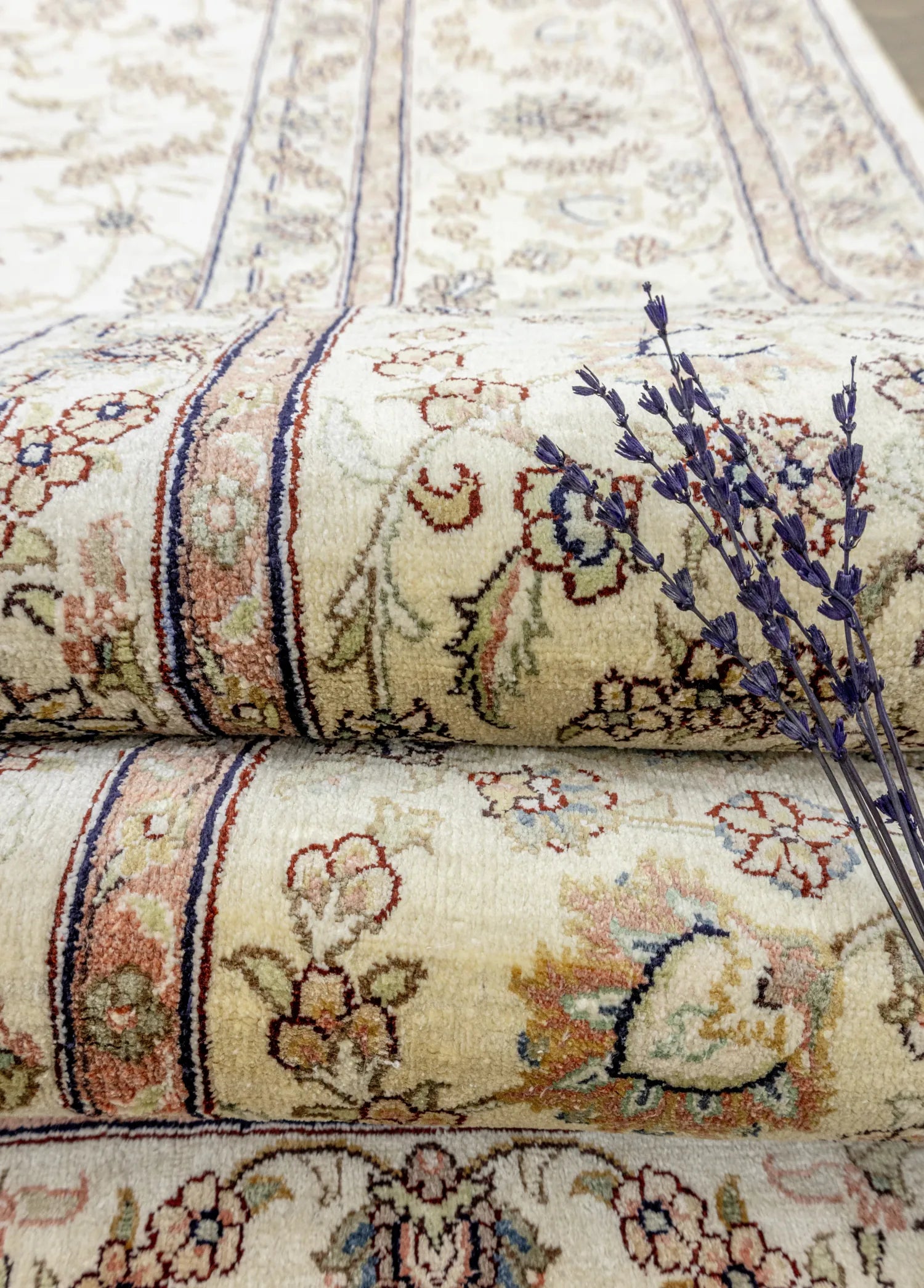 Geleneksel el dokuma teknikleri kullanılarak üretilen halı,evinize sıcaklık ve zarafet katmak amacıyla özel olarak tasarlanmıştır. Renkpaleti, doğanın yumuşak tonlarından ilham alınarak oluşturulmuş olup, krem ile bej renklerinin uyumuyla dikkat çekerken halı içerisinde bulunan diğer renkler ilede dengeli bir bütünlük sunar.