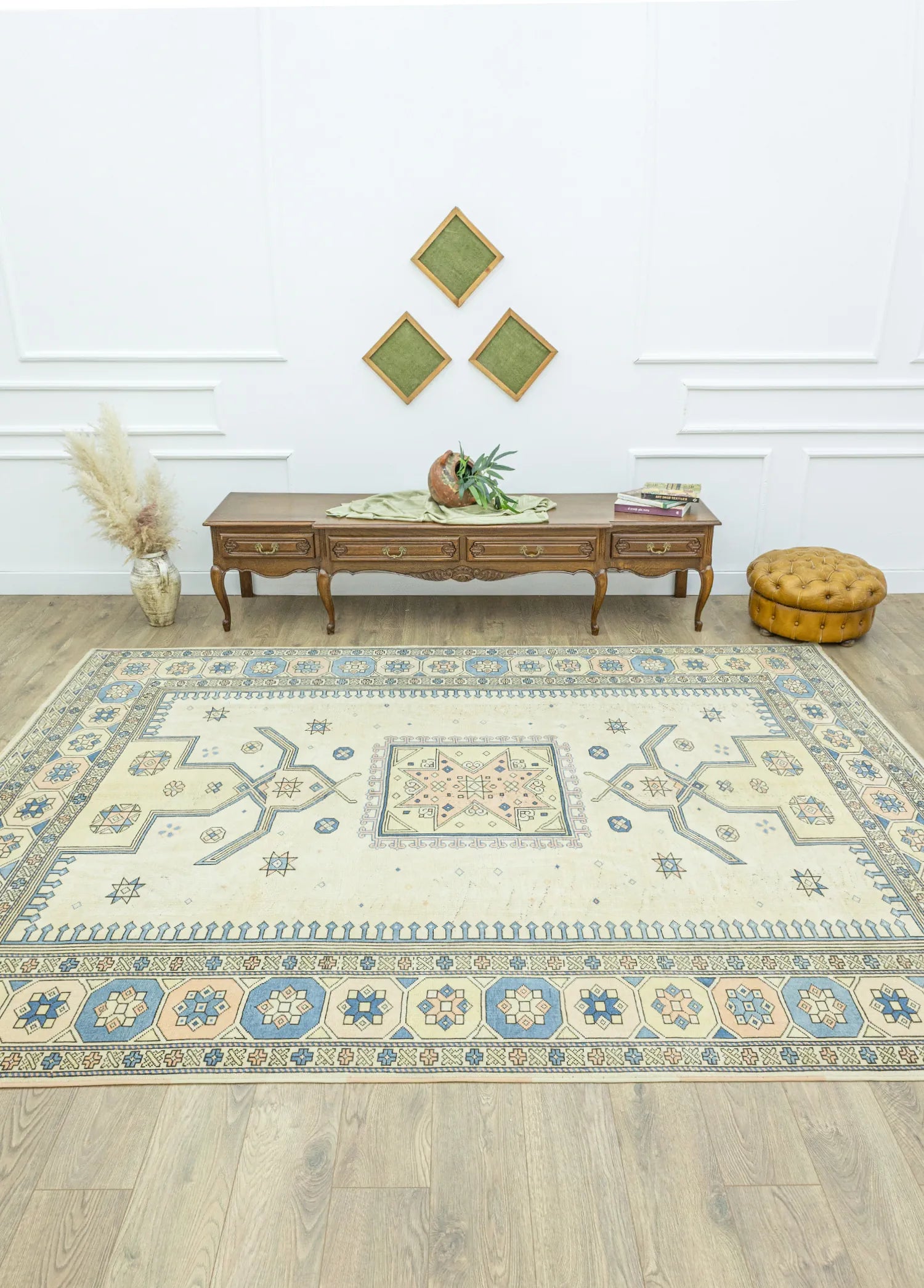 Yaşam alanınıza farklılık katacak olan Soho Antiq geleneksel halı modellerimizle karşınızdayız! Özel olarak tasarlanan bu halılar, her türlü alana uyum sağlamak üzere el dokuma tekniği ile özenle hazırlanmıştır ve tamamen yünden oluşmaktadır. Bu da halıları diğerlerinden farklı kılan birçok özellikten sadece bir tanesidir. Ana rengi bej olan halı modelimizde, mavi ve sarı gibi yan renkler bulunmaktadır. Bu uyumlu renk kombinasyonlarıyla estetik bir halıya sahip olabilirsiniz.