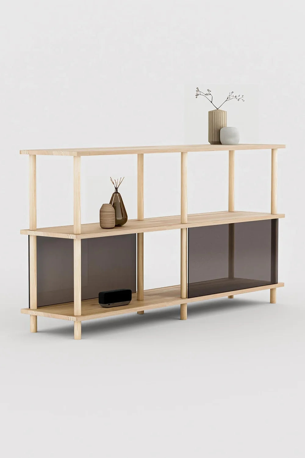 Duvara konumlandırıldığında dağınık kabloları, prizleri veya görsel karmaşayı gizlemek için ideal bir kullanım sağlar. Plaklar, kitaplar, dekoratif objeler ve elektronik ekipmanlar için geniş depolama alanı sunarken İskandinav esintili sade tasarımıyla mekâna modern bir karakter kazandırır.