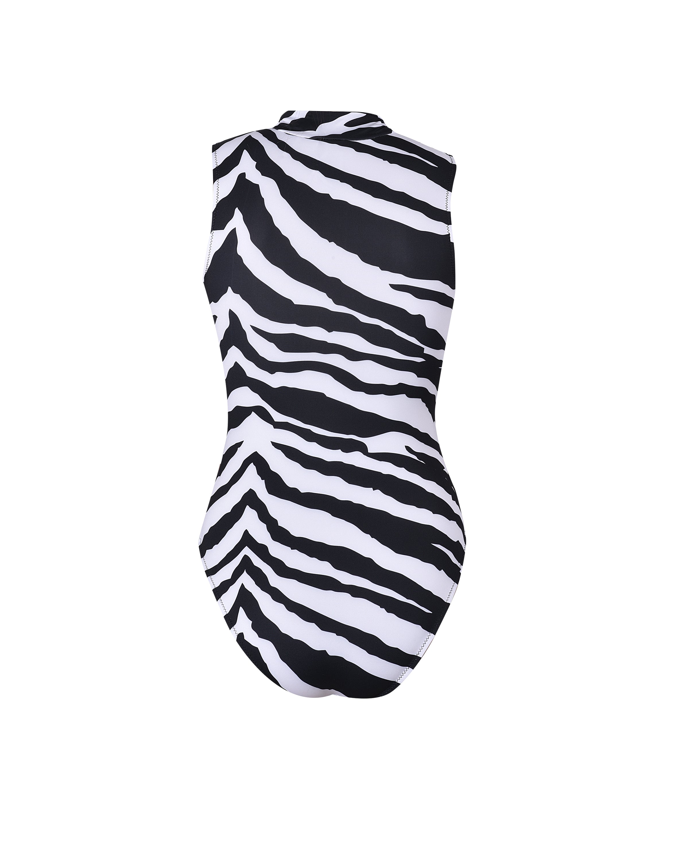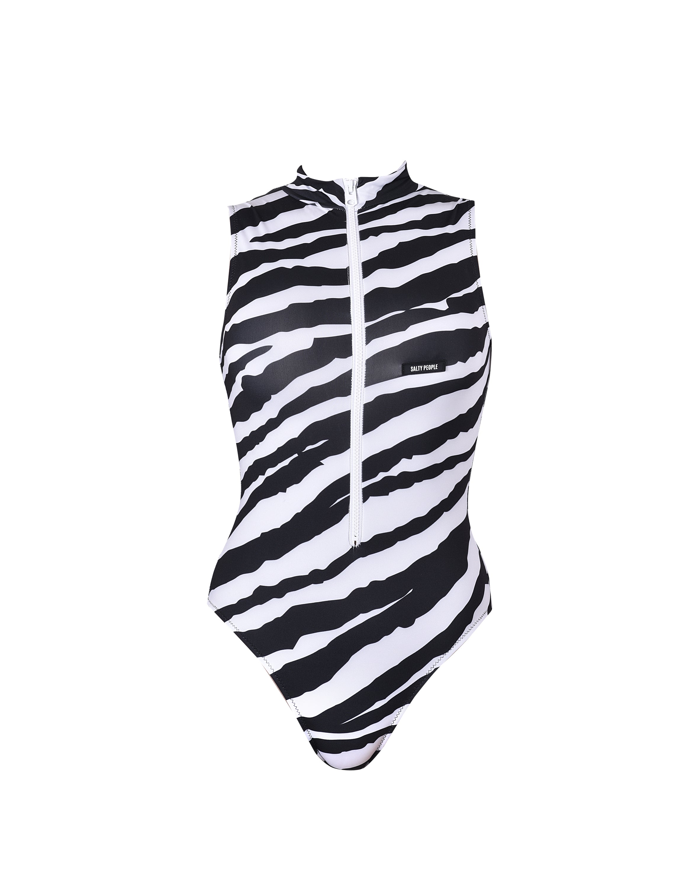 A one piece swimsuit in black zebra print with a eco-friendly zipper. Double fabric with lining. 50+SPF/UPF Sun Protection. Ease to dry.