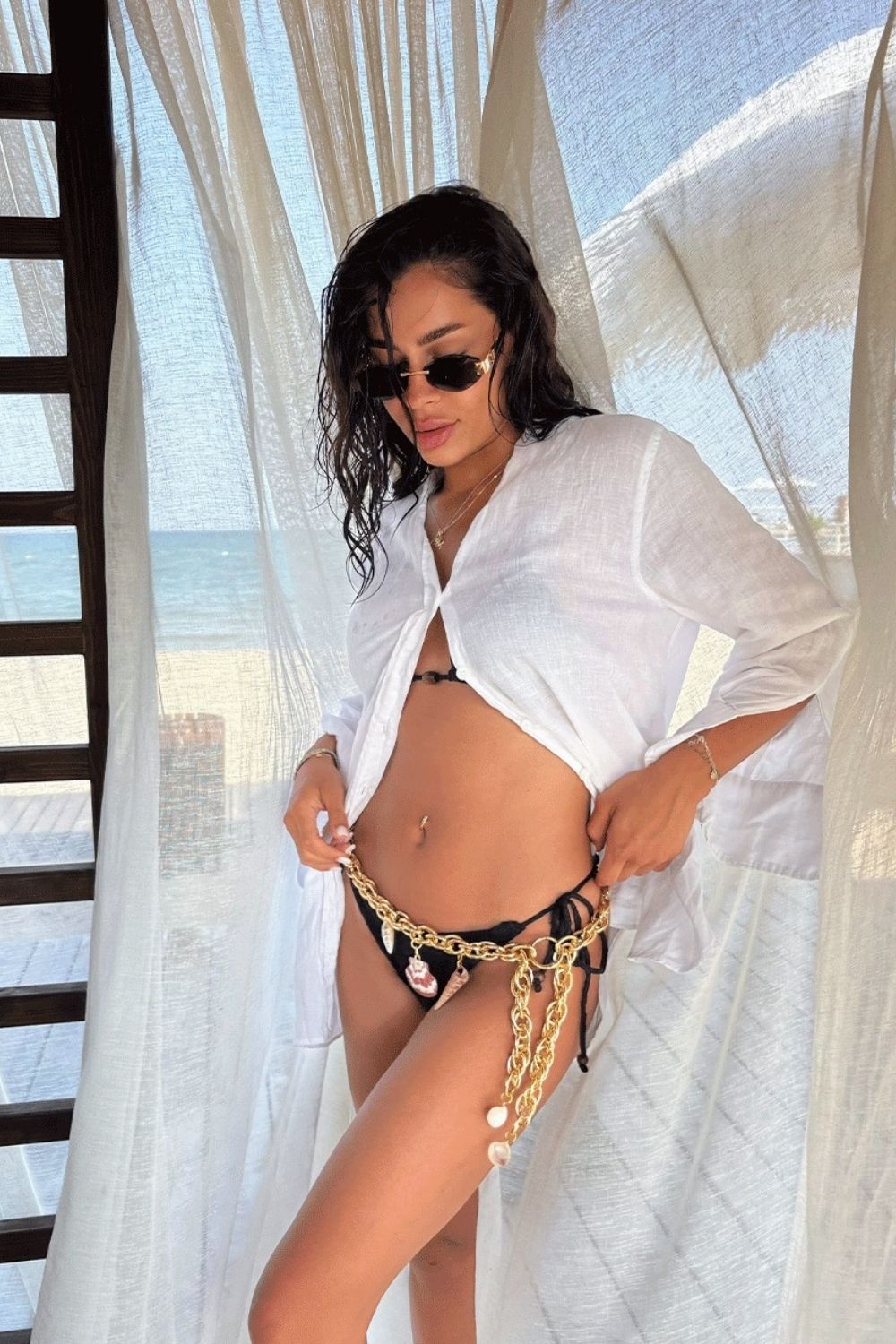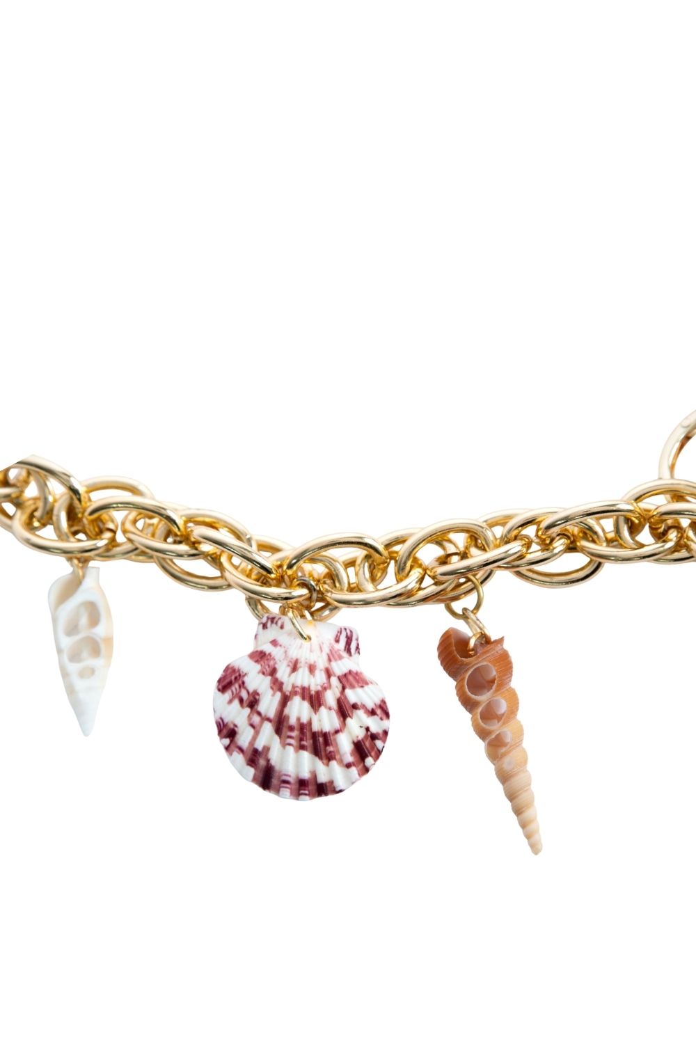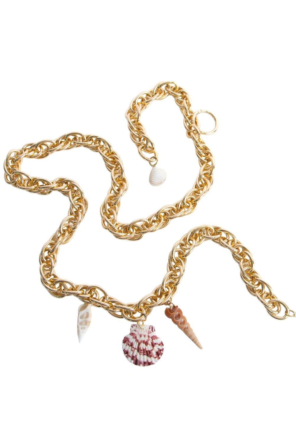 Gerçek deniz kabuklarıyla charm detaylandırılmış bu zincir kemer, tamamen elde ve özenle üretilmiştir. Doğal kabukların özgün dokusu, altın tonlu zincirle birleşerek yaz ruhunu ve bohem bir şıklığı yansıtır.