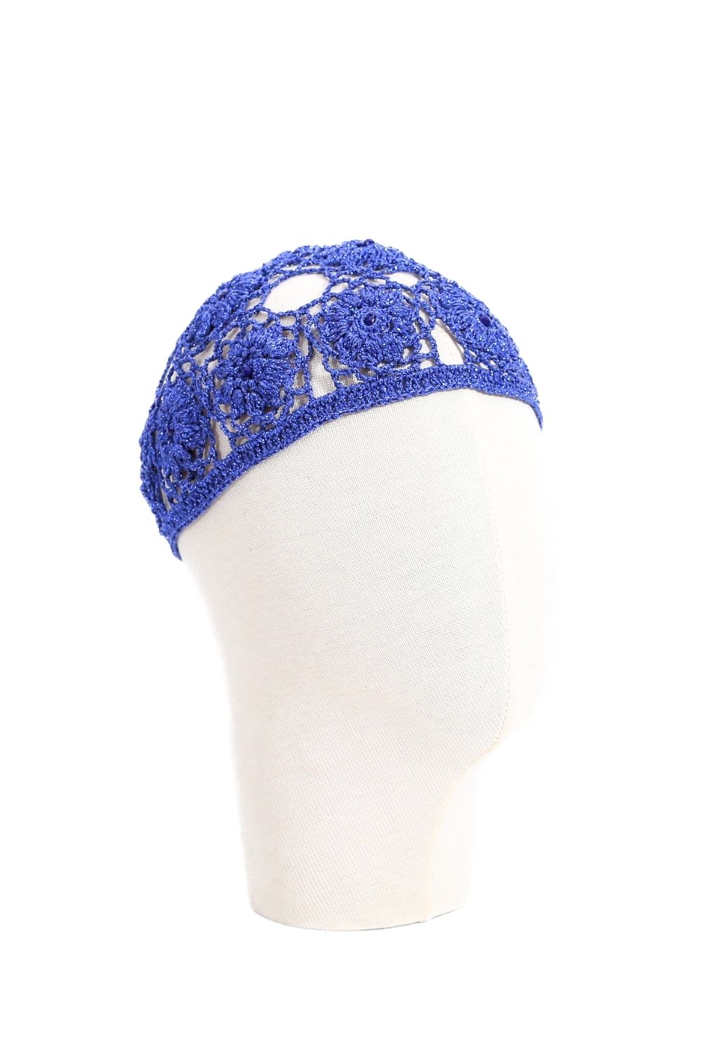 Mavi çiçek desenli örgü saç bonesi, esneyebilir yapısı sayesinde konforlu bir kullanım sunar. Tamamen el yapımıdır; uzun bir zanaat süreci ve yoğun emek içerir. Parlak dokusu ile hem gündüz hem gece kullanıma uygundur.