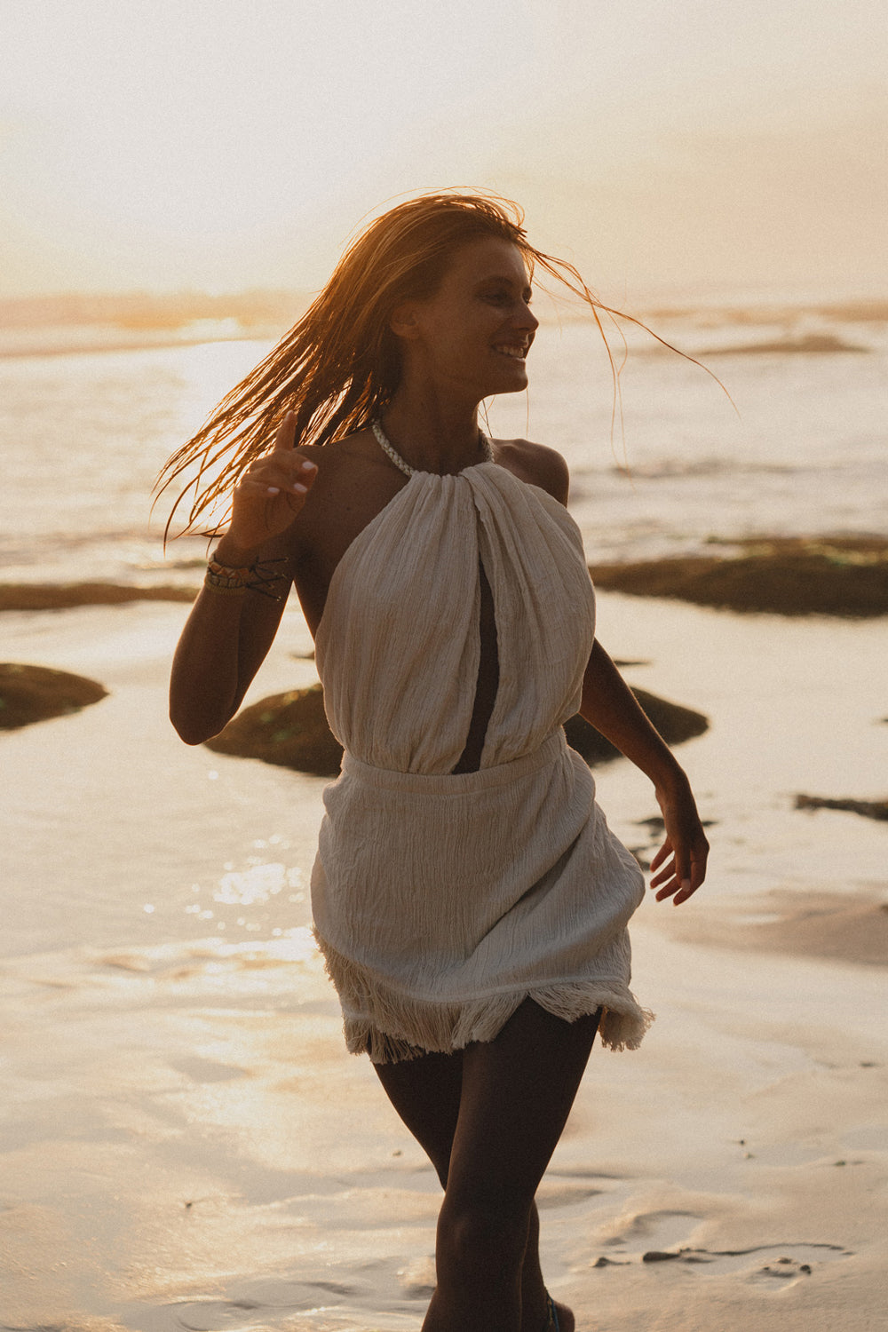 El yapımı kolye detaylı, kısa, sırtı açık, pamuklu püsküllü elbise. El dokuma, %100 saf pamuk, hafif kumaş.