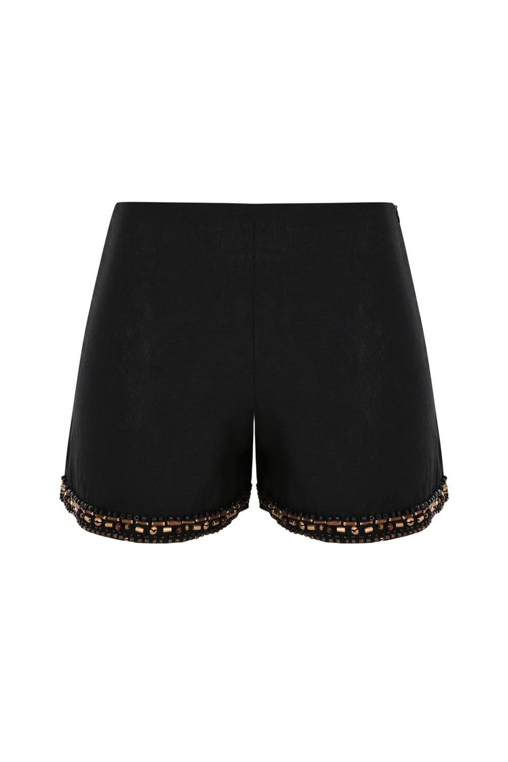 Hindistan cevizi ve ahşap boncuklarla el işlemeli, sedef detaylı, orta yüksek bel şort. SS24 Koleksiyonu için özel olarak tasarlanmış, el dokuması, ham, saf pamuklu kumaş.