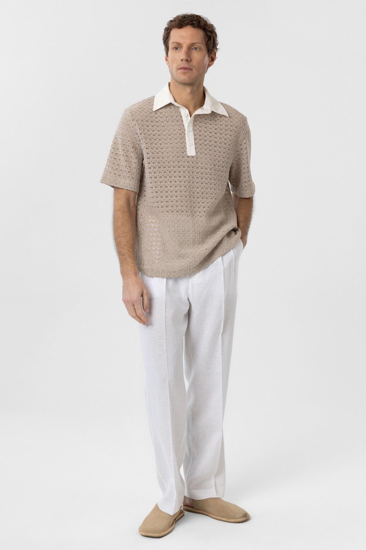 Bej Polo Yaka Örgü Erkek T Shirt