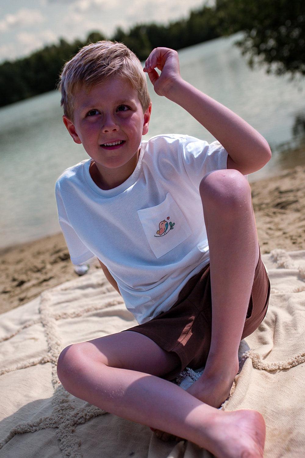 Ekru cepli better-cotton çocuk t-shirt.