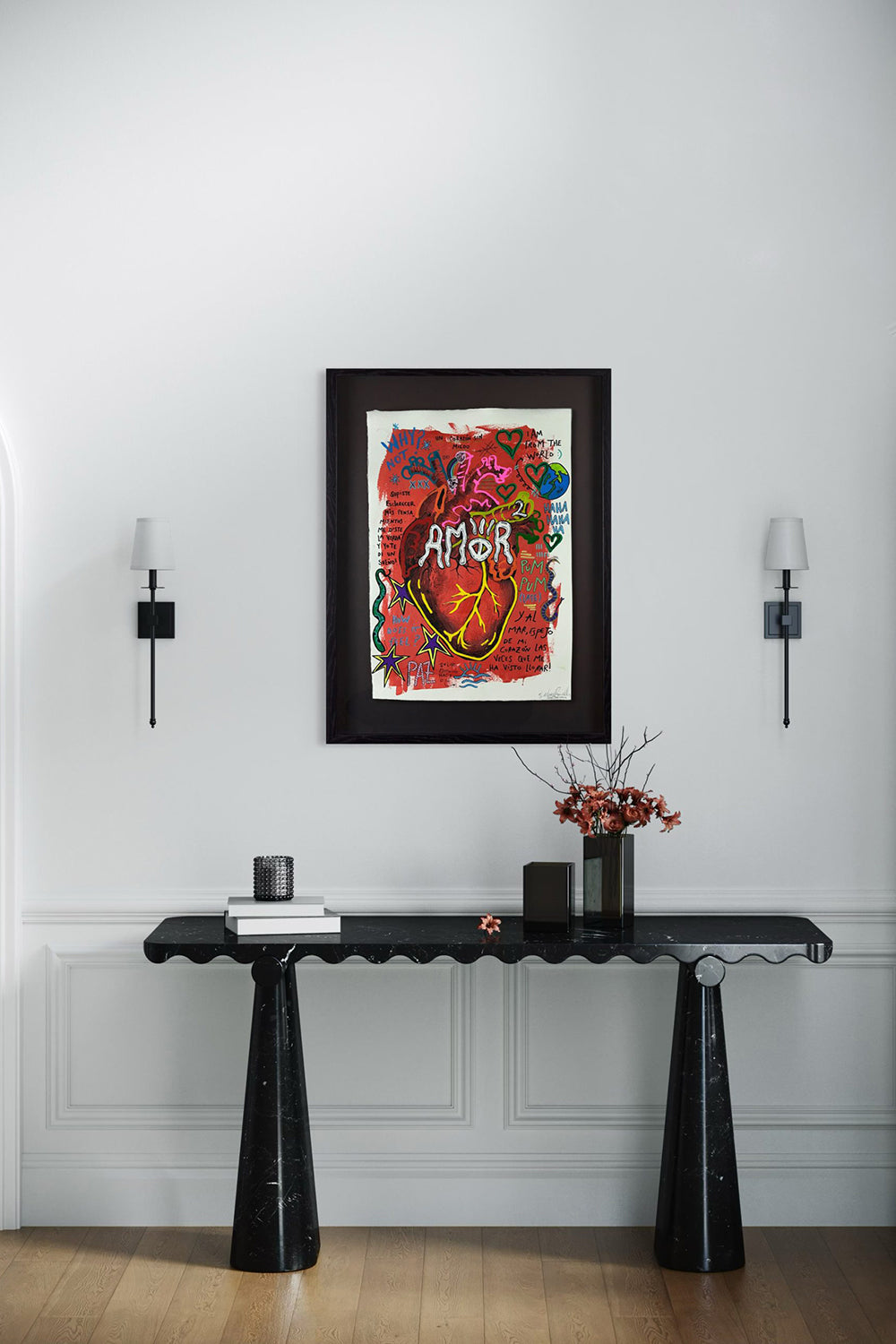Floating tekniği ile ahşap siyah çerçeve ve siyah paspartu ile çerçevelenmiştir.