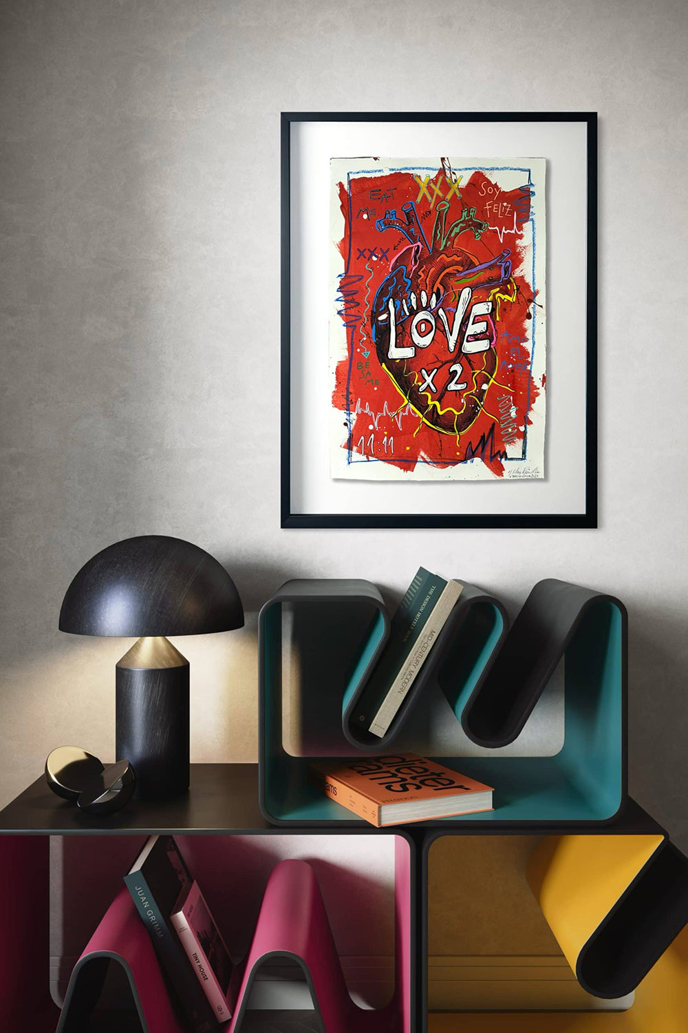 Floating tekniği ile ahşap siyah çerçeve ve siyah paspartu ile çerçevelenmiştir.