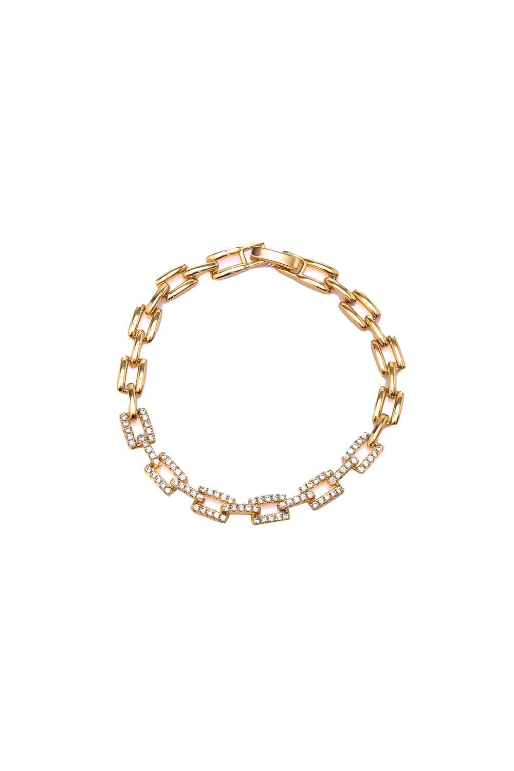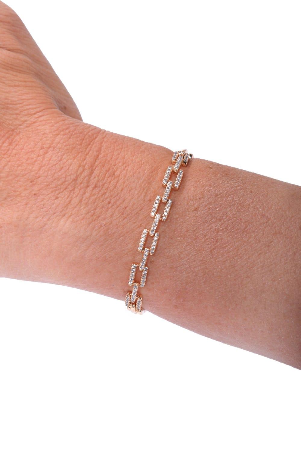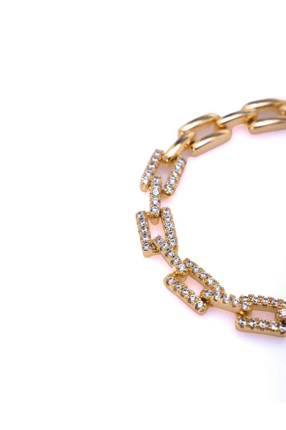 Zincir Bileklik, iç içe geçmiş zincirlerin zarif tasarımıyla oluşturulan ve birinci kalitede zirkon taşları ile süslenmiş özel bir bilekliği temsil ediyor. 18K rodyum kaplama ile mükemmel bir uyum sağlayan bu bileklik, her anı özel kılıyor.