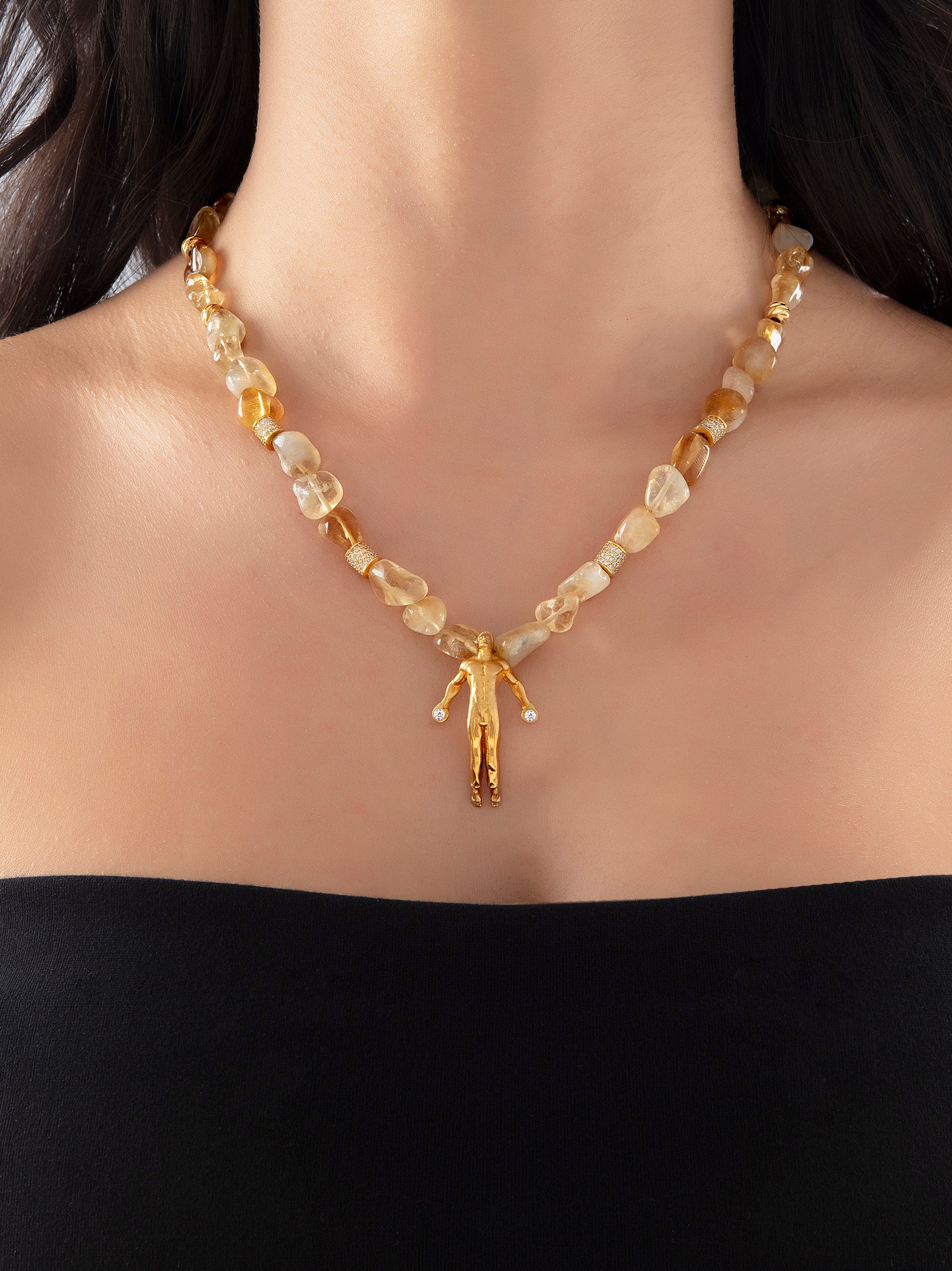 Bu kolyede aynı zamanda Amaze heykelimizi kullanıyoruz. Amaze, yükselişimizi ve kendi ışığımıza adım atmayı temsil eder. Sitrinin bolluk, güç ve yaratım frekansıyla mükemmel uyum içinde çalışarak kolyenin enerjisini tamamlar.