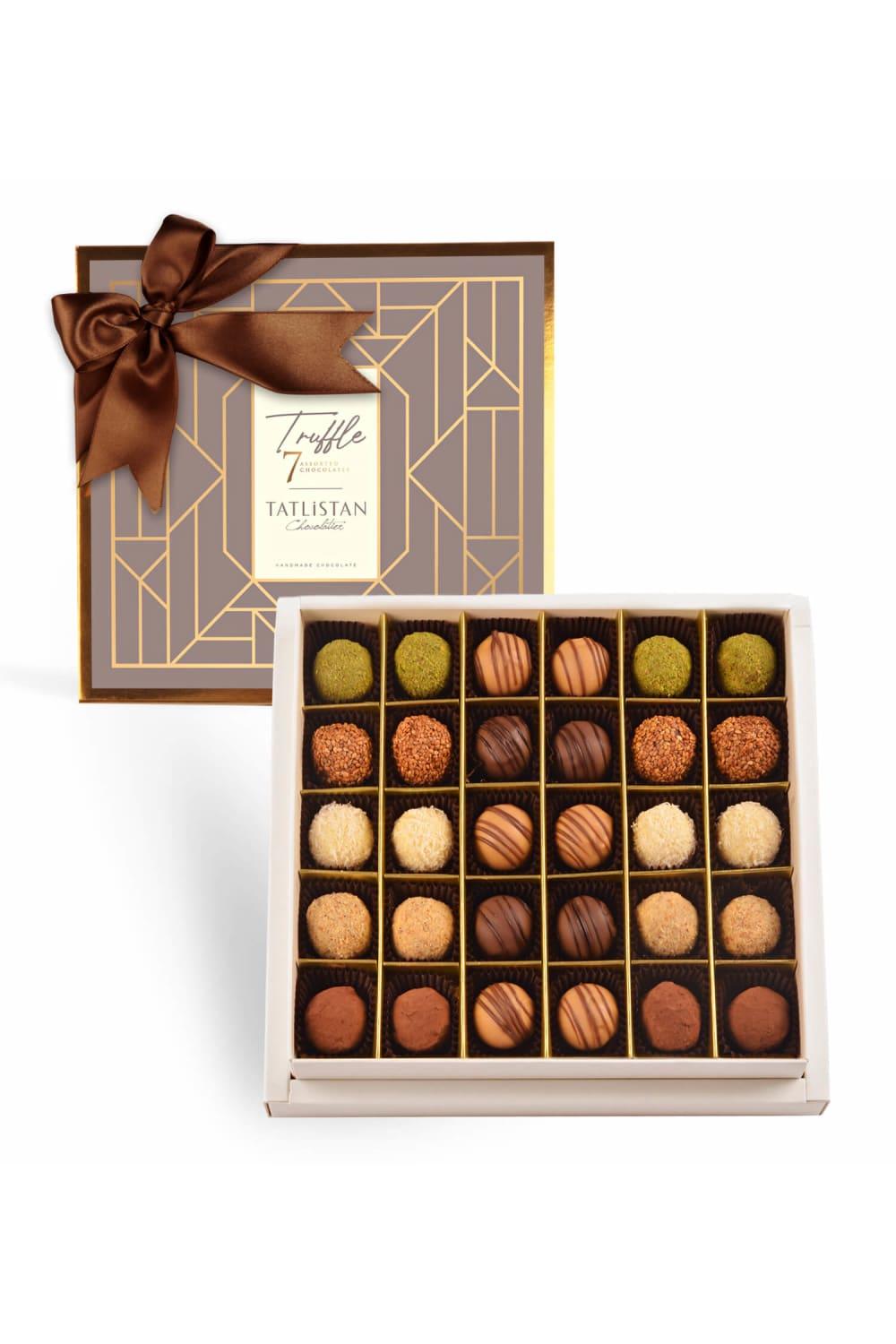 22×22 cm kutu içerisinde toplam 400 gr. ağırlığında olmak üzere; 30 adet trüf çikolata bulunmaktadır.