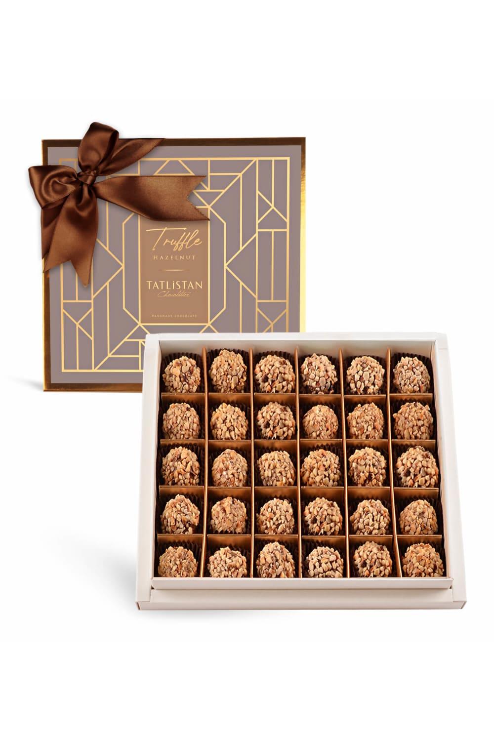 22×22cm. kutu içerisinde toplam 400gr. ağırlığında, fındık ganaj dolgulu ve parça fındık kaplamalı 30 adet sütlü çikolatalı trüf bulunmaktadır.