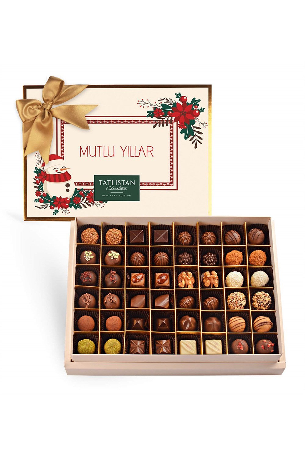 34×26 cm yılbaşı tasarımlı kutu içerisinde toplam 750 gr. ağırlığında olmak üzere; 48 adet artisan çikolata bulunmaktadır.
