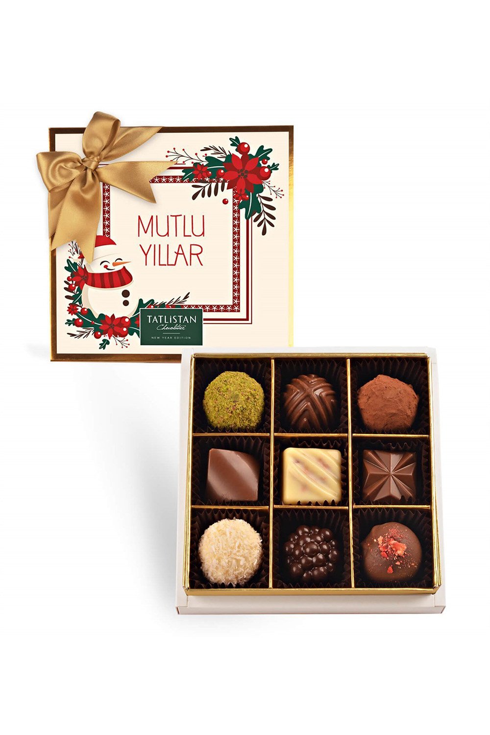 12×12 cm yılbaşı tasarımlı kutu içerisinde toplam 110 gr. ağırlığında olmak üzere; 9 adet artisan çikolata bulunmaktadır.