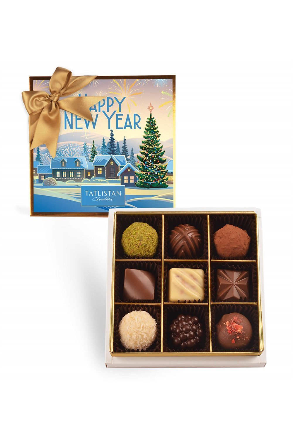 12×12 cm yılbaşı tasarımlı kutu içerisinde toplam 110 gr. ağırlığında olmak üzere; 9 adet artisan çikolata bulunmaktadır.