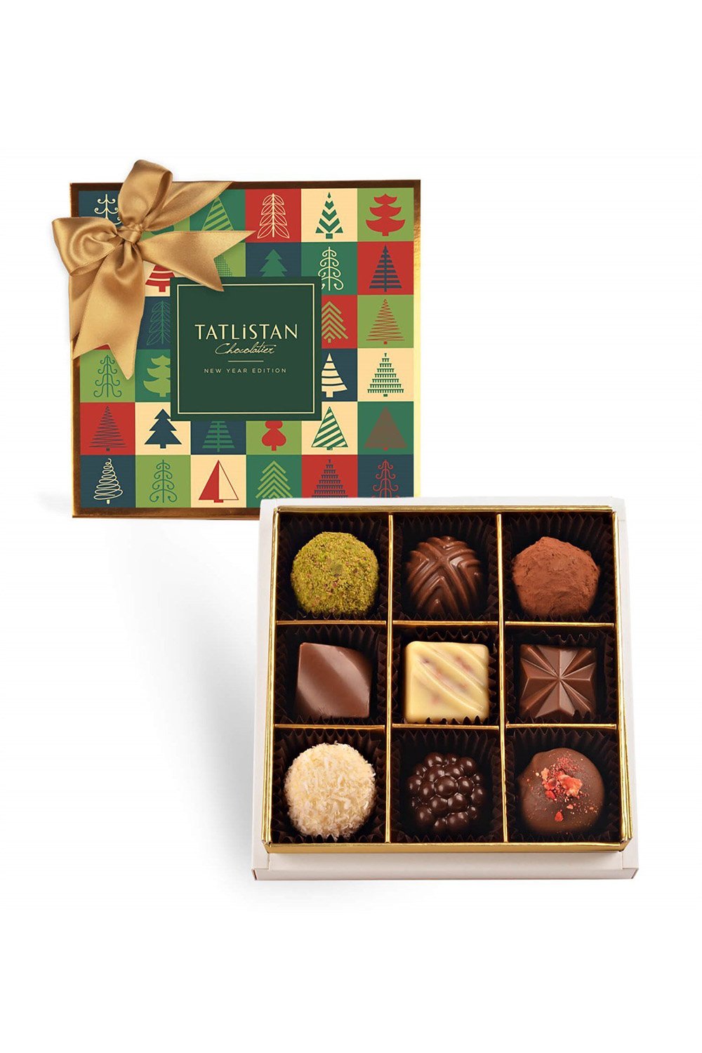 12×12 cm yılbaşı tasarımlı kutu içerisinde toplam 110 gr. ağırlığında olmak üzere; 9 adet artisan çikolata bulunmaktadır.