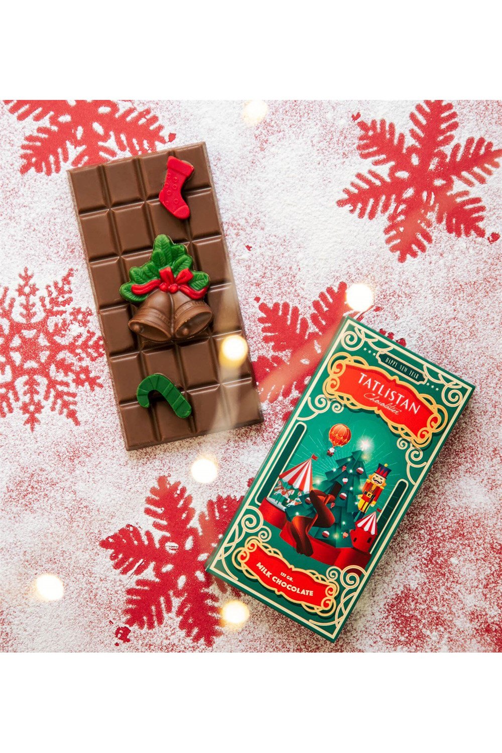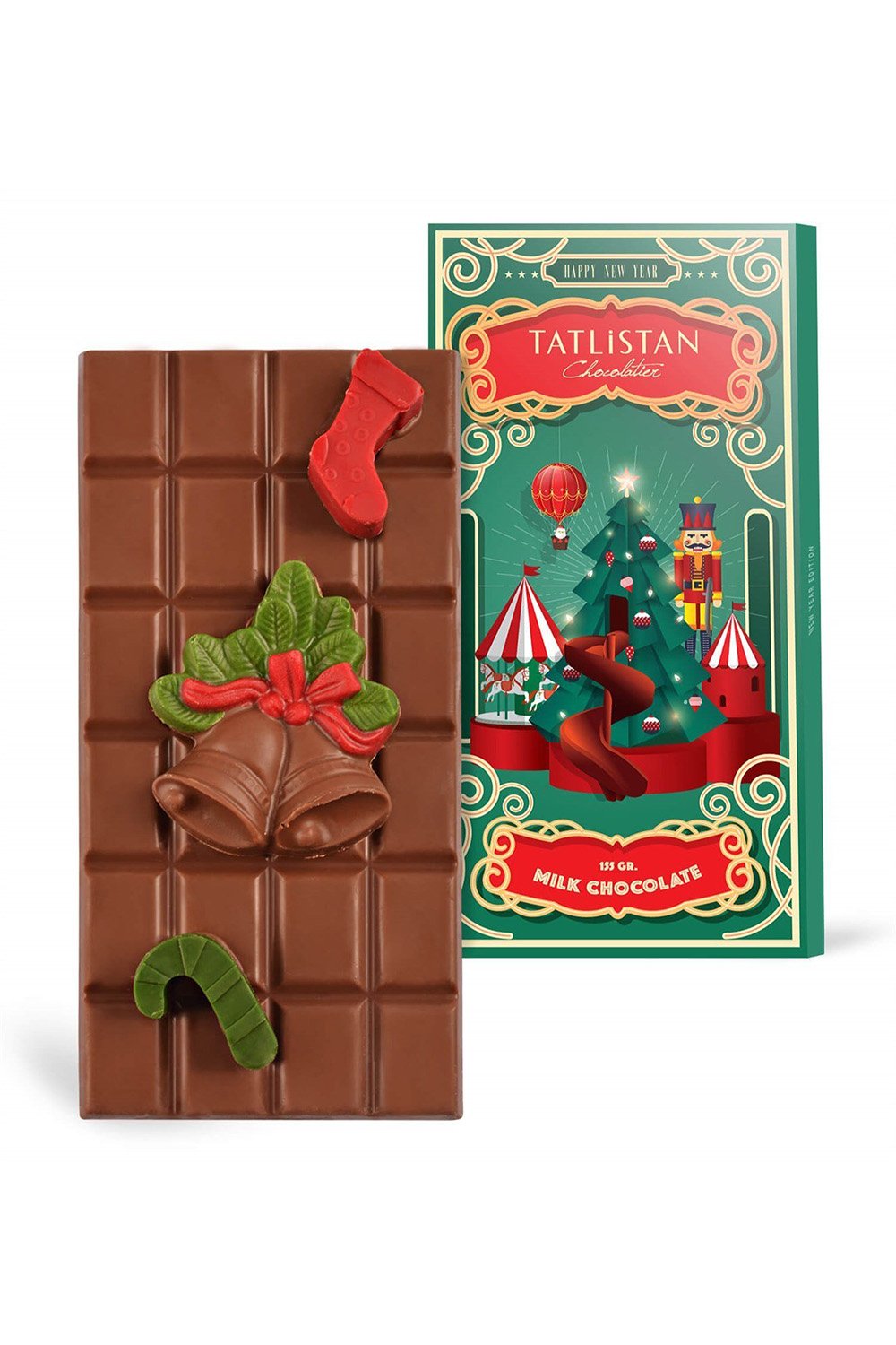 8×16 cm. yılbaşı tasarımlı kutu içerisinde toplam 155 gr. ağırlığında olmak üzere; yeni yıl çanı, çorap ve baston şeker şeklinde şeklinde sütlü tablet çikolata bulunmaktadır.