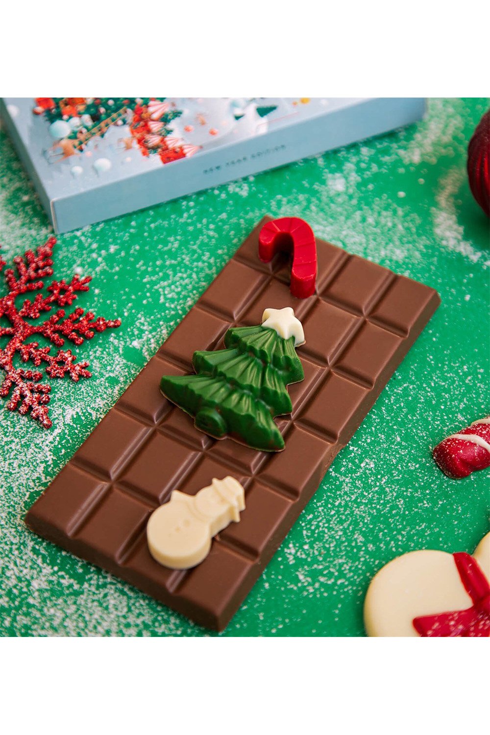 8×16 cm. yılbaşı tasarımlı kutu içerisinde toplam 145 gr. ağırlığında olmak üzere; yeni yıl çorabı, kardan adam ve yılbaşı ağacı şeklinde şeklinde sütlü tablet çikolata bulunmaktadır.