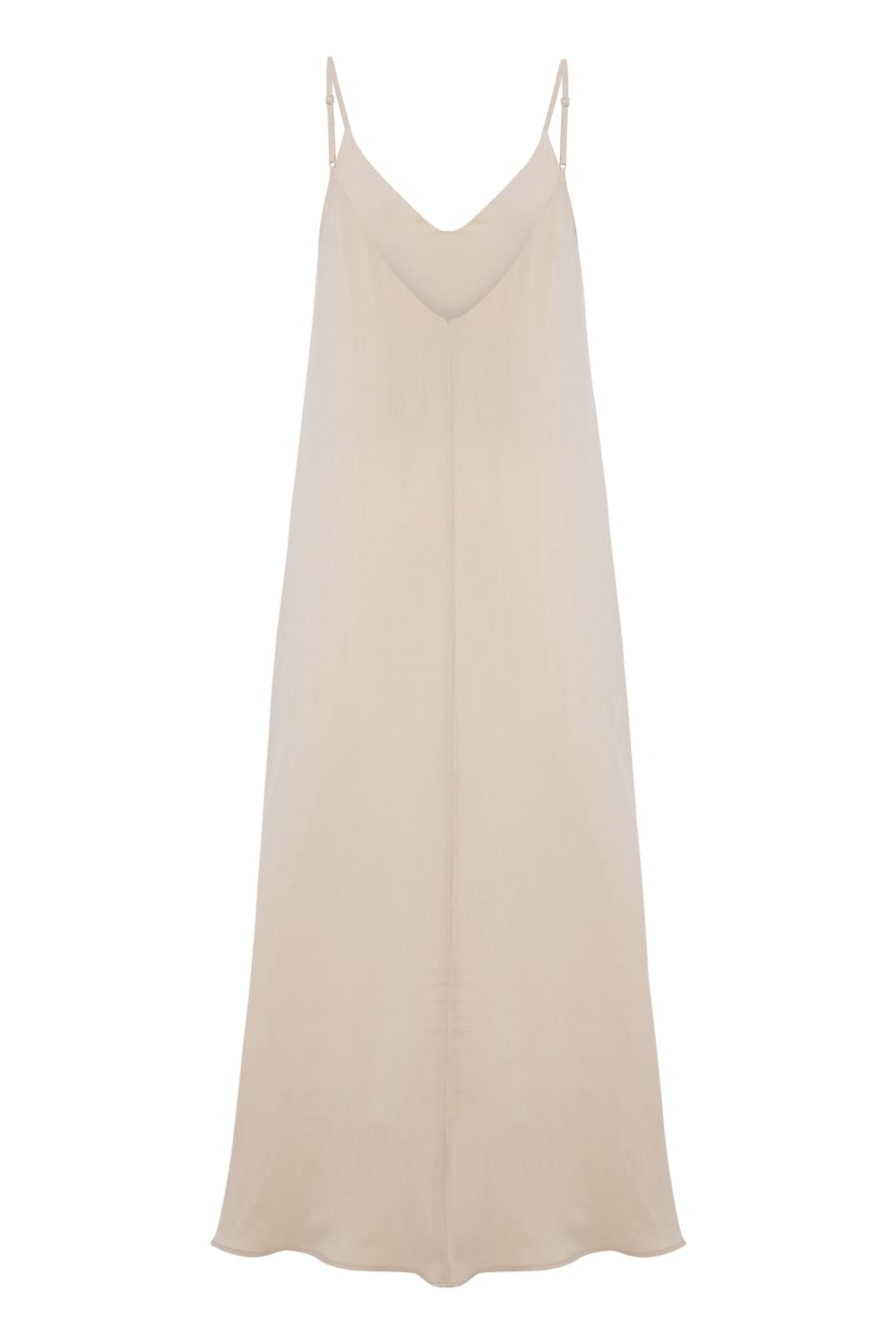 Zarif bir yaz stili sunan bu tasarım, ince V yaka, ayarlanabilir ince askılar ve zarif bir silüet ile dikkat çeker. Sürdürülebilir bir ECOVISCOSE ve TENCEL™ Luxe karışımından üretilen ince dokulu kumaşı, hafif parlaklığı ve lüks dökümüyle öne çıkar. Şık sırt detayı, tasarıma sofistike bir dokunuş katar. Hem rahat günler hem de özel akşamlar için mükemmel bir seçimdir.