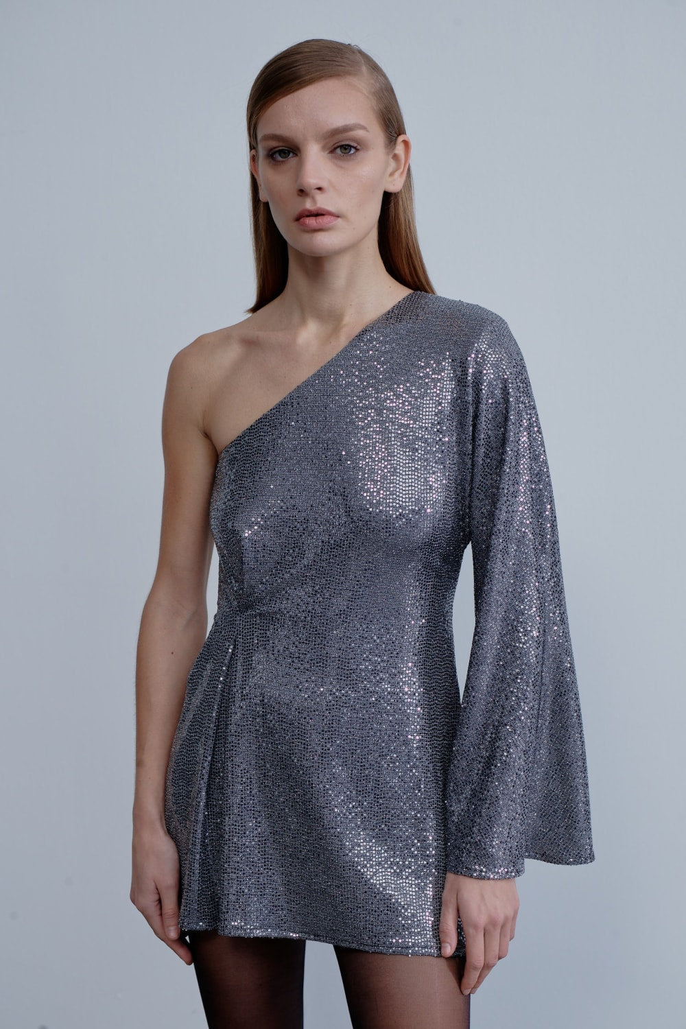 Nazlı Ceren brings a glamorous feel to this retro-inspired Emerald mini dress, made to a flared one-sleeve silhouette with shimmering sequins.