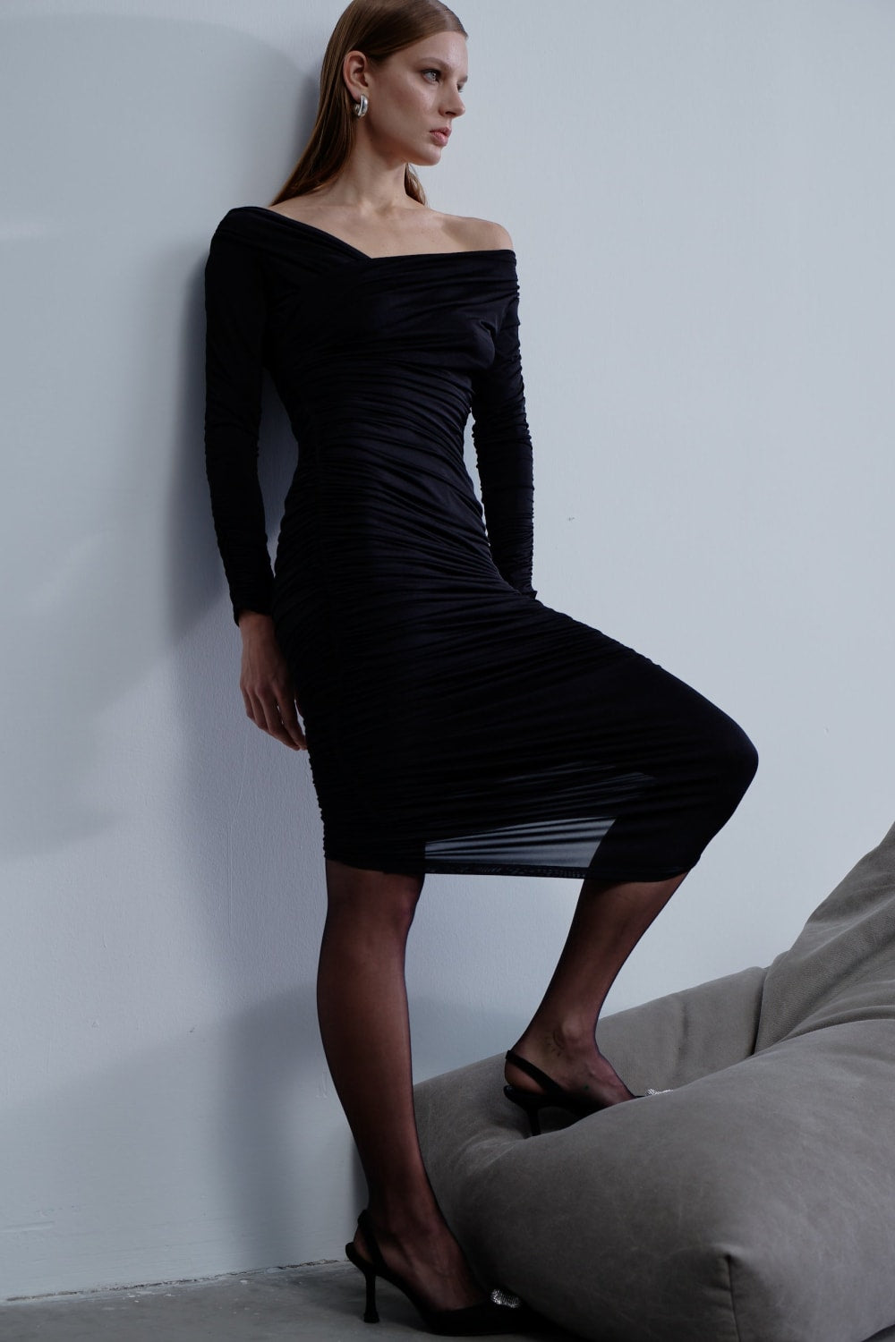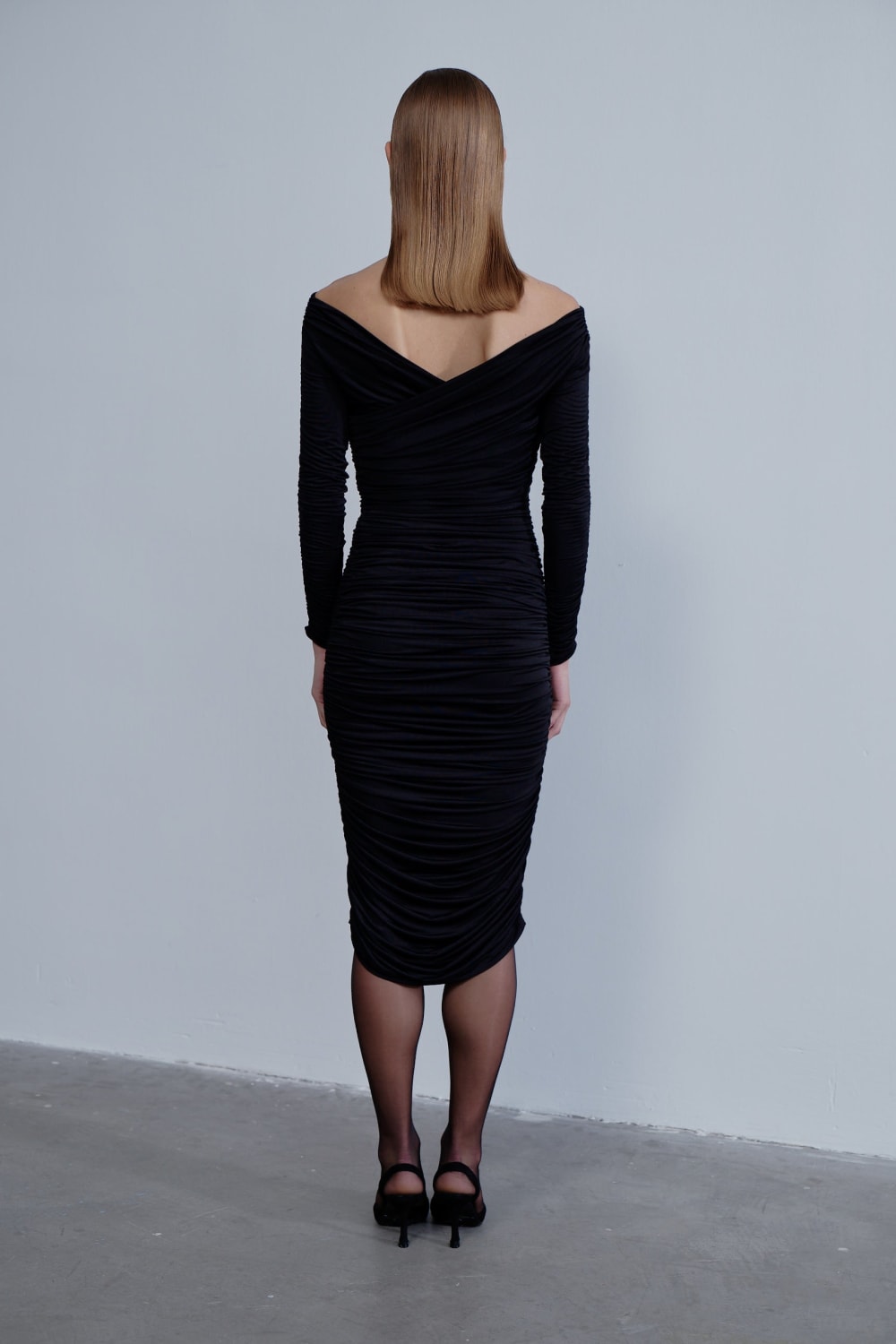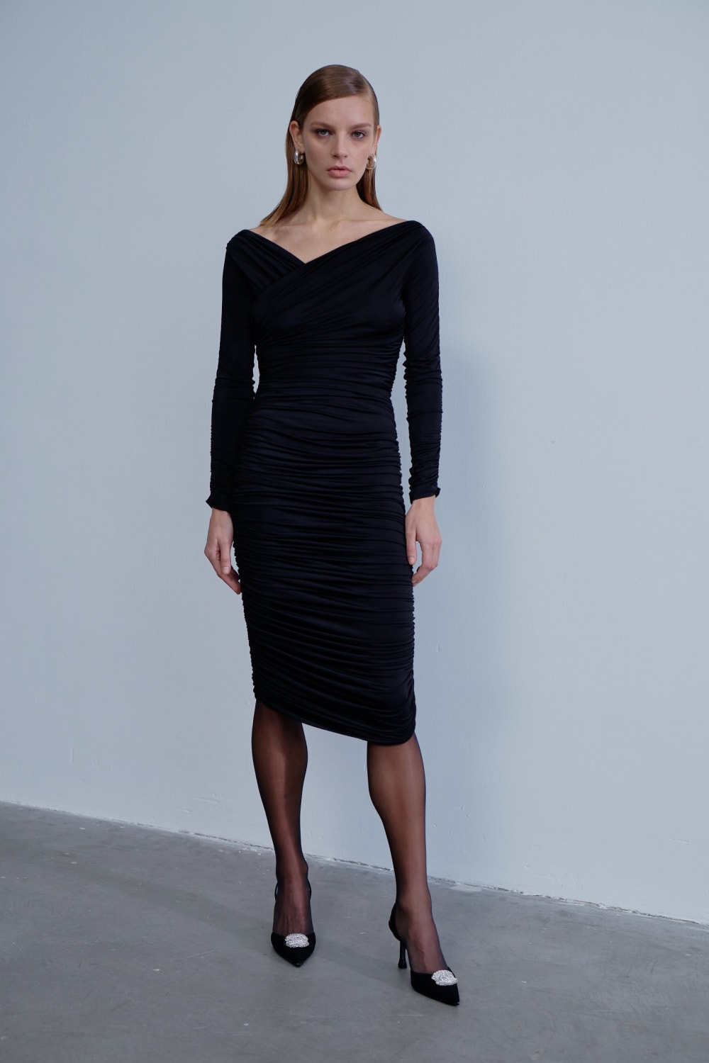 Nazlı Ceren's sophisticated aesthetic with the draped construction of this black stretch-jersey midi dress, cut with a sculpted neckline.