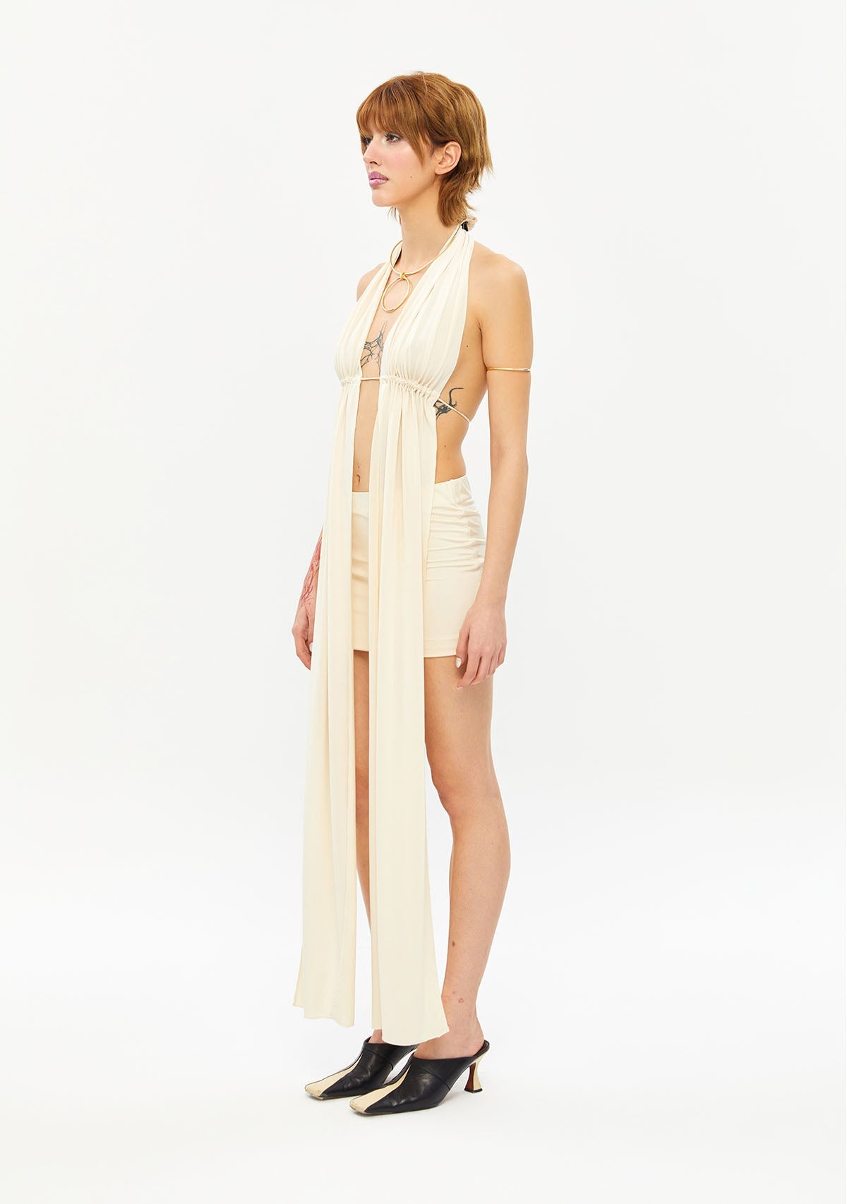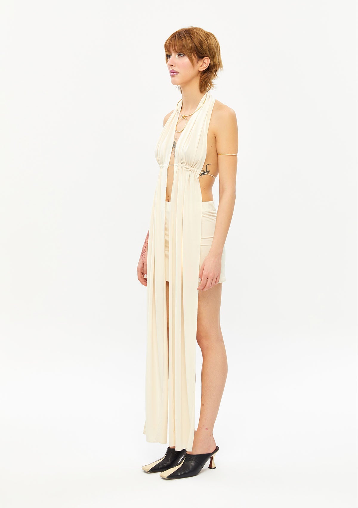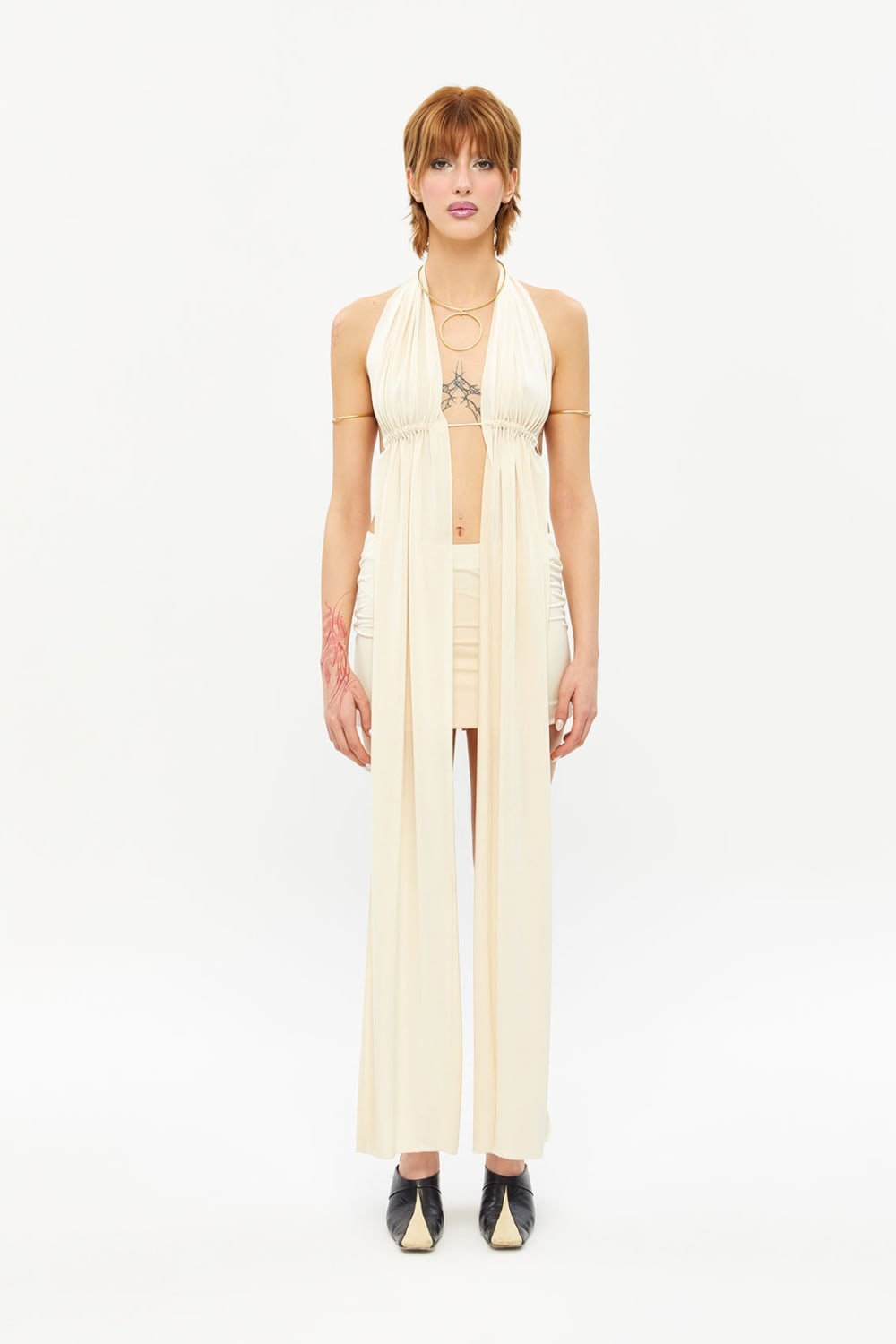 - Boyundan sallanan tek bir kumaş parçasını göğüs altından bağlanan ipleriyle derinleştiren bu tasarım, elbise gibi görünen bir bluz.