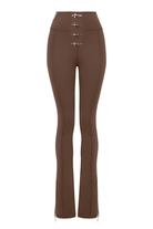 Modern tasarımıyla öne çıkan yüksek bel, metal aksesuarlı, yandan açılır fermuarlı flare paça tayt, vücut hatlarını toparlar ve şık bir siluet sunar. Yandan açılır fermuar detayı, kullanım kolaylığı sağlar ve tasarıma modern bir dokunuş katar. Flare paça kesimi kombinlerinize stil katarken, metal aksesuar detayları şıklığı artırır.