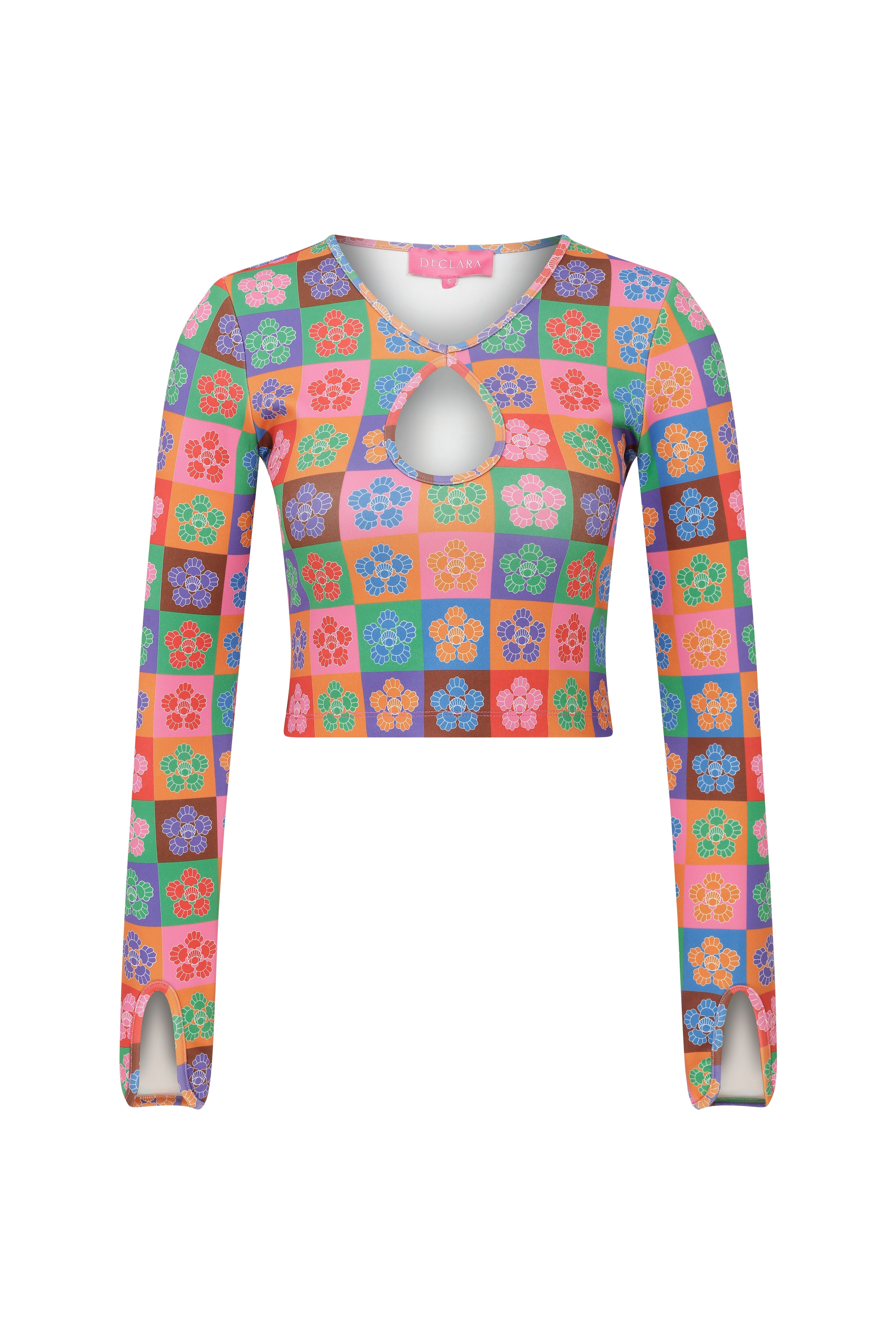 Dijital çiçek desenli ve ikonlu üst, göğüs kısmındakesik detayı olan scuba kumaştan yapılmıştır.