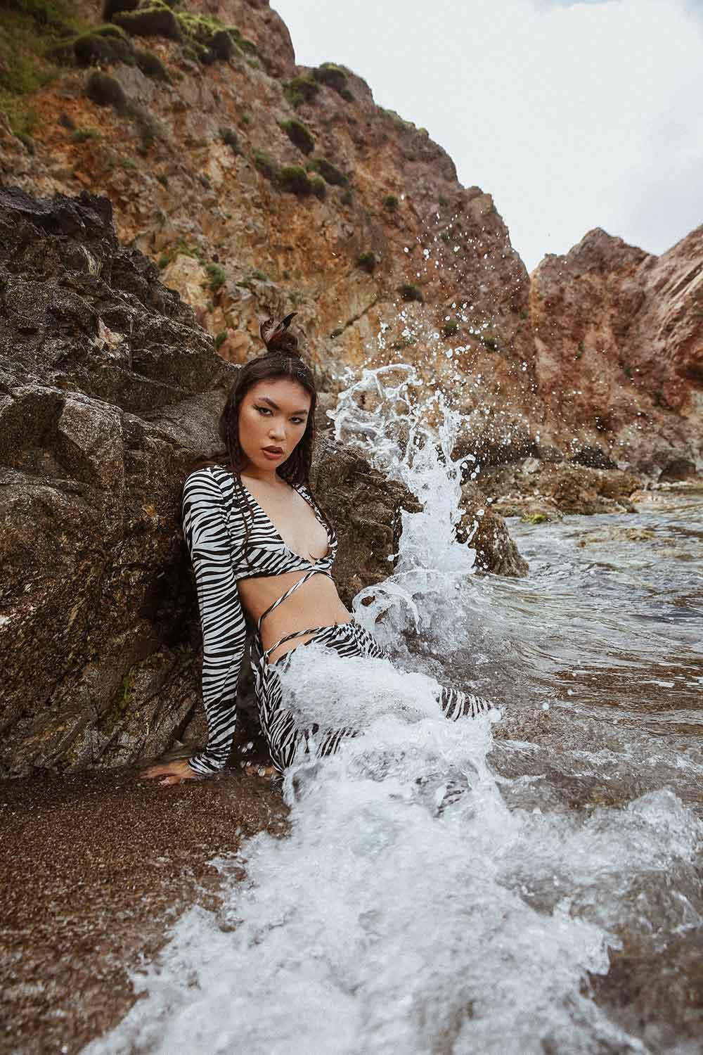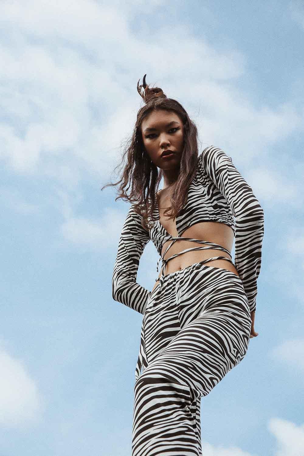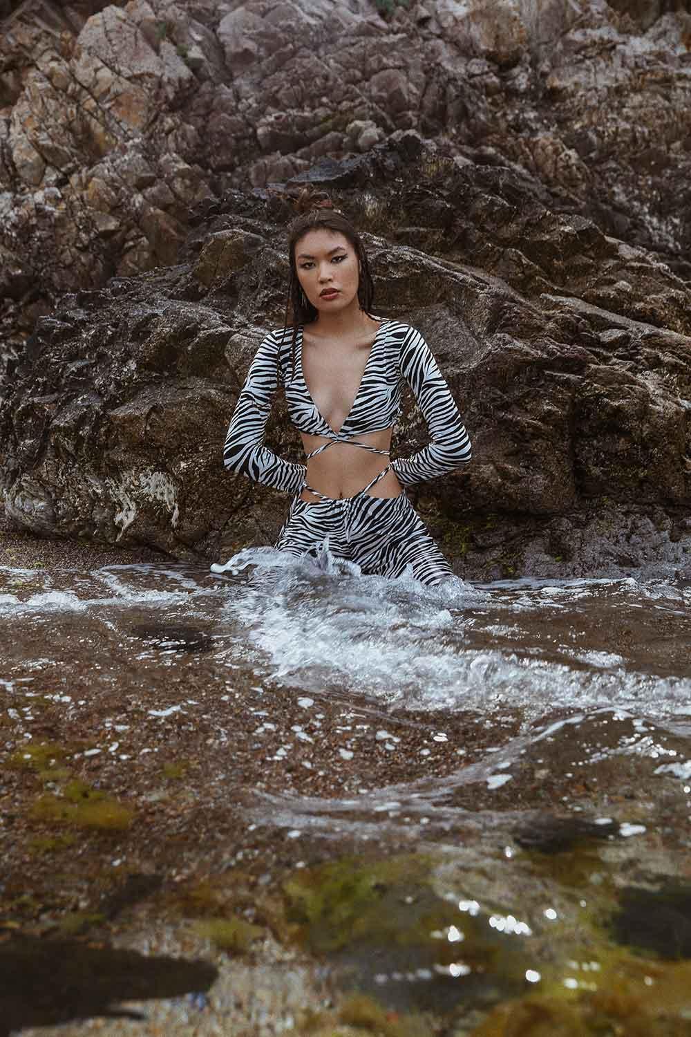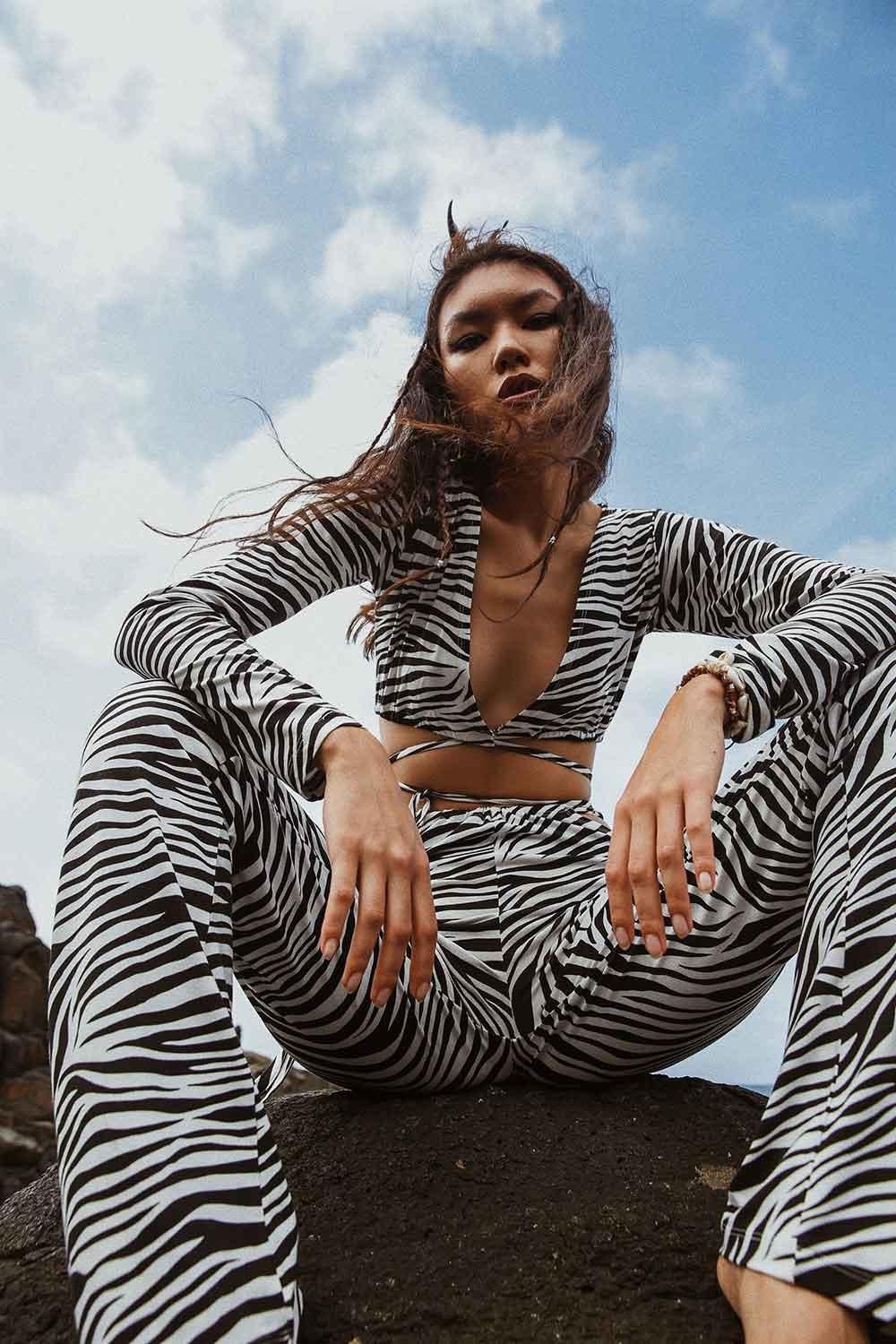 Uzun kollu önü bağcıklı zebra desenli crop. Dekolte açıklığı ayarlanabilirdir.