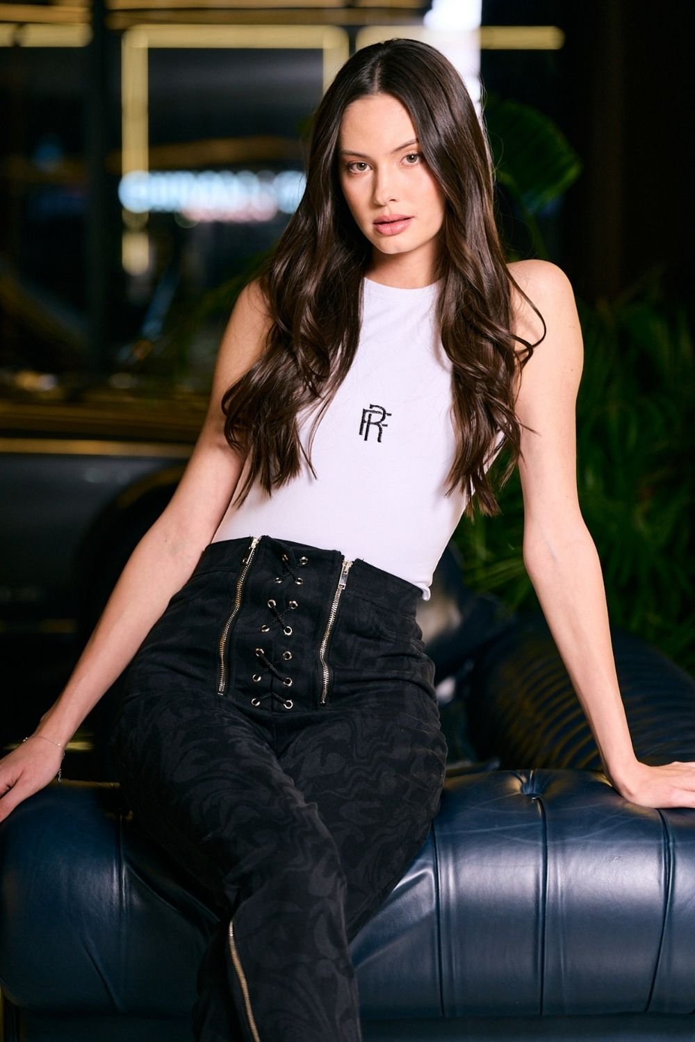 This white tank top stands out with its minimal design and elegant logo detail, offering a comfortable yet stylish choice for your everyday outfits.