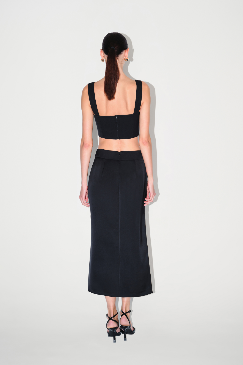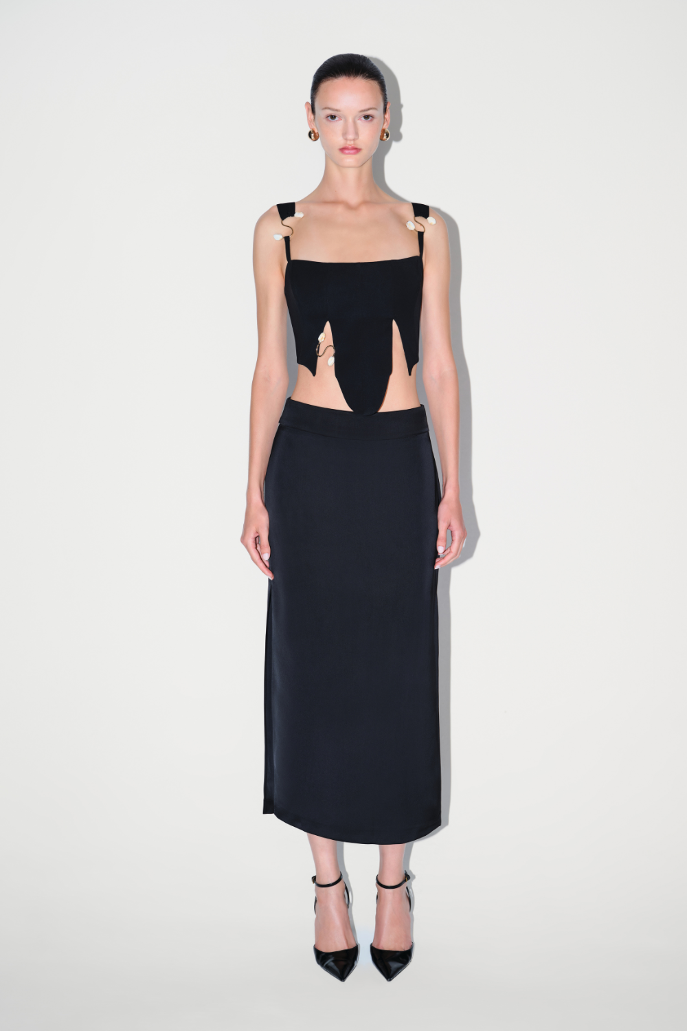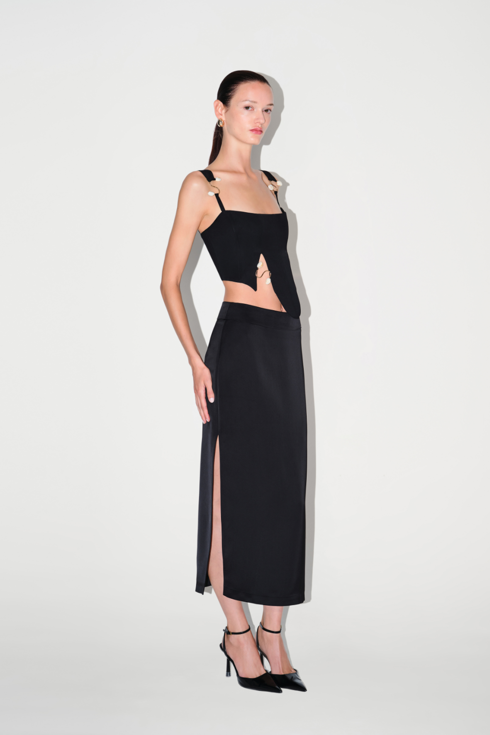 Amelia Korse, boncuklu aksesuar detaylarıyla zarif bir görünüm sunar. Kalıplı formu, öndeki yırtmaçlarla yumuşatılarak rahat bir hareket alanı yaratır.
