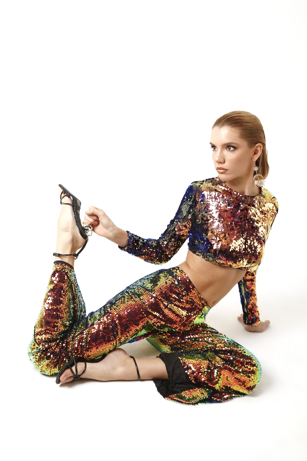 Renkli payetlerle süslenmiş kısa kesimli uzun bluzumuzla her adımda parlamaya hazır olun. Canlı, çok renkli payetler dinamik bir enerji katarken, modern crop kesimiyle cesur ve stil sahibi bir görünüm sunar. Gece dışarı çıkarken, partilerde ya da özel davetlerde tüm bakışları üzerinize çekecek bu parça; zarafetle eğlenceyi kusursuz bir şekilde buluşturur.
