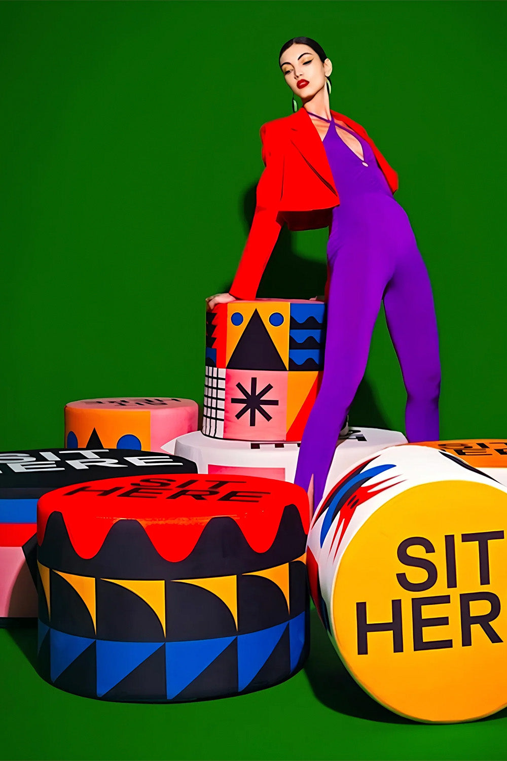 Marco Oggian tarafından tasarlanan bu puflar, çepeçevre eğlenceli desenlerle öne çıkıyor. Bunların üzerinde, insanları onları denemeye ve rahatlarının tadını çıkarmaya teşvik eden bir "BURAYA OTURUN" işareti bulacaksınız. Puf Oggian Ev Tasarımı Beyaz M'yi Keşfedin.
