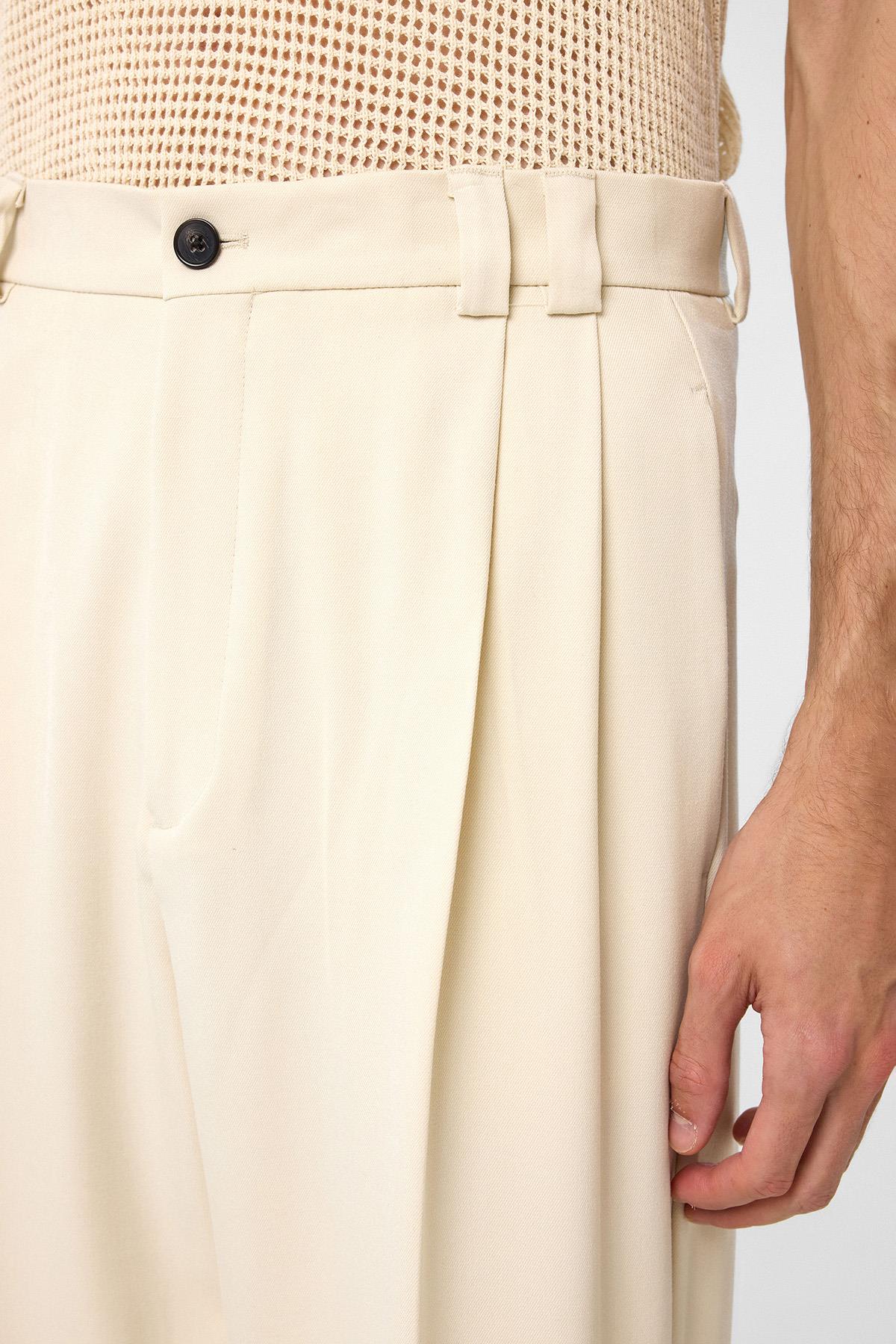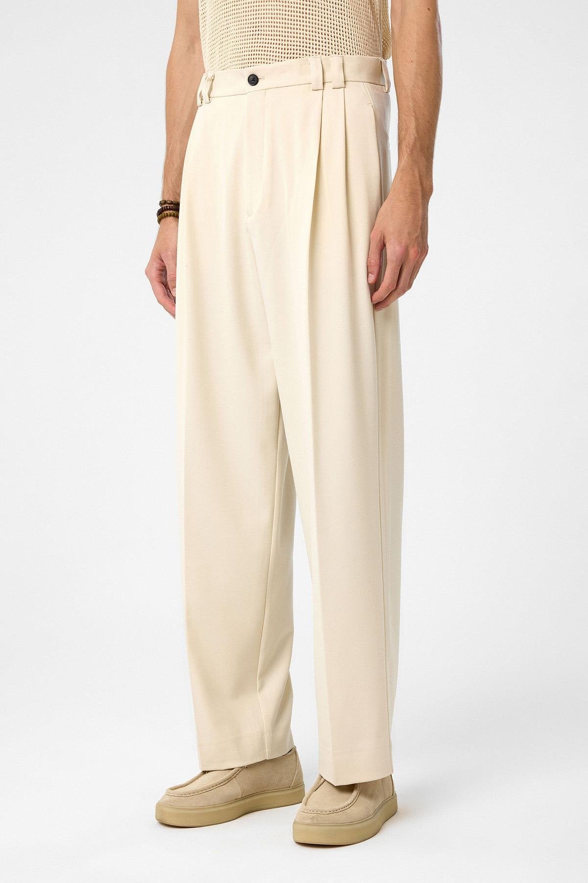 Ekru Yüksel Bel Relax Fit Pileli Erkek Pantolon