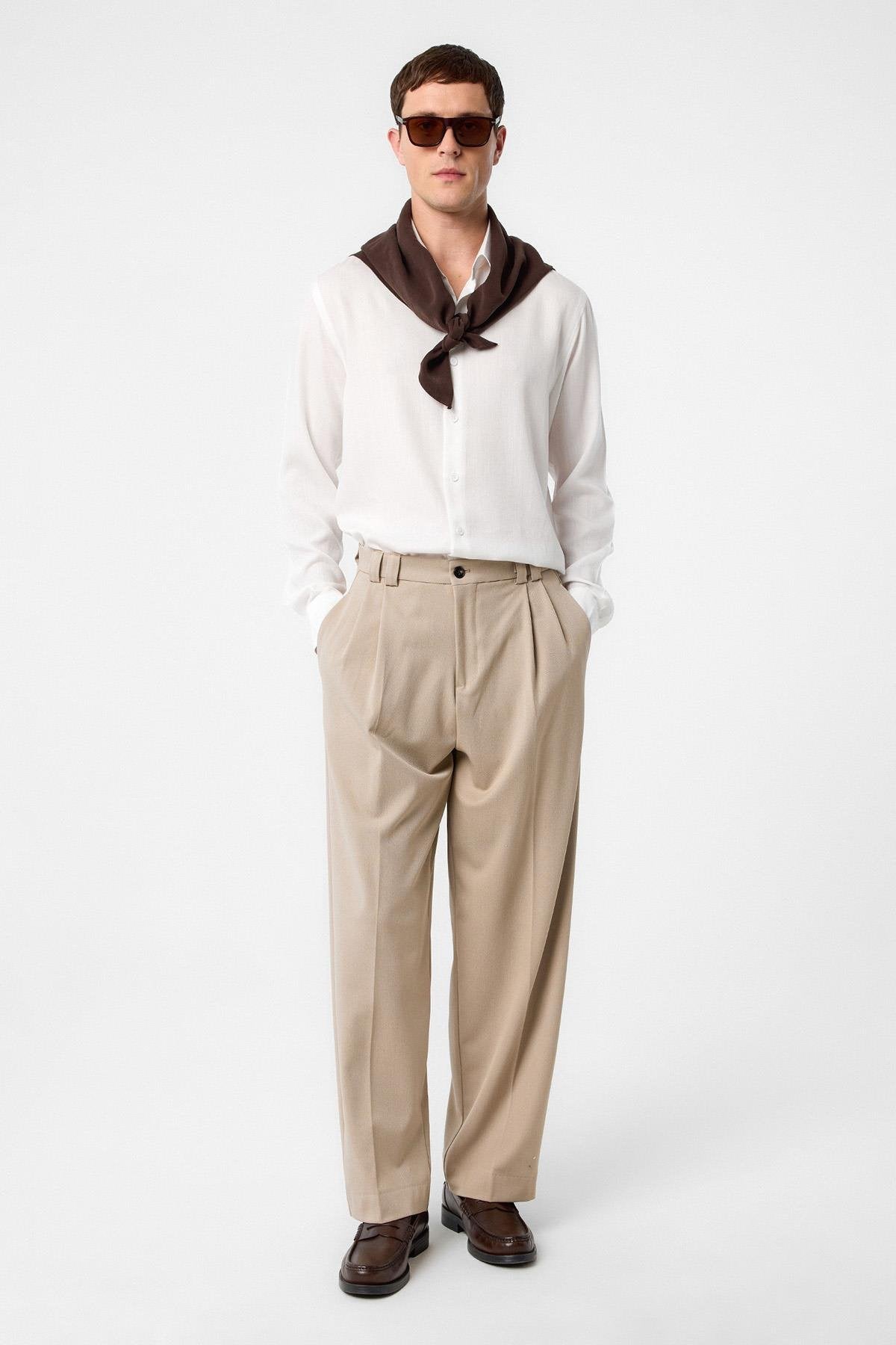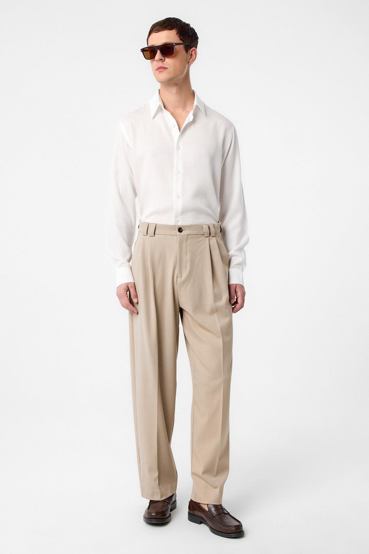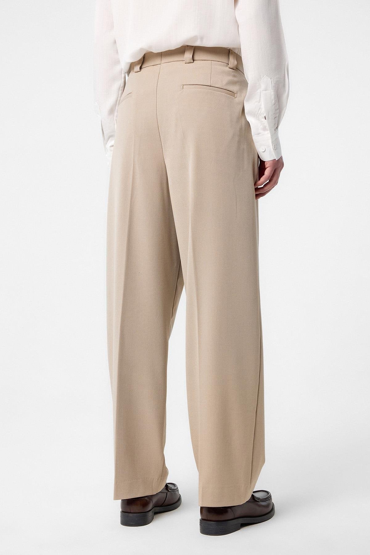 Koyu Bej Yüksel Bel Relax Fit Pileli Erkek Pantolon