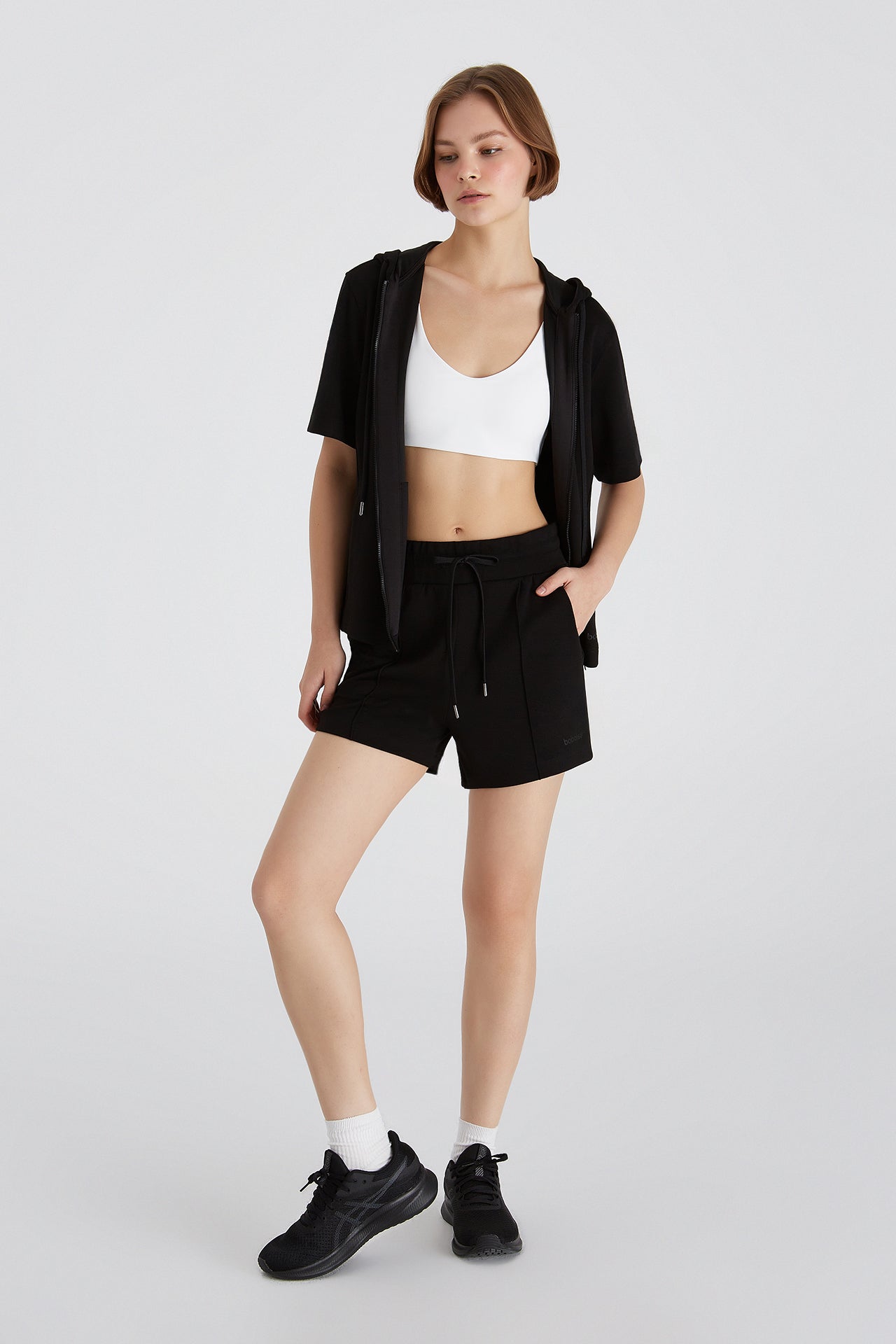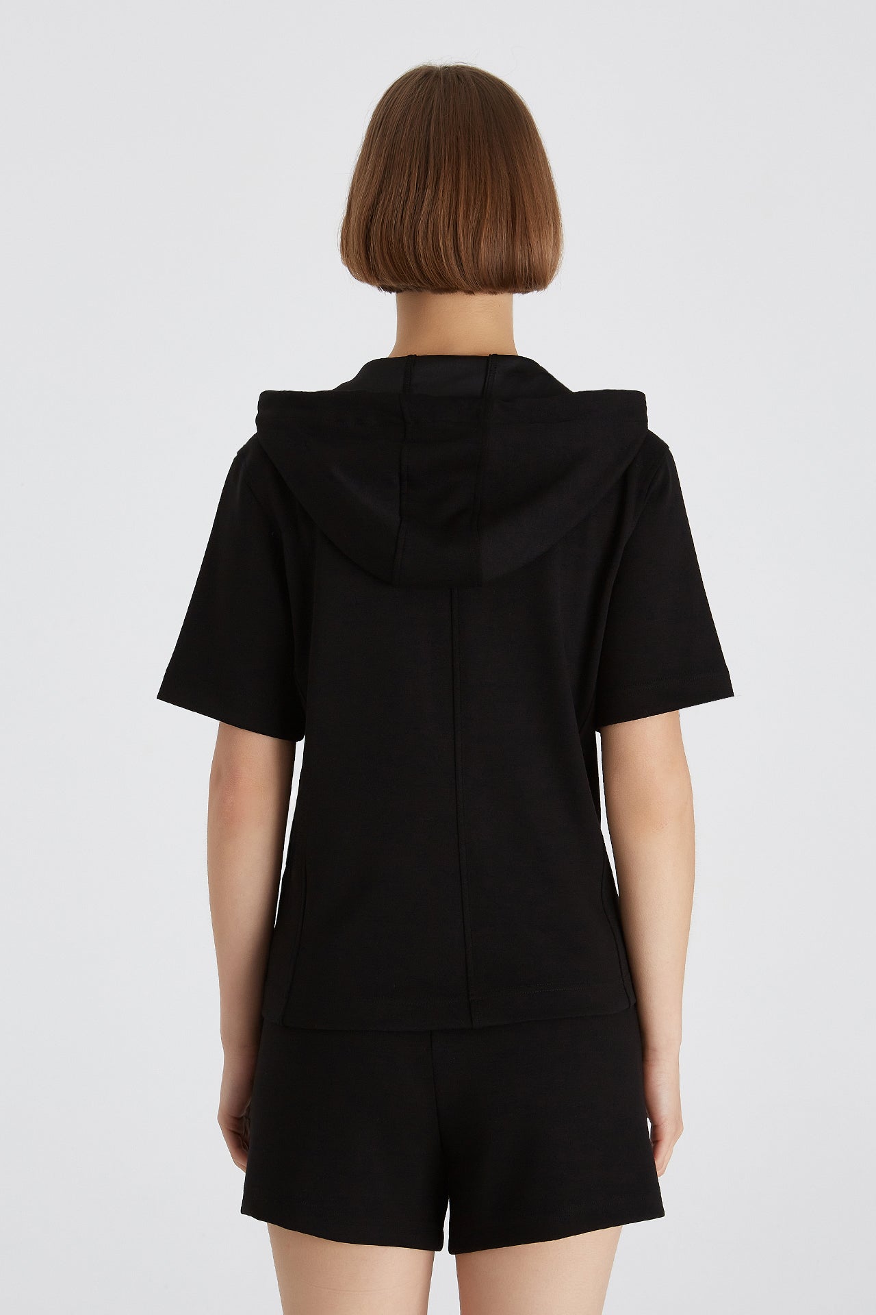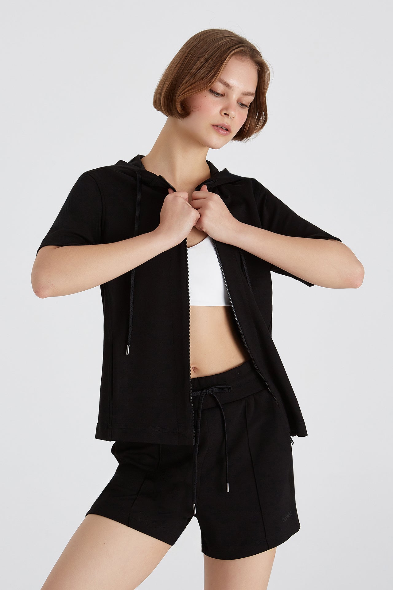 Stilinizi tamamlayacak hafif bir dokunuş! Yumuşak dokulu kumaşı ve rahat kesimiyle özgürce hareket etmenizi sağlarken, önü fermuarlı ve kısa kollu yapısıyla modern bir görünüm sağlıyor.