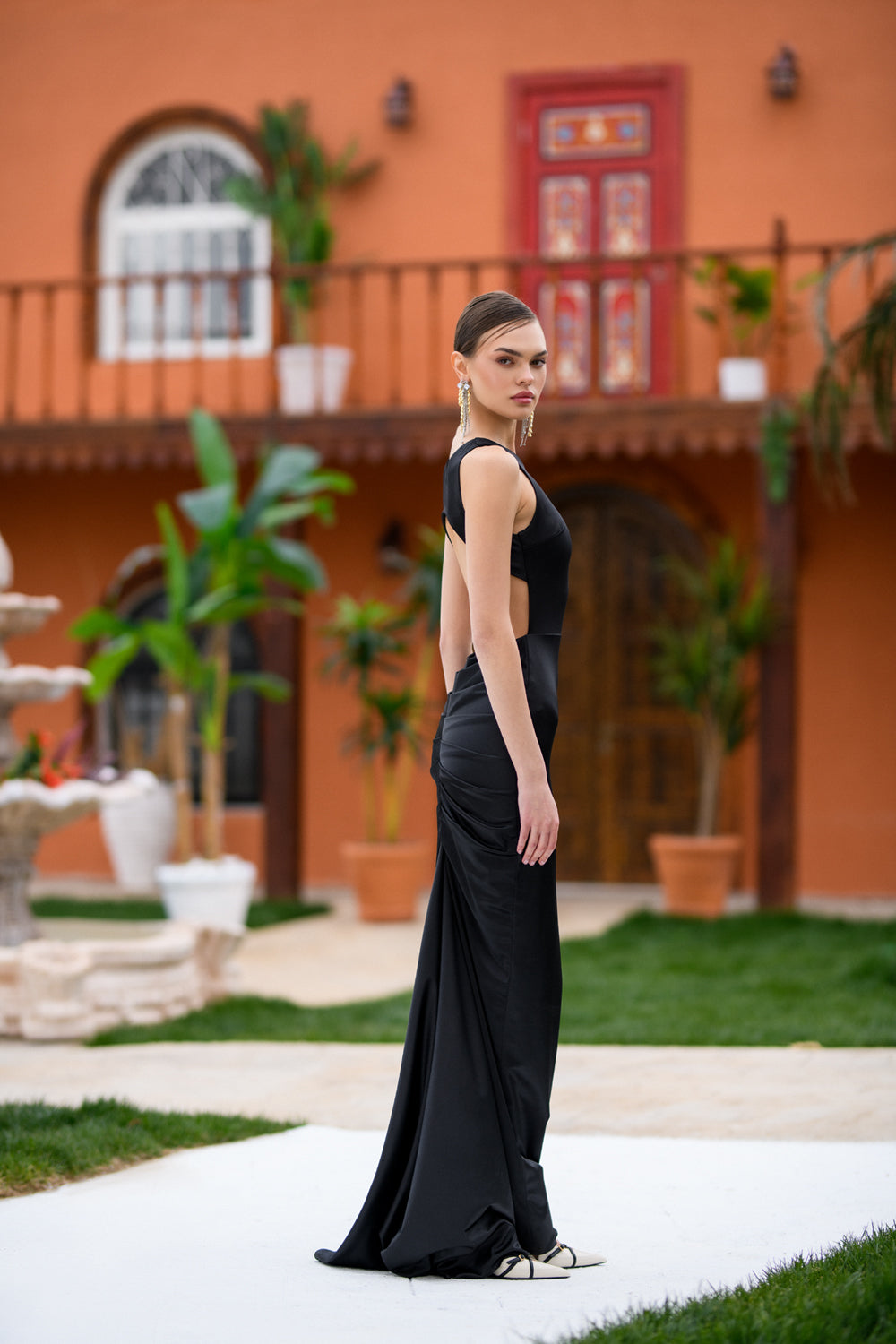 Siyah Saten Sırt Dekolteli Kuyruk Detaylı Uzun Elbise