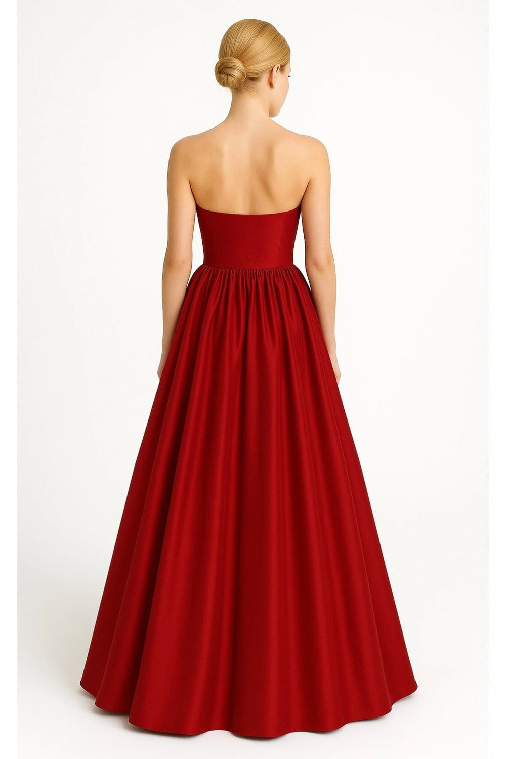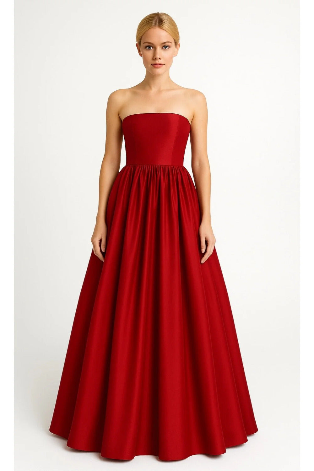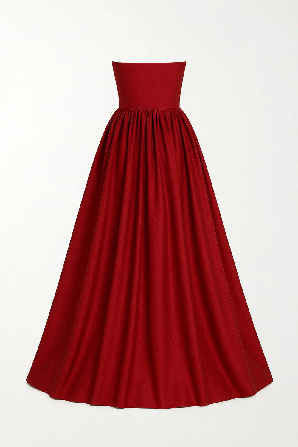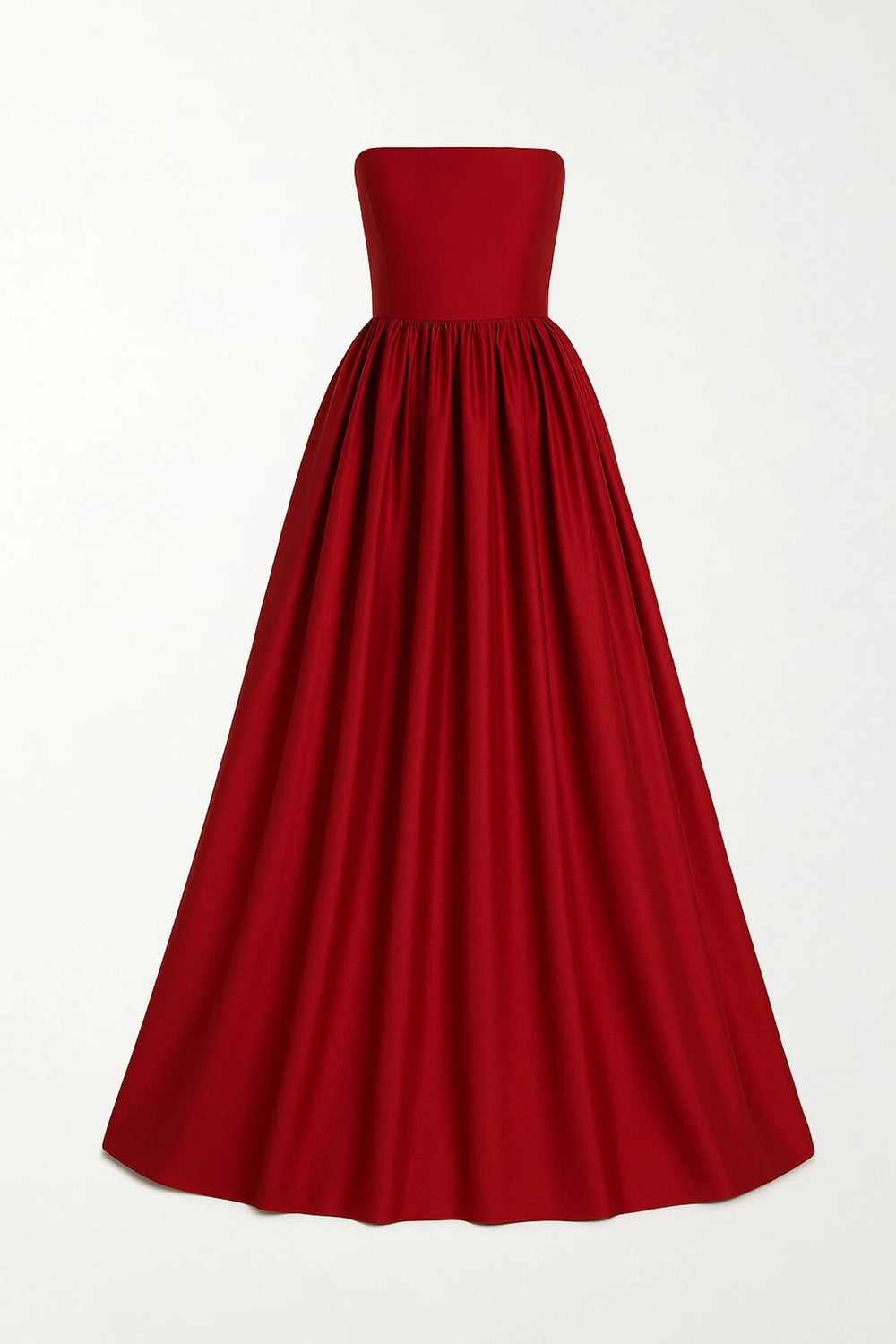 Büzgülü & Tam Daire Açılımlı Maxi Kırmızı Tafta Straplez Elbise