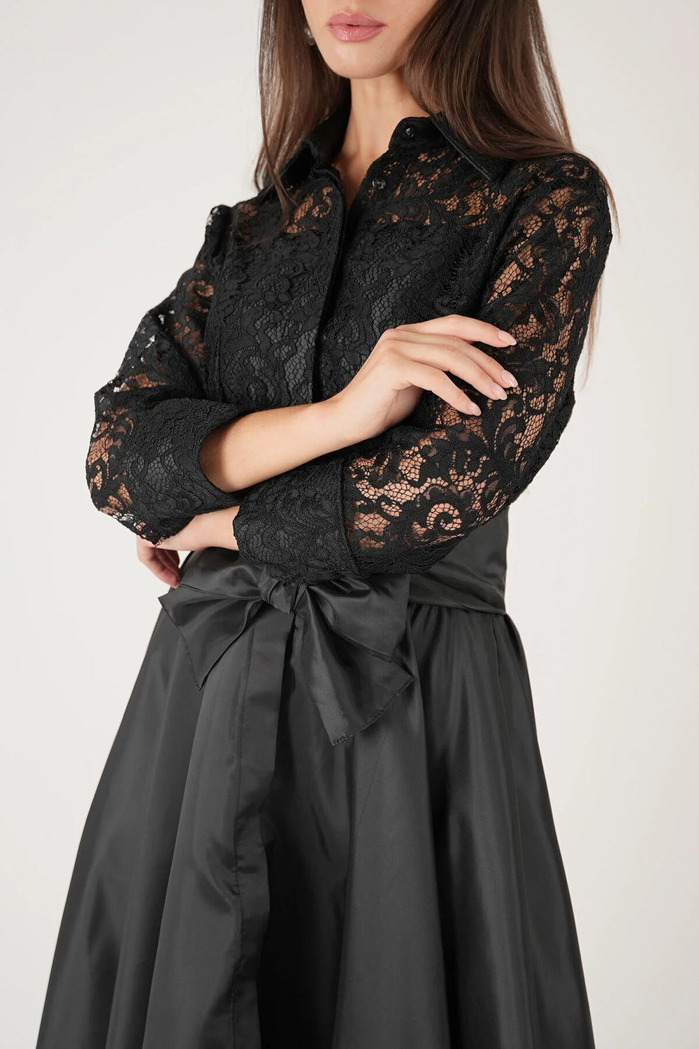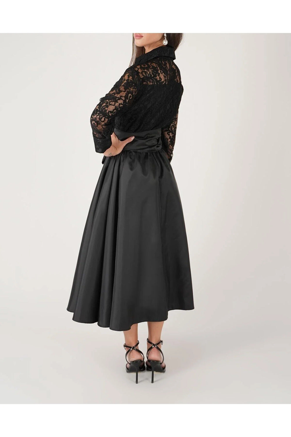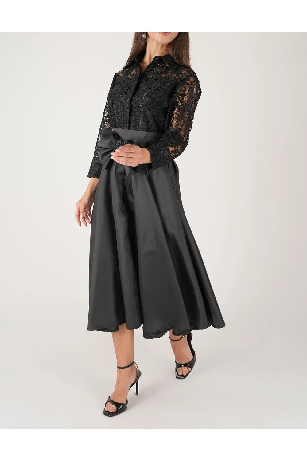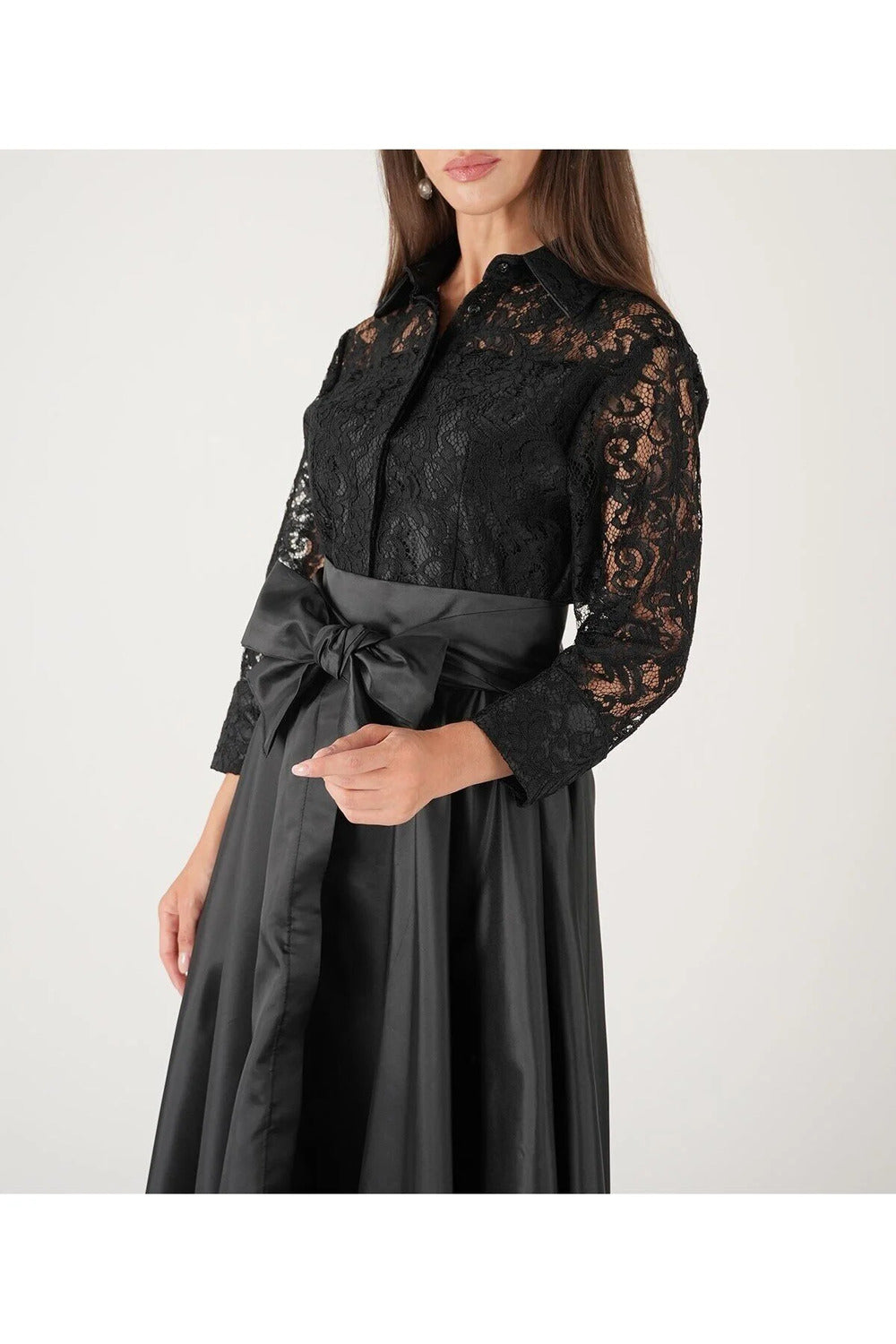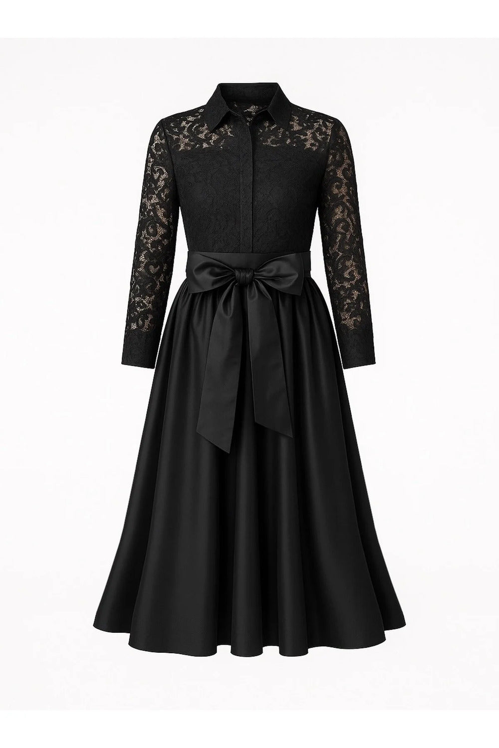Siyah Dantel Detaylı & Kuşaklı Midi Şık Gömlek Elbise