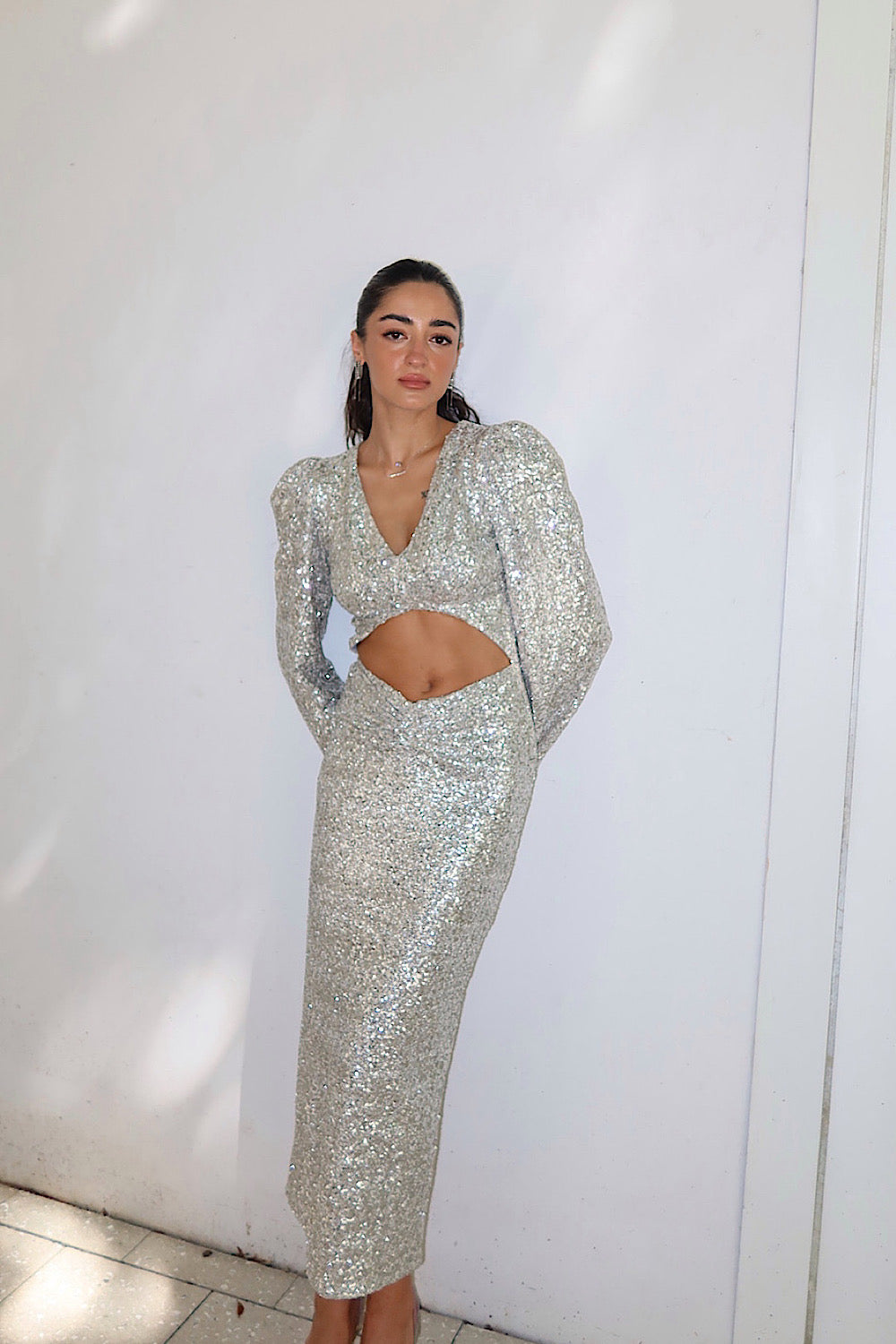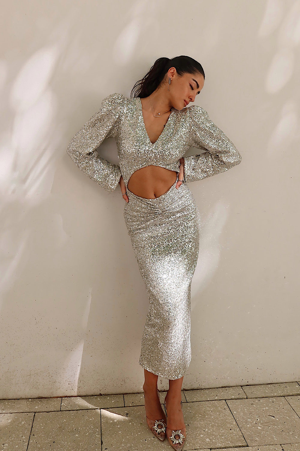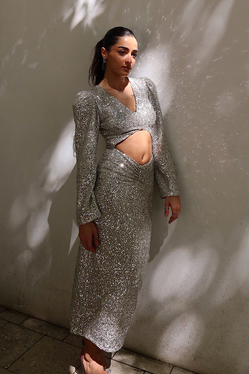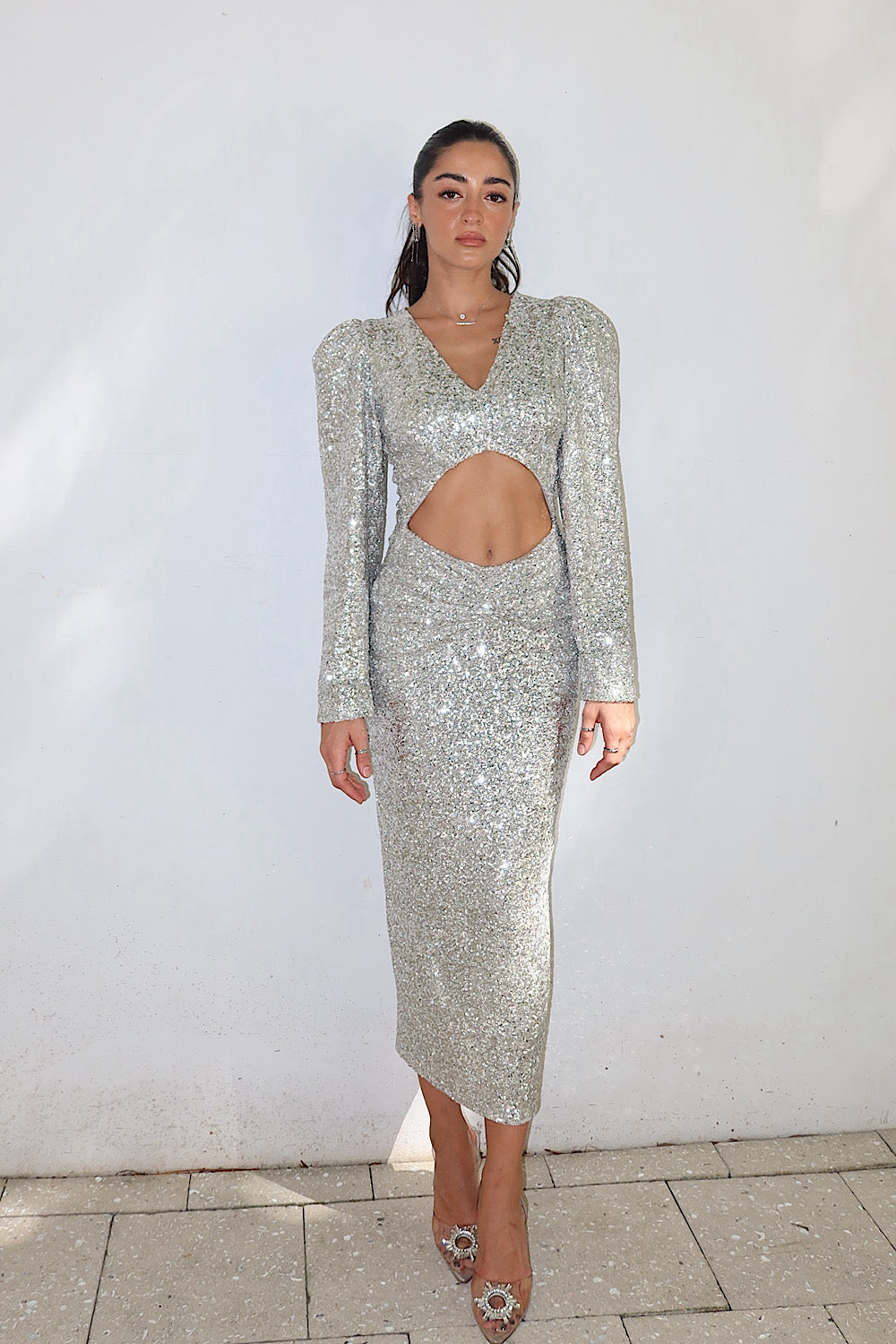 Kadın Parlak Gümüş Cut Out Pulpayet Davet Midi Vatkalı Elbise Abiye